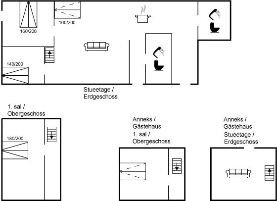 Er zijn in totaal 4 slaapkamers. De slaapplaatsen zijn als volgt verdeeld: 6 slaapplaatsen in tweepersoonsbedden. 4 slaapplaatsen in slaapbanken (tweepersoons). 2 van deze slaapplaatsen bevinden zich in de huiskamer, 2 bevinden zich in de bijgebouw.