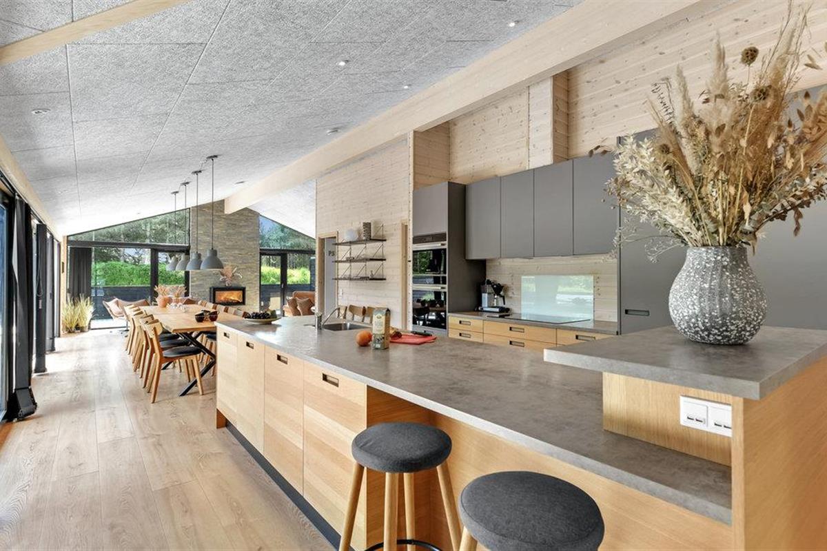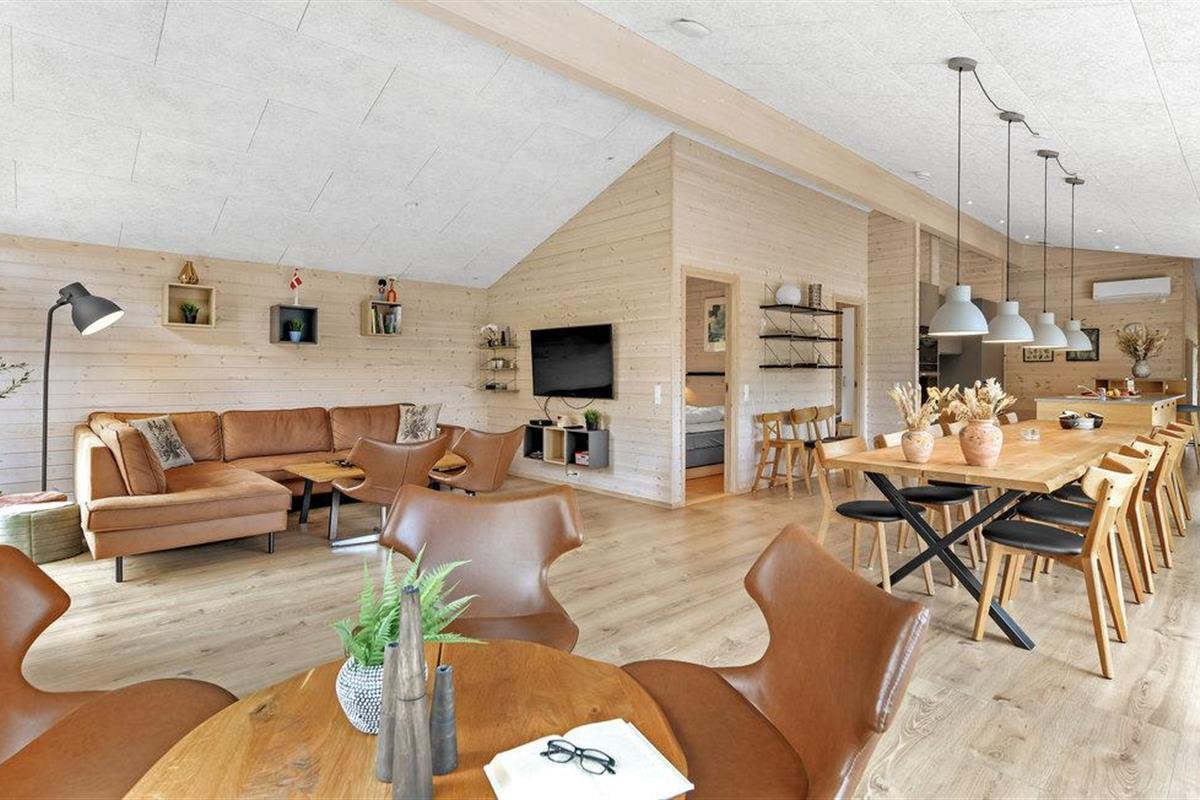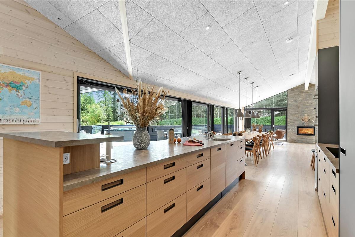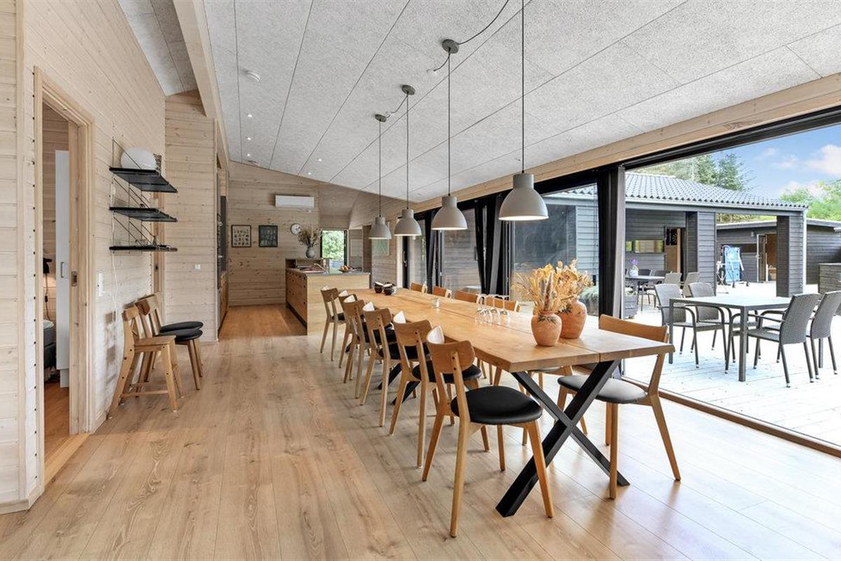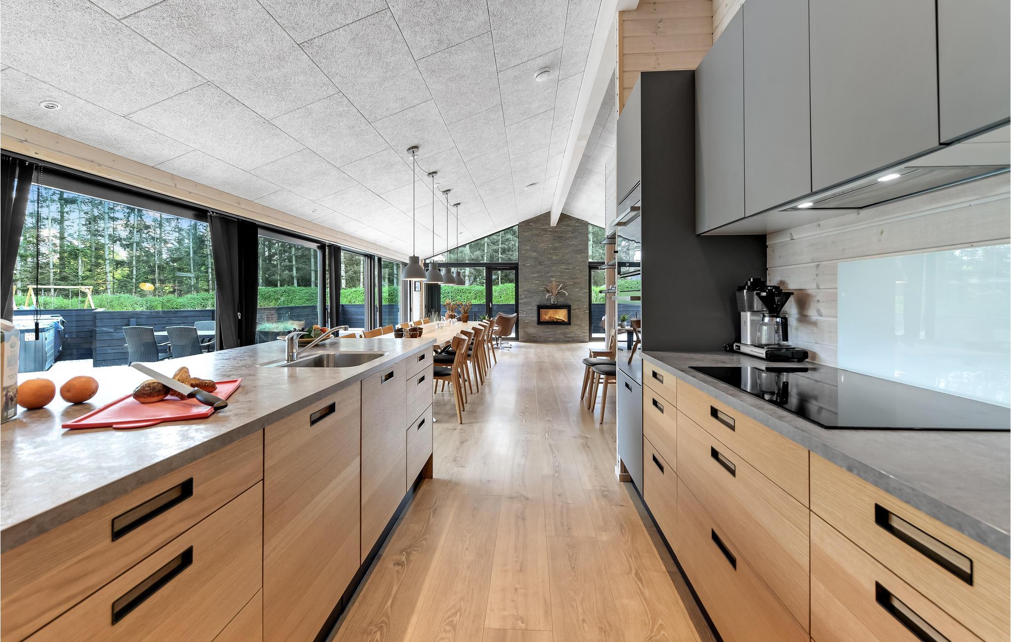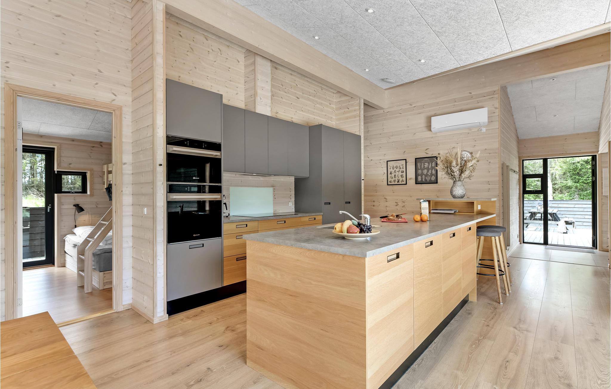 Hier vindt u een zeer aantrekkelijk vakantiehuis met ruimte voor meerdere gezinnen of een groter reisgezelschap. Het biedt een hoogwaardig interieur, moderne en comfortabele faciliteiten en vele, mooie details van hout, die samen de ideale voorwaarden scheppen voor een ontspannende vakantie. Breng gezellige avonden door in de aangename sfeer van de woonkamer en verwarm uzelf voor de bio-open haard in het koele seizoen. Vanuit de woonkamer en vanuit elke slaapkamer heeft u toegang tot het terras.