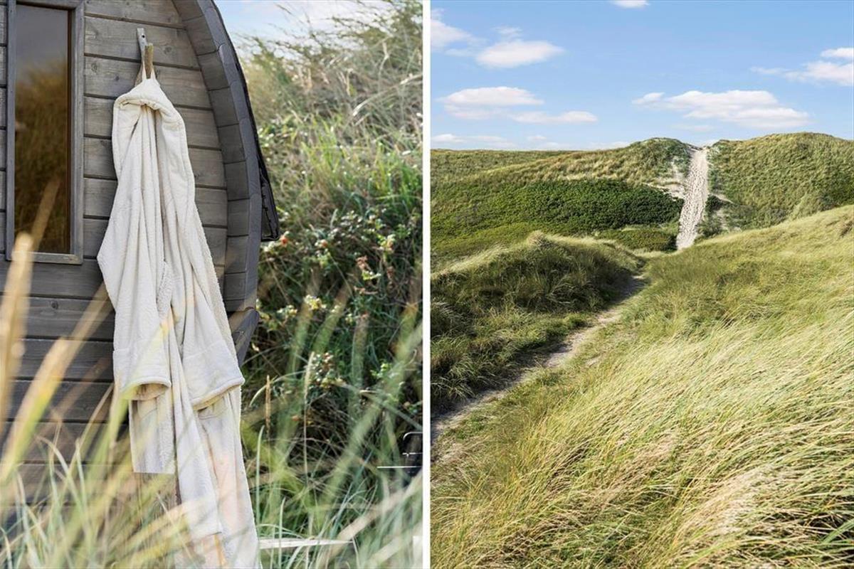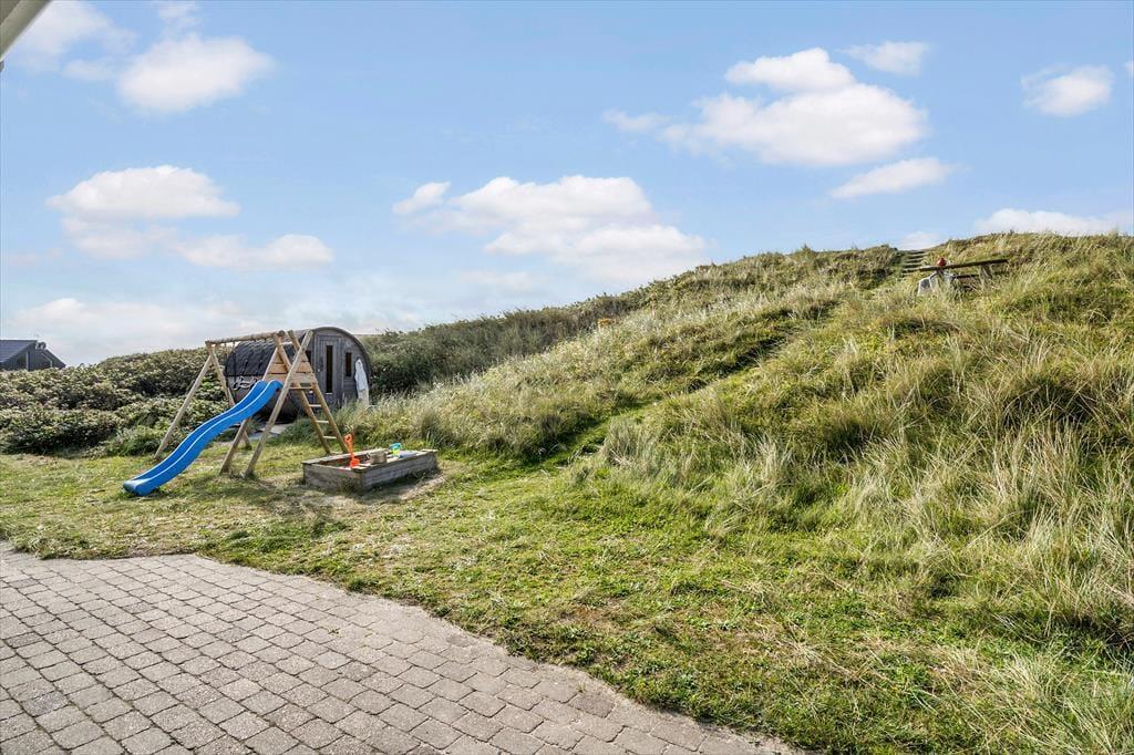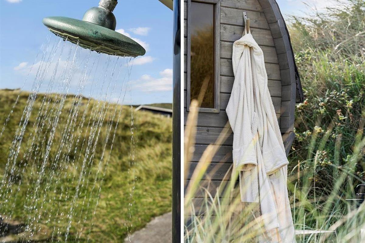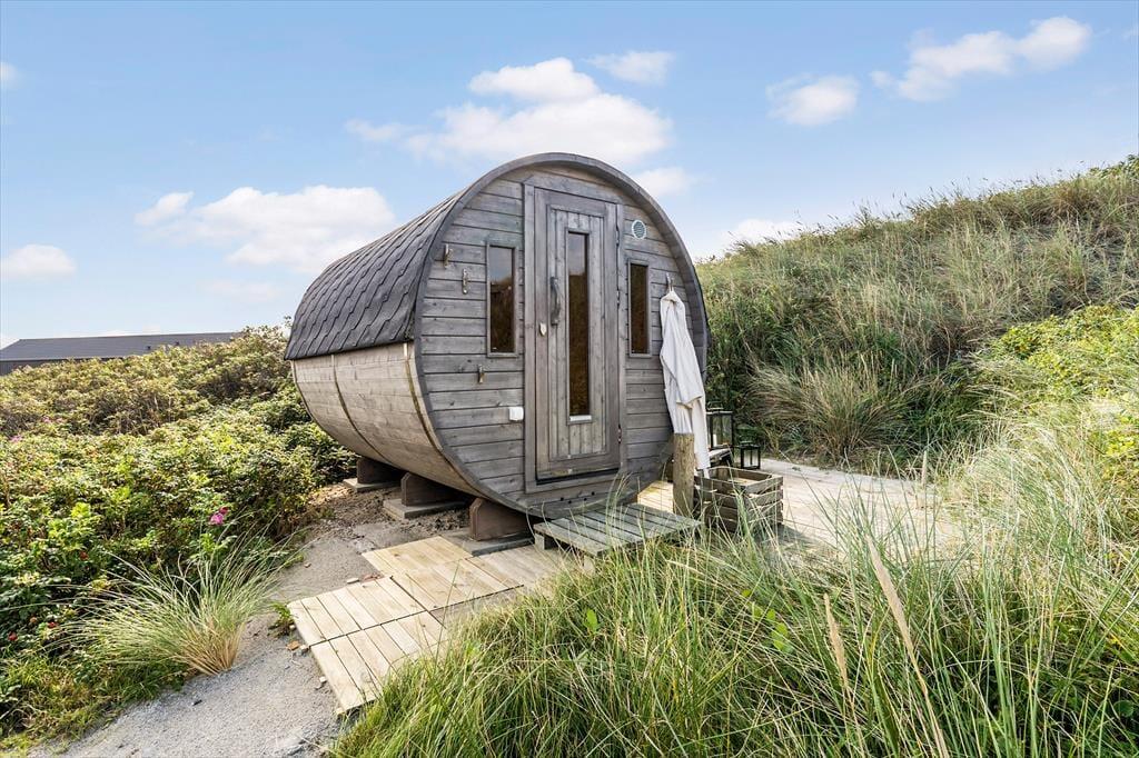 Die Terrassen gen Südosten und Südwesten bieten Ihnen optimale Bedingungen, warme Sommertage in der Sonne zu verleben. Die jüngsten Urlauber dürfen sich auf eine Schaukel und eine Sandkiste freuen. Begeistern werden Sie die Außendusche und die Saunatonne mit Platz für alle Mitreisenden. Auf der Düne des Grundstücks eröffnet sich Ihnen ein reizvoller Ausblick über die Umgebung und den Ringkøbing Fjord. Auf der Düne werden Sie Zeuge fantastischer Sonnenauf- und Sonnenuntergänge.