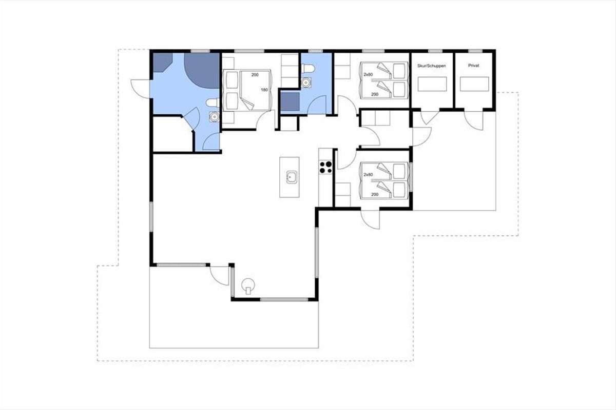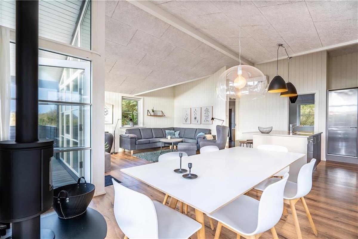 Das Ferienhaus ist mit drei Schlafzimmern ausgestattet, welche zusammen Platz für sechs Personen bieten. Das Badezimmer ist mit einer Dusche, einem Whirlpool und einer Sauna ausgestattet und bietet dadurch einen hervorragenden Wellness-Faktor. Neben der Eingangshalle verfügt der Rest des Hauses über einen offenen Wohnbereich, in dem Küche und Wohnzimmer zu einer Einheit verschmelzen, so dass Sie die idealen Voraussetzungen haben, um Ihren Urlaub in trauter Zweisamkeit zu genießen. Die Küche ist angenehm eingerichtet und an der Kücheninsel kann man ein Glas Wein genießen und dem Koch ein paar Tipps geben. Die Mahlzeiten werden gemütlich am Esstisch serviert, wo der Holzofen für Wärme sorgt. Das Wohnzimmer ist mit einer gemütlichen Sofalandschaft ausgestattet, und die Wärmepumpe, die Akustikdecken bis an die raumhohen Fenster sorgen für eine angenehme Atmosphäre.