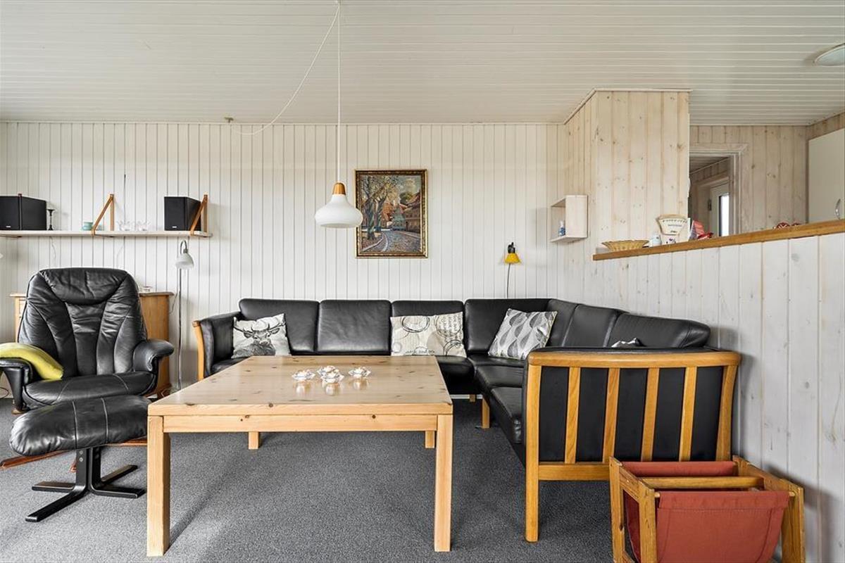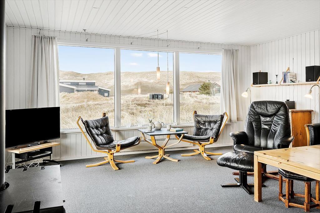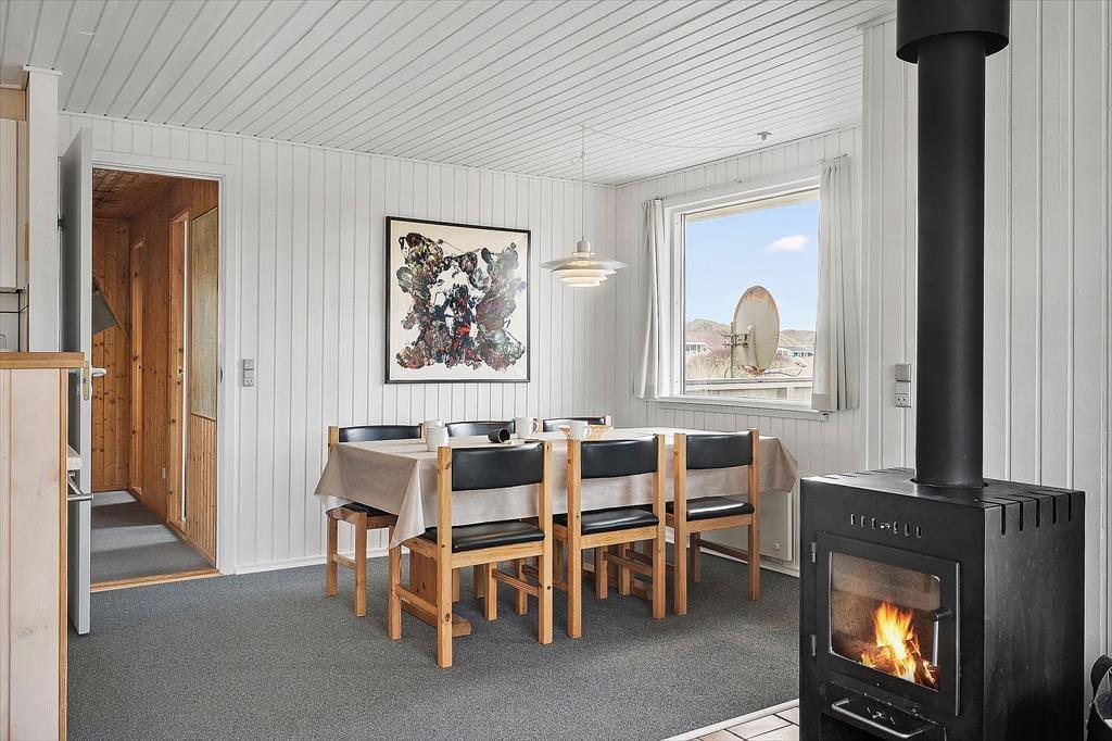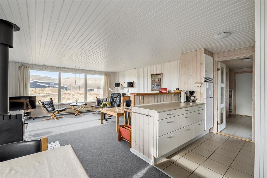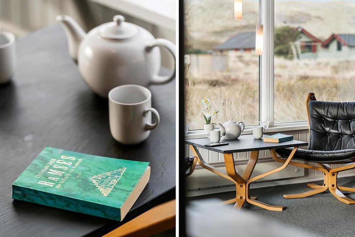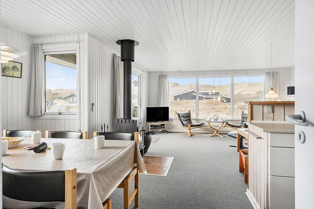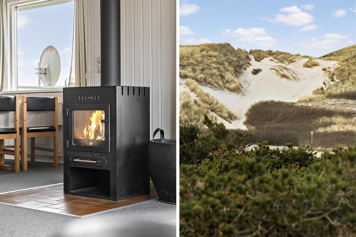 Das Ferienhaus ist traditionell eingerichtet und hat ein großes Wohnzimmer, mit dem die Küche verbunden ist. Die Küche ist hell und praktisch und u. a. mit einer Spülmaschine ausgestattet. Wegen der großen Fensterpartie im Wohnzimmer haben Sie Ausblick auf die Dünen und die schöne Natur, die das Ferienhaus umgibt. Im Wohnzimmer sind eine Sofagruppe, ein Esszimmer, ein gusseiserner Kamin, Flachbildfernseher mit Satellitenprogrammen und ein DVD-Player.