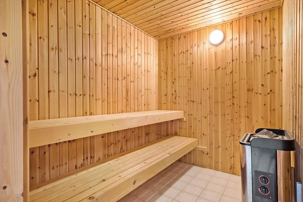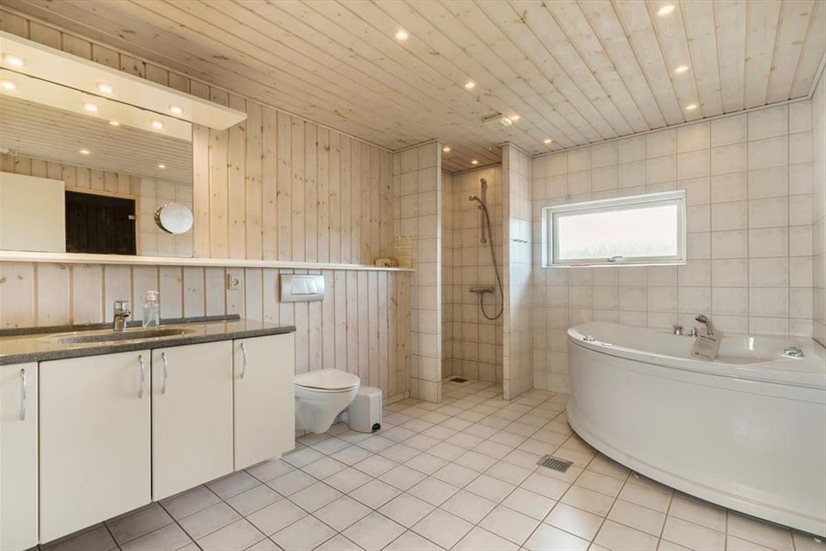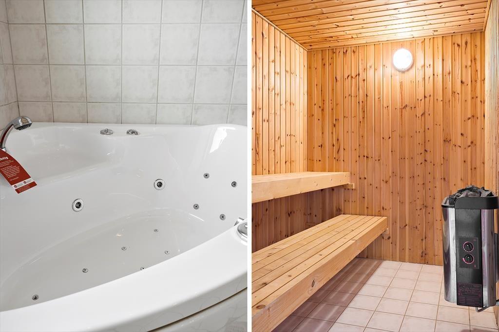 Hier gibt es zwei gute geflieste Badezimmer. Das größte hat einen Whirlpool und eine leckere Sauna. In dem anderen befinden sich eine Dusche und eine Toilette. Insgesamt gibt es drei Schlafzimmer, wovon zwei mit jeweils einem Doppelbett und eins mit 2 Einzelbetten. In der Waschküche sind eine Spüle und eine Waschmaschine sowie ein Trockner vorhanden.