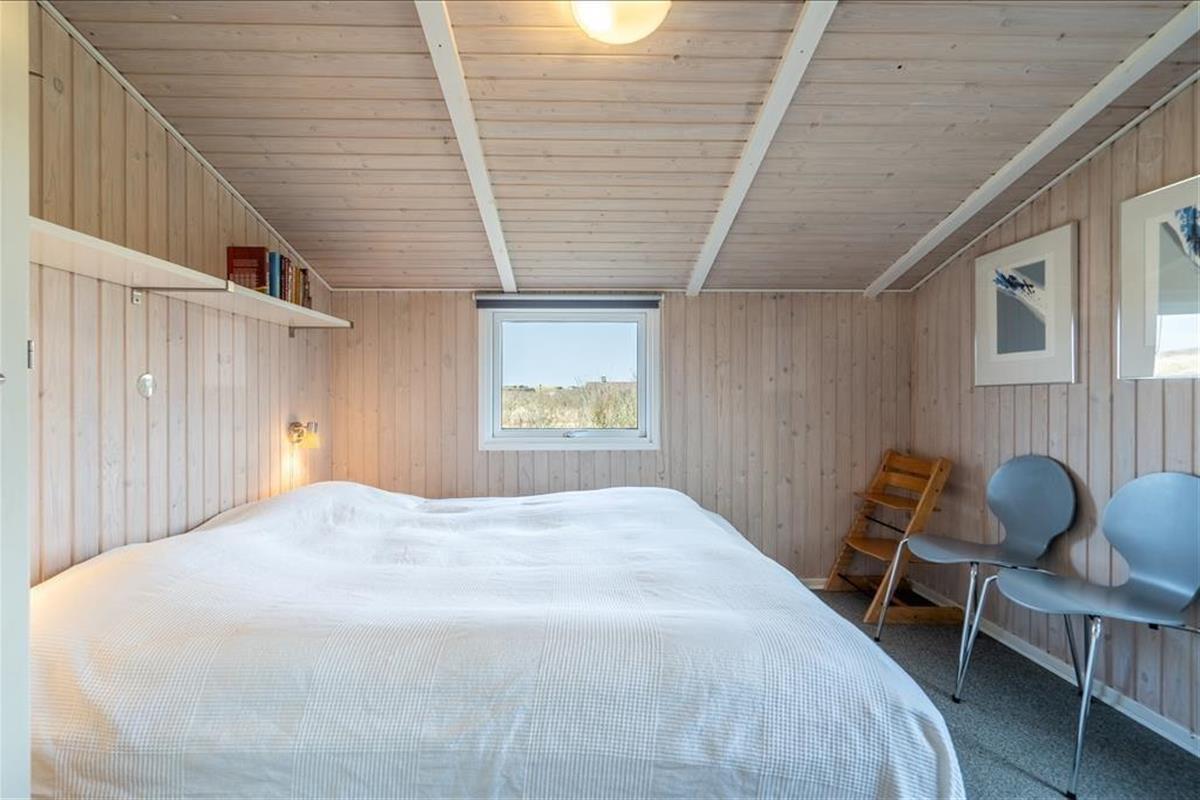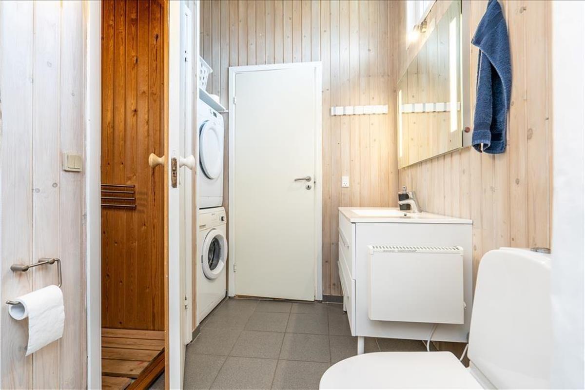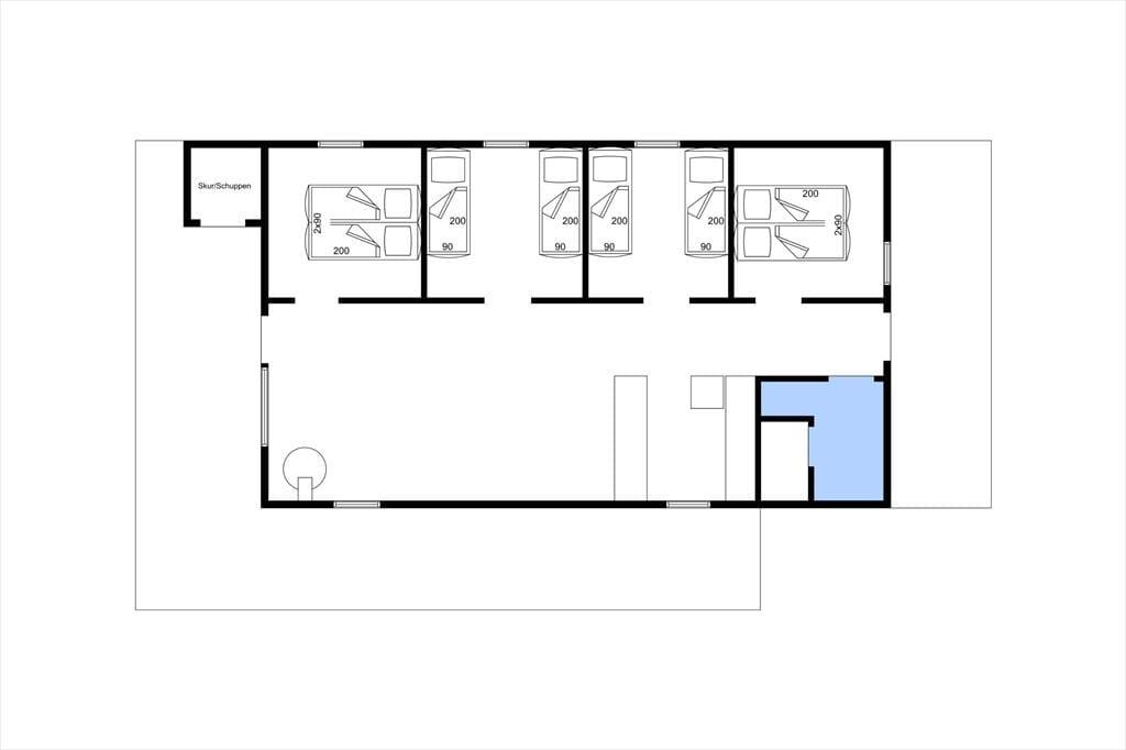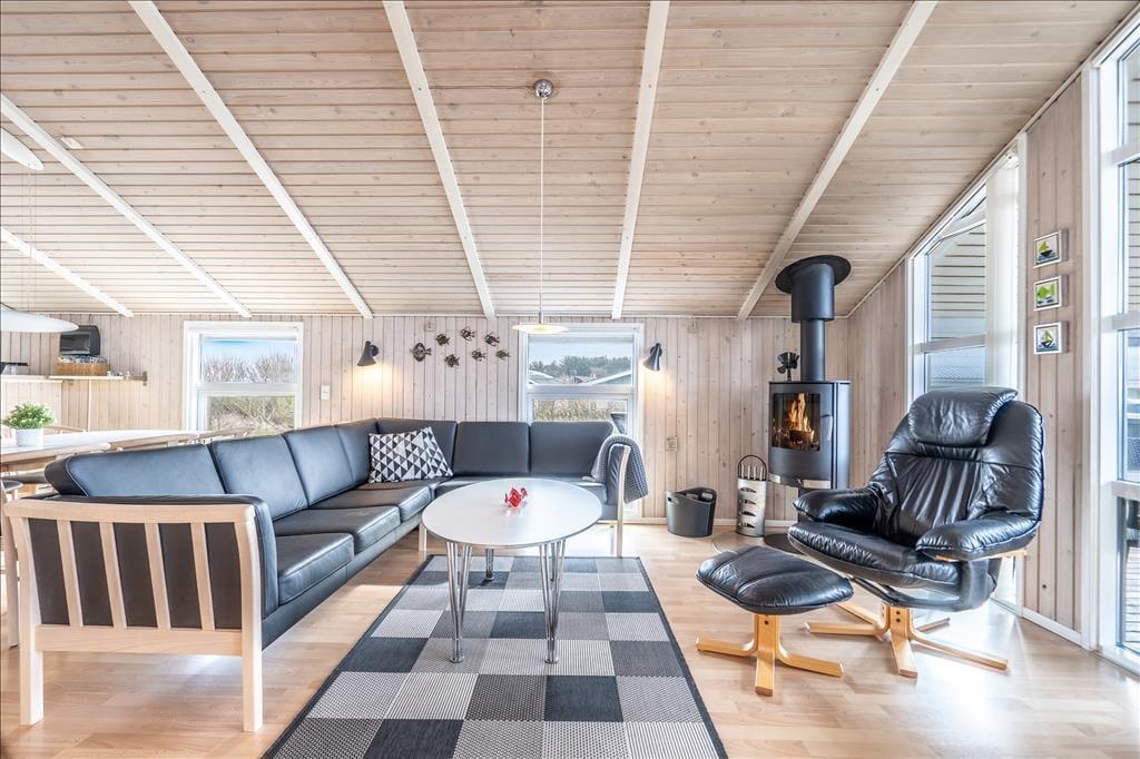 Das Sommerhaus ist mit vier guten Schlafzimmern ausgestattet, die einigen von Ihnen zusammen die Möglichkeit eines Privatzimmers bieten. Die Zimmer befinden sich alle an der Nordseite des Hauses, und so hat der Wohnbereich, in dem Küche und Wohnzimmer ineinander übergehen, große Fenster nach Süden und Westen, die viel Licht hereinlassen. Gleichzeitig ermöglichen die gestaffelten Dachflächen Oberlichter, die Ihren Urlaub hell und luftig gestalten. Die Küche ist hell und schön eingerichtet, und der Geschirrspüler macht die Reinigung einfach und bequem. Das Wohnzimmer ist mit einer Essecke und einer Sofagruppe ausgestattet, wo Sie fernsehen oder die Aussicht auf die Natur genießen können, während der Holzofen wärmt. Das Ferienhaus ist mit einem Badezimmer mit Waschbecken, Fußbodenheizung, Dusche und Sauna ausgestattet.