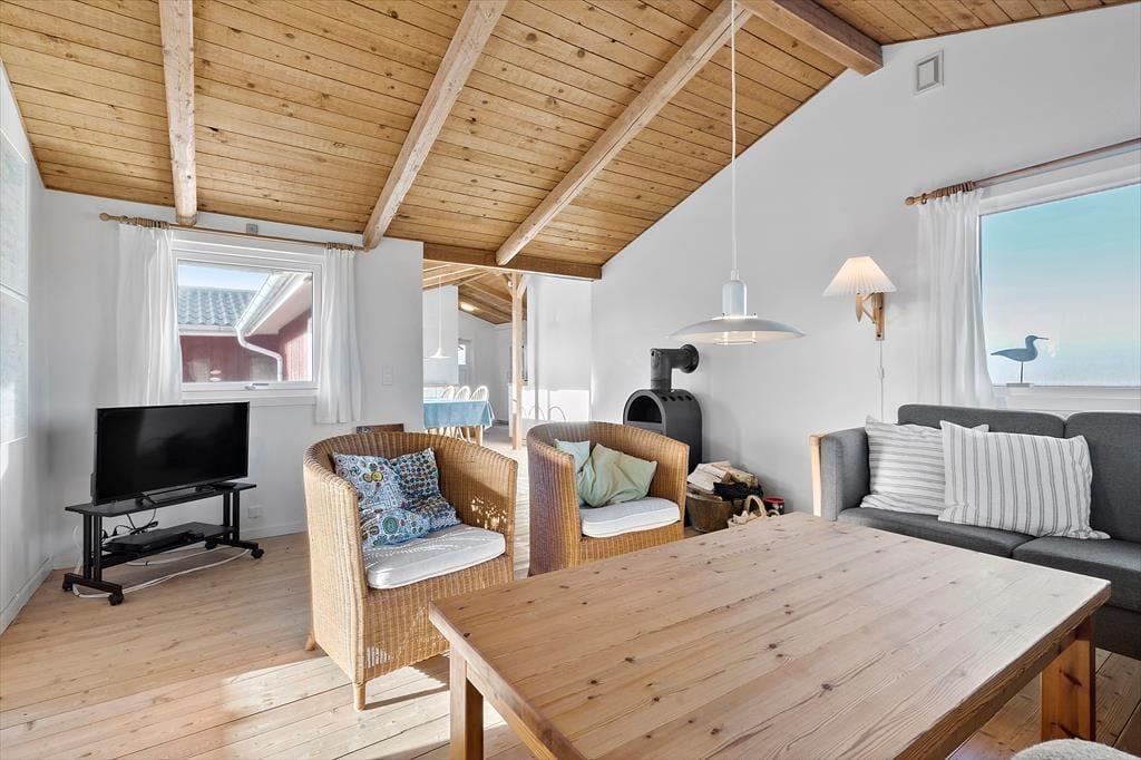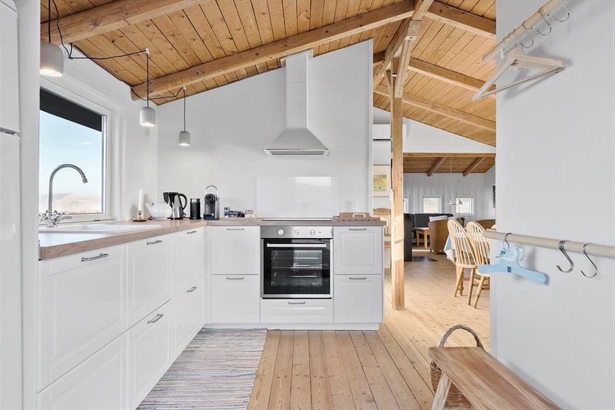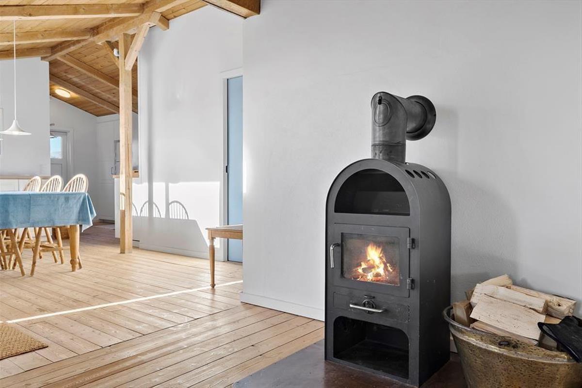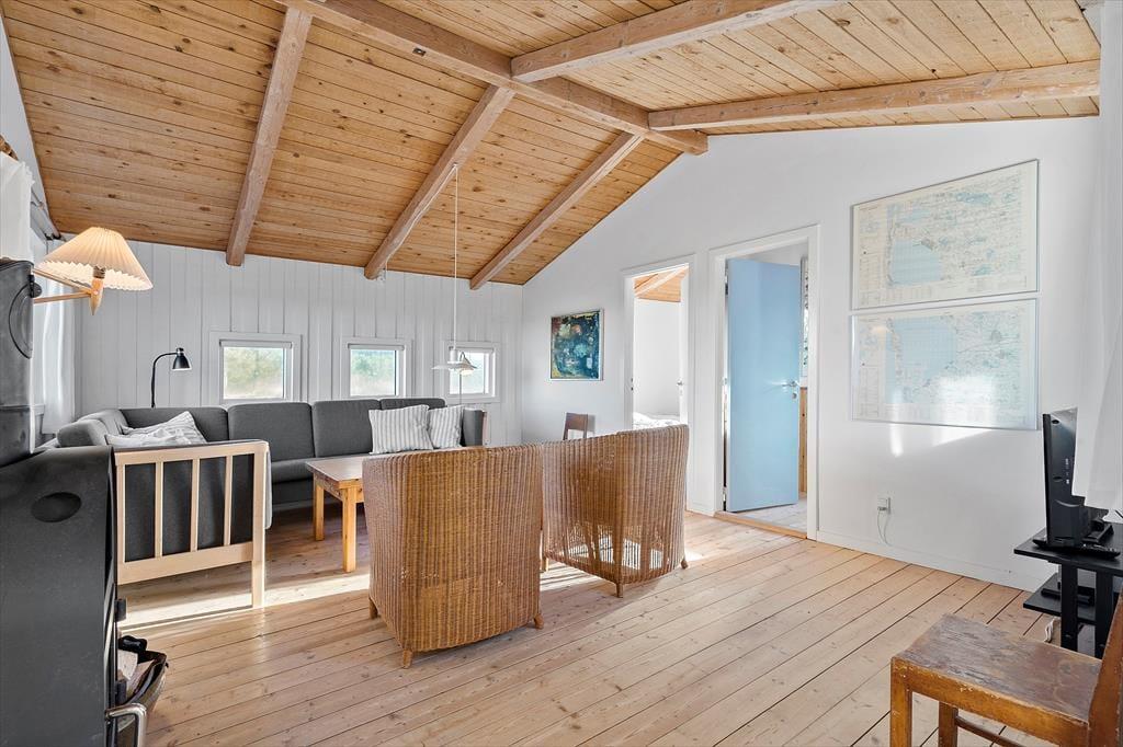 Das Urlaubsdomizil überzeugt mit seiner wohldurchdachten Raumaufteilung. Zwei Schlafzimmer sind an einem Ende des Hauses platziert, das dritte am anderen Ende. Insgesamt sind sechs Schlafplätze vorhanden. Außerdem ein schönes Badezimmer mit Dusche und Waschgelegenheit. Der Rest der Wohnfläche ist dem großen, offenen Aufenthaltsbereich überlassen, der sich aus der Küche und dem Wohnraum zusammensetzt. Schräge Holzdecken mit sichtbaren Balken und schöne Holzfußböden verleihen rustikalen Charme, den Sie am Esstisch und in der Polstersitzecke genießen. Wunderbar untermalt wird das stimmungsvolle Ambiente vom Knistern des Kaminofens. Das Haus verfügt über eine neue und gut ausgestattete Küche mit allem, was Sie zum Zubereiten herrlicher Mahlzeiten benötigen.Der schöne Stil der Küche fügt sich perfekt in das Ganze ein und Sie können von hier aus einen herrlichen Blick in die Natur genießen.