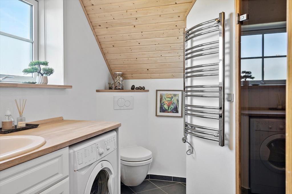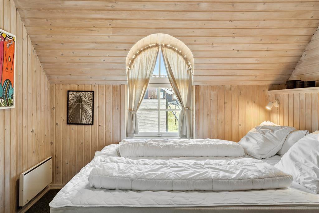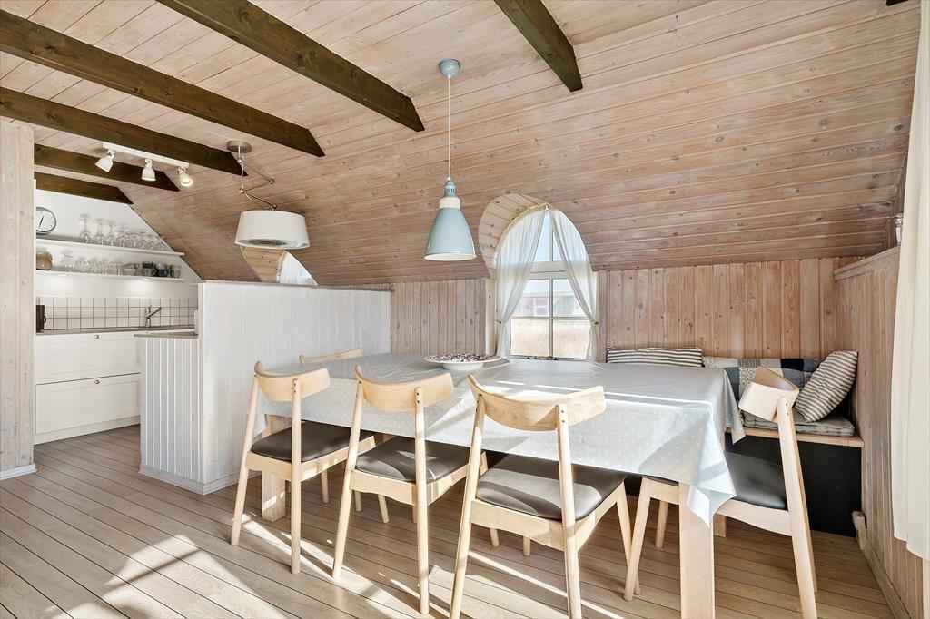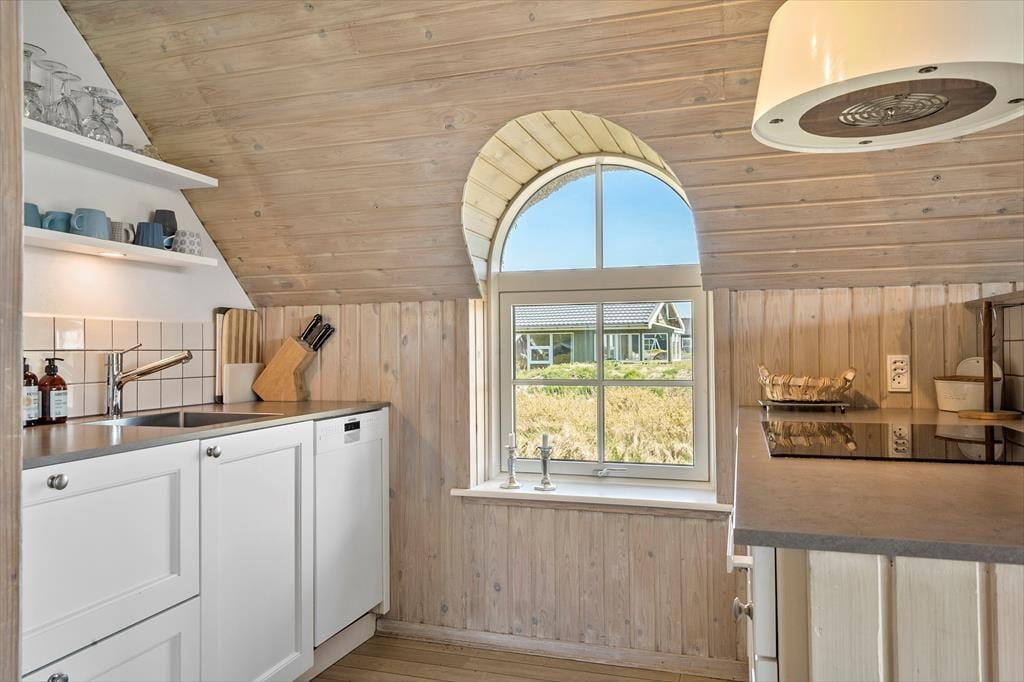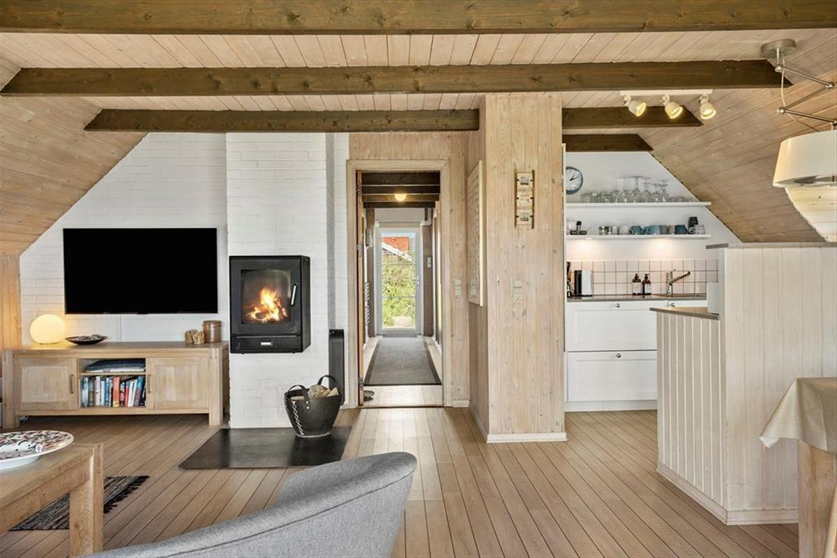 Bereits von Außen wirkt das rote Steinhaus mit seinen runden Sprossenfenstern und dem idyllischen Reetdach schön und stimmungsvoll. Dieser Eindruck setzt sich unvermindert im Hausinneren fort. Im Aufenthaltsbereich sorgen die holzvertäfelten, schrägen Decken, die offene Balkenlage und die Holzwände für eine wunderschöne Wohnatmosphäre. In Kombination mit dem Tageslichteinfall und der Aussicht erwartet Sie ein überaus stimmungsvoller Rahmen für erholsame Urlaubstage. Die offene Küche fügt sich harmonisch in den Aufenthaltsbereich ein. Ihre Mahlzeiten servieren Sie am gemütlichen Esstisch, an dem Sie am Abend gemeinsam Brettspiele spielen können. Der Kaminofen sorgt für ein Maximum an Gemütlichkeit, während Sie entspannte Stunden mit einem guten Film oder einem spannenden Buch auf der schönen Polstersitzgarnitur genießen. Die Schlafräume weisen eine gute Größe auf. Der Rest der Wohnfläche ist dem tollen Badezimmer mit einer Sauna, einer Duschnische und einer Waschmaschine überlassen.