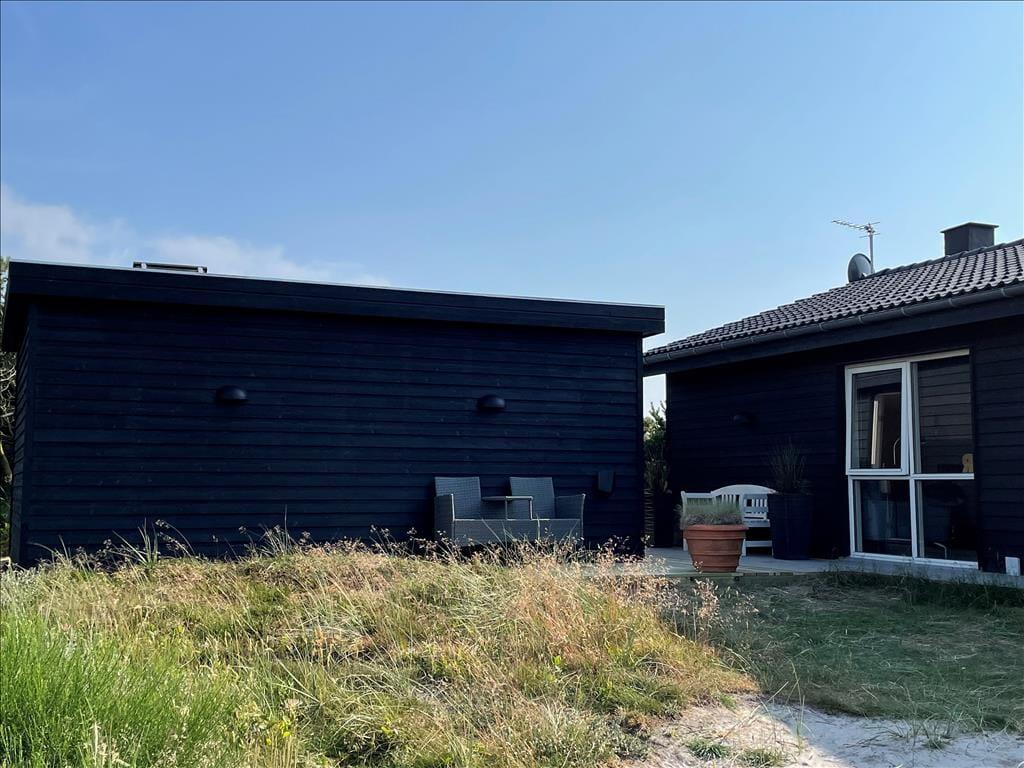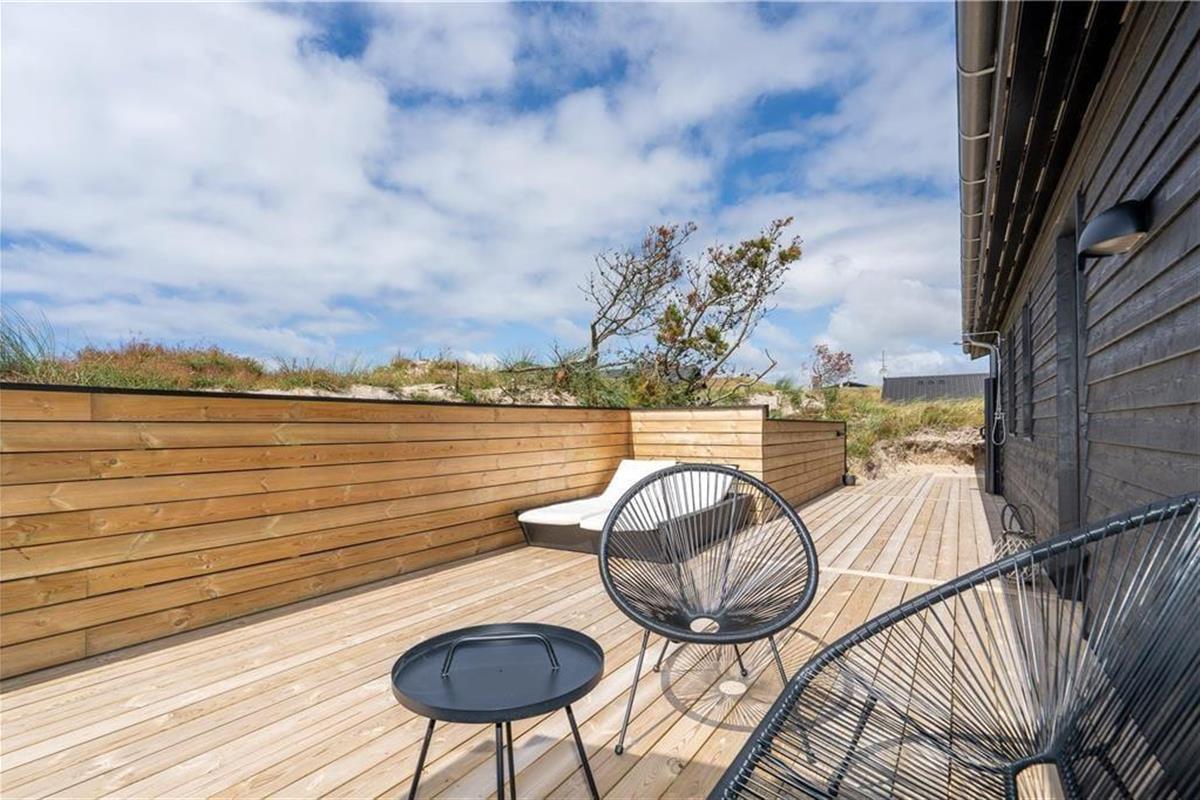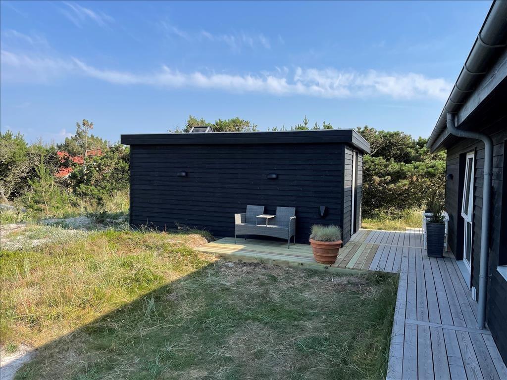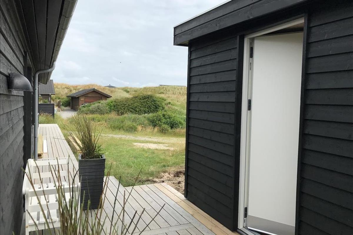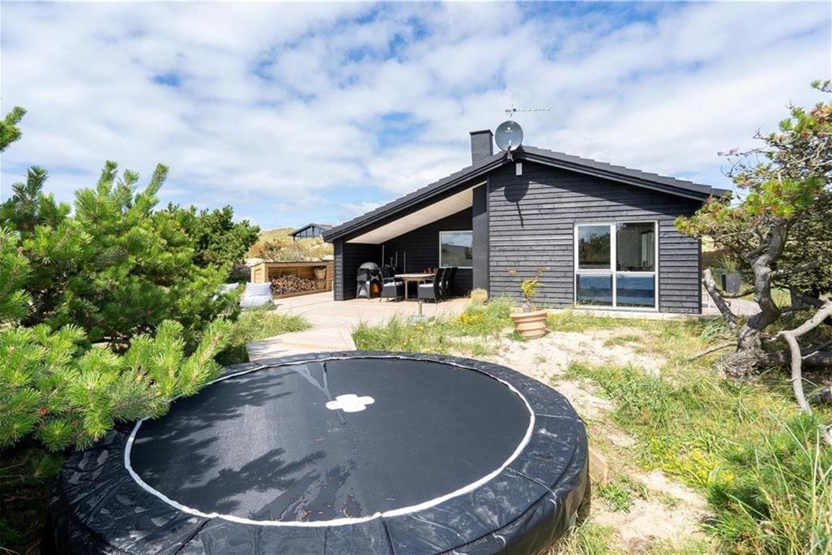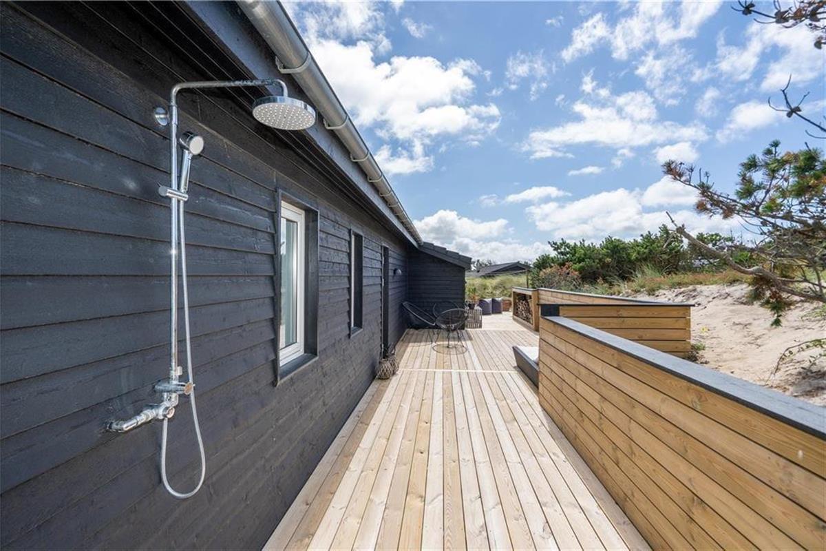 An sonnigen, warmen Tagen werden Sie gern unter freiem Himmel essen. Dies ist ohne Weiteres möglich, da die Küche über einen direkten Zugang zur Terrasse verfügt. Rund um das Haus erwarten Sie mehrere gute Aufenthaltsplätze, sodass Sie sich immer im gerade sonnigsten Eckchen niederlassen können - oder unter der Terrassenüberdachung. Frühaufsteher werden auf der Ostterrasse mit einer Aussicht auf den Sonnenaufgang über dem Ringkøbing Fjord verwöhnt. Ihre Kinder werden sich über das auf dem Dünengrundstück platzierte Trampolin freuen. Nach einem Ausflug an den Strand spült Ihnen die Außendusche den Sand und das Salz des Meeres von der Haut.