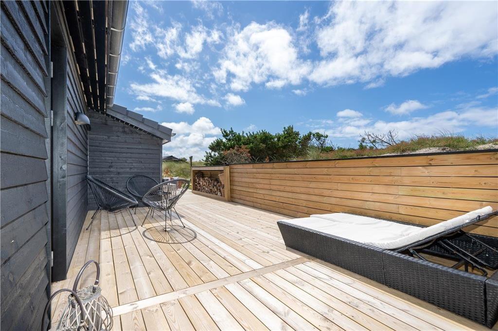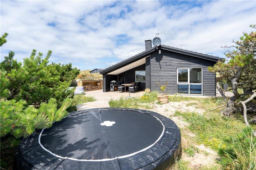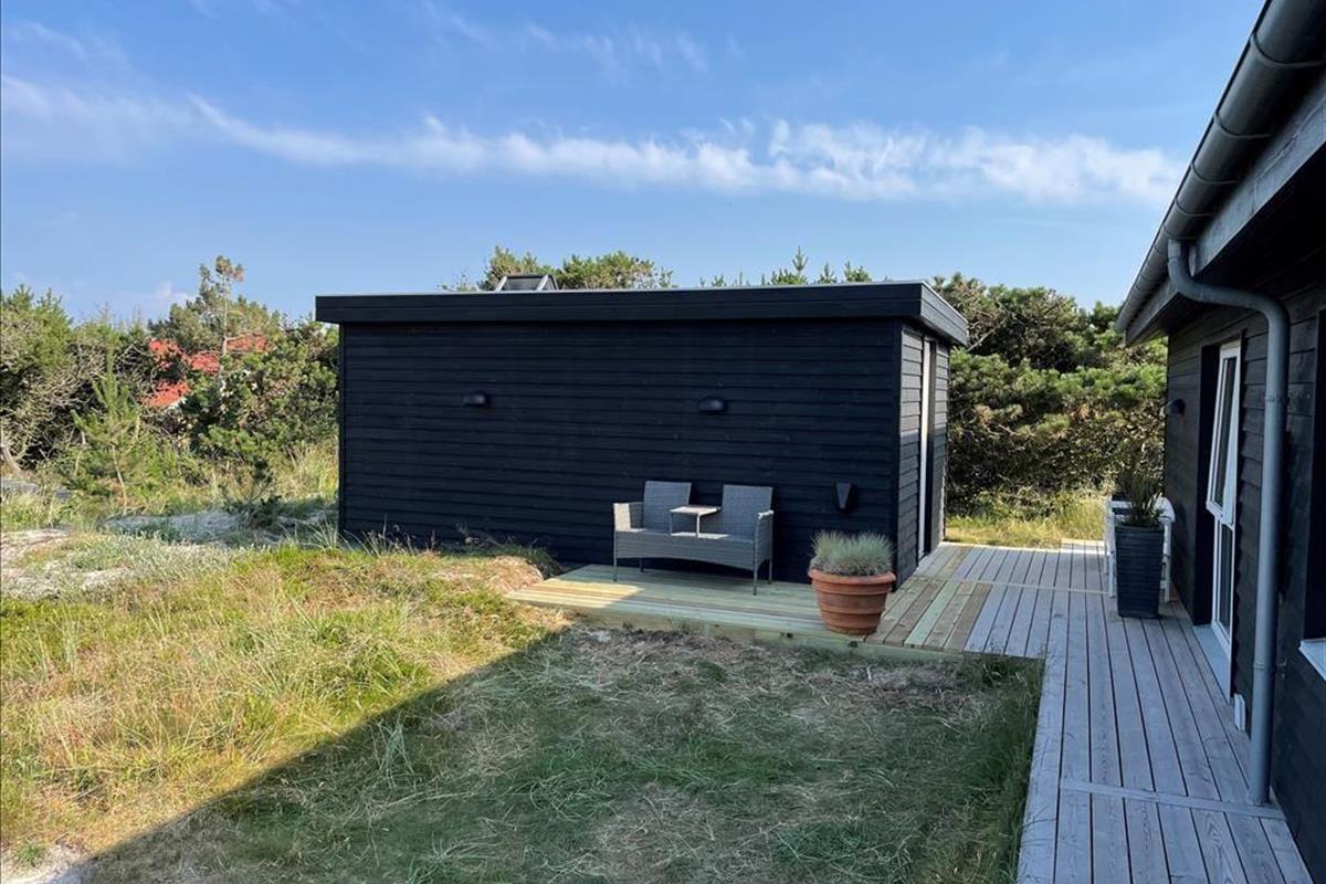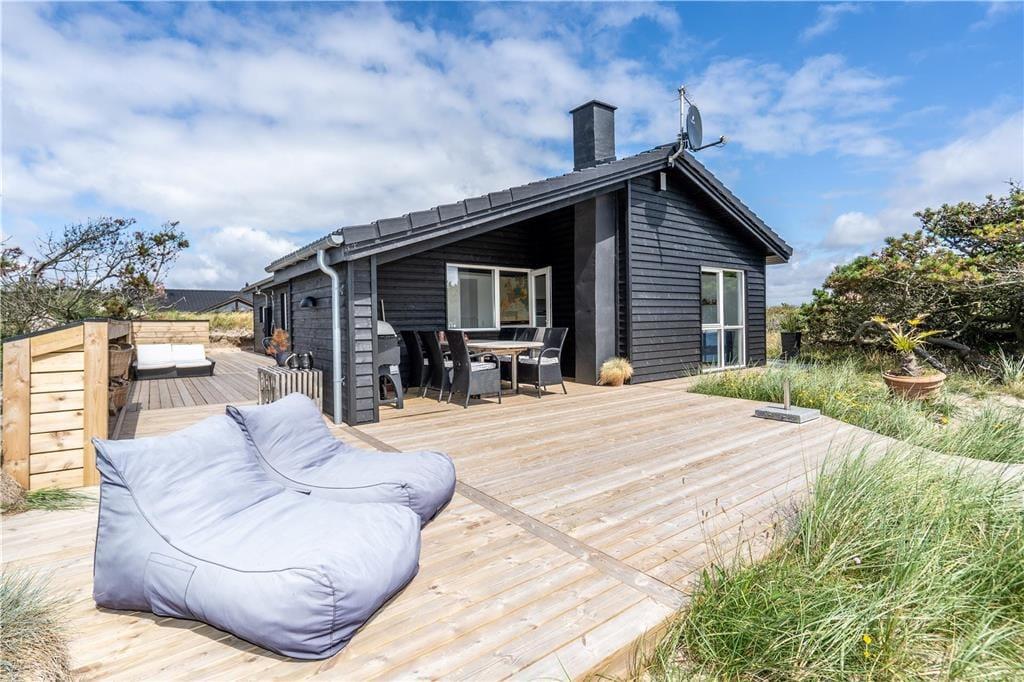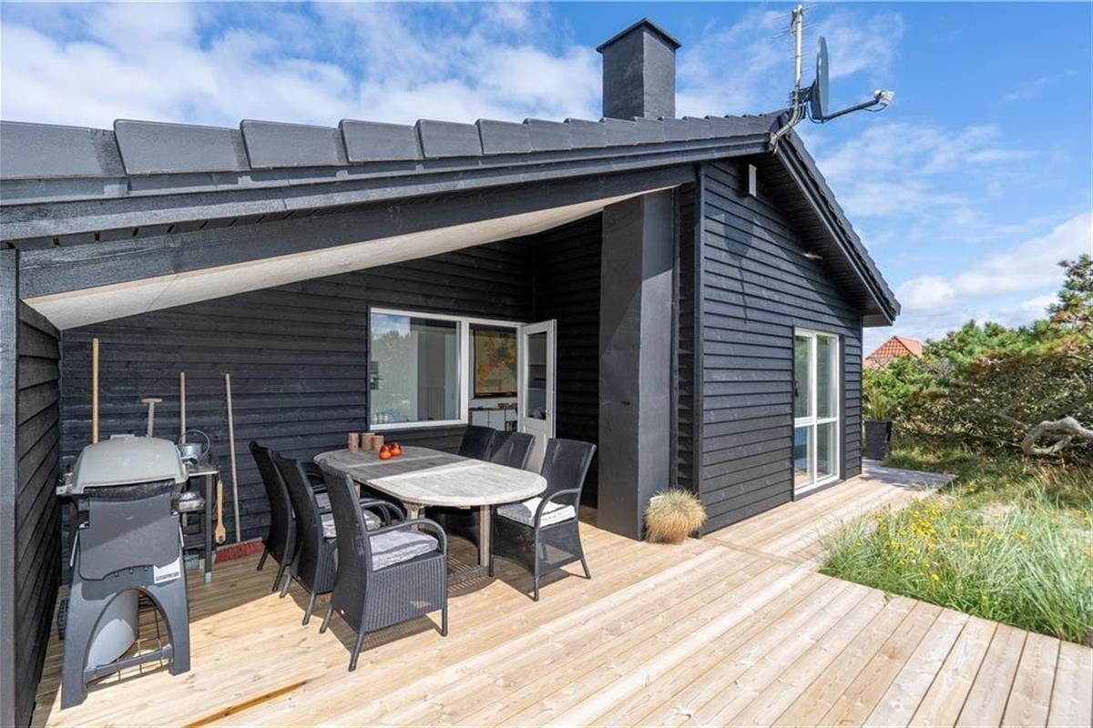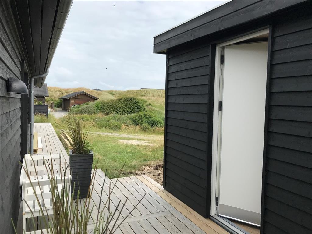 An sonnigen, warmen Tagen werden Sie gern unter freiem Himmel essen. Dies ist ohne Weiteres möglich, da die Küche über einen direkten Zugang zur Terrasse verfügt. Rund um das Haus erwarten Sie mehrere gute Aufenthaltsplätze, sodass Sie sich immer im gerade sonnigsten Eckchen niederlassen können - oder unter der Terrassenüberdachung. Frühaufsteher werden auf der Ostterrasse mit einer Aussicht auf den Sonnenaufgang über dem Ringkøbing Fjord verwöhnt. Ihre Kinder werden sich über das auf dem Dünengrundstück platzierte Trampolin freuen. Nach einem Ausflug an den Strand spült Ihnen die Außendusche den Sand und das Salz des Meeres von der Haut.