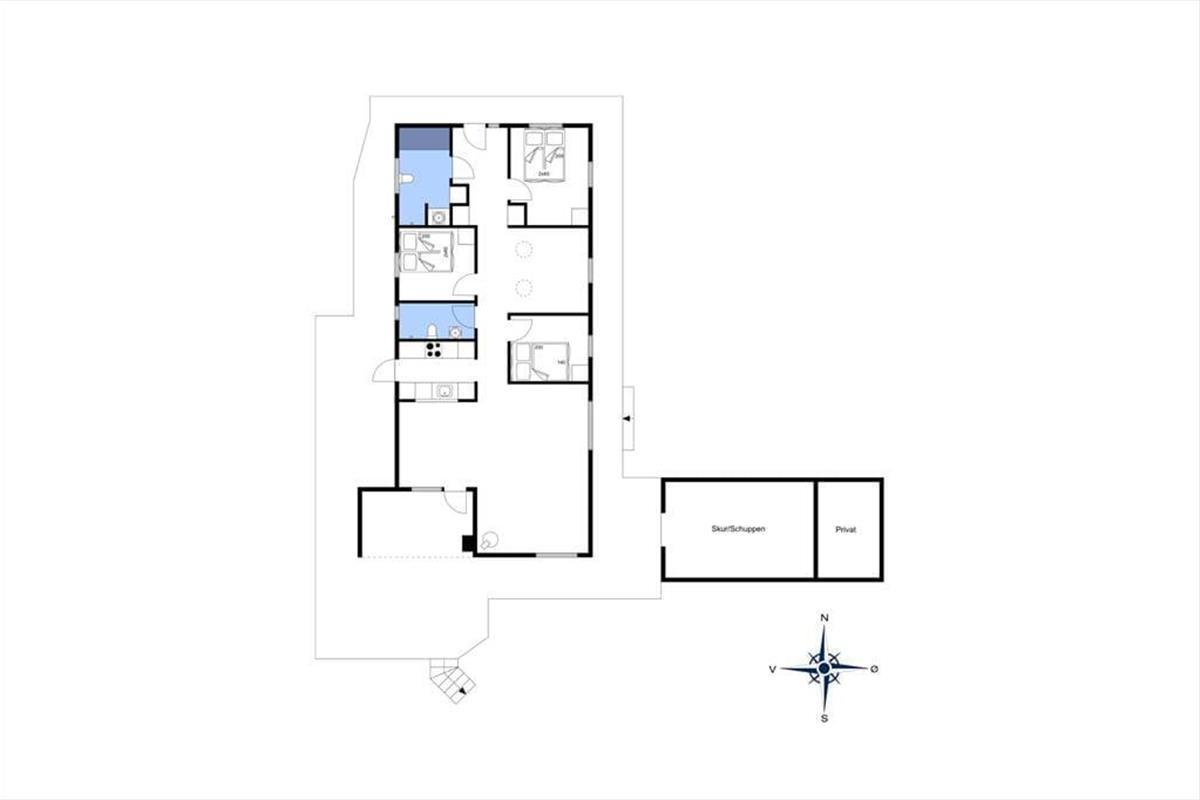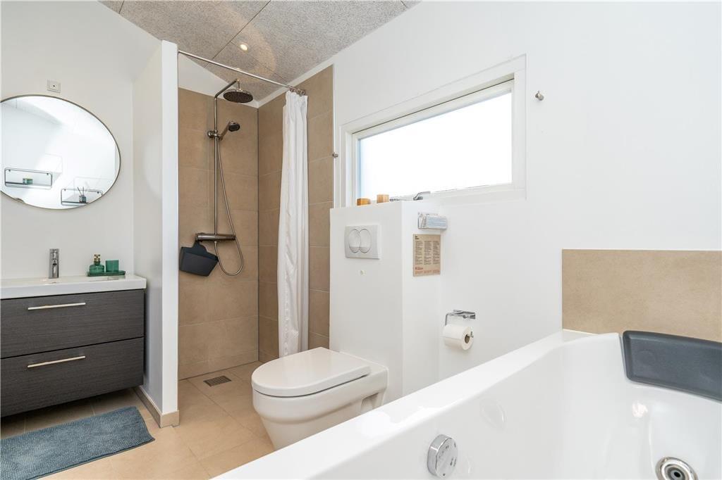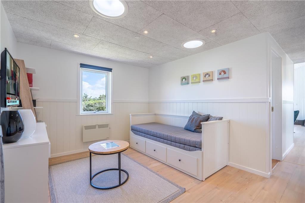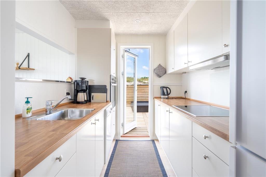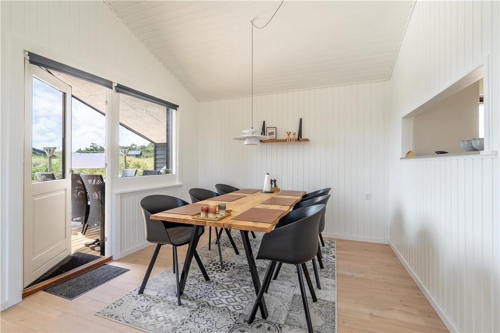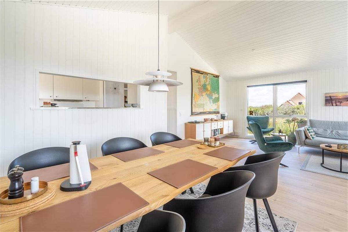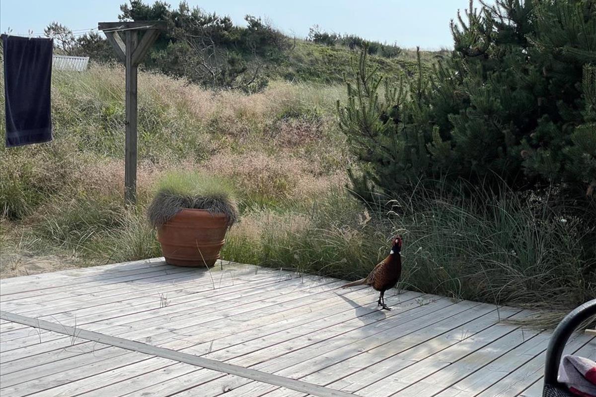 An sonnigen, warmen Tagen werden Sie gern unter freiem Himmel essen. Dies ist ohne Weiteres möglich, da die Küche über einen direkten Zugang zur Terrasse verfügt. Rund um das Haus erwarten Sie mehrere gute Aufenthaltsplätze, sodass Sie sich immer im gerade sonnigsten Eckchen niederlassen können - oder unter der Terrassenüberdachung. Frühaufsteher werden auf der Ostterrasse mit einer Aussicht auf den Sonnenaufgang über dem Ringkøbing Fjord verwöhnt. Ihre Kinder werden sich über das auf dem Dünengrundstück platzierte Trampolin freuen. Nach einem Ausflug an den Strand spült Ihnen die Außendusche den Sand und das Salz des Meeres von der Haut.