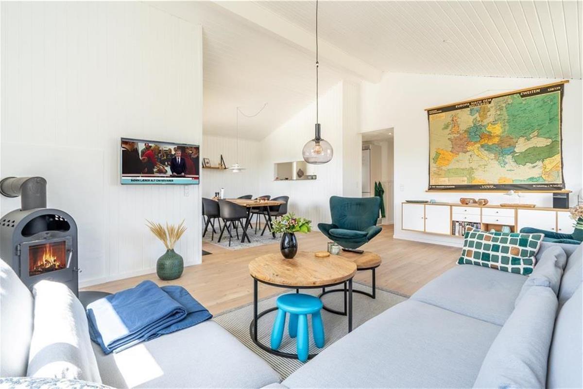 Unmittelbar nach dem ersten Betreten spüren Sie die einladende Ferienhausatmosphäre in den ansprechend eingerichteten Räumlichkeiten, die durch hohe Decken und helle Holzvertäfelungen geprägt werden. Dass die letzte Modernisierung erfolgreich war, erkennen Sie sofort am stilvollen Interieur - beispielsweise in den beiden Badezimmern, von denen das eine mit einem Whirlpool verwöhnt. In den drei Schlafräumen stehen gute Betten für Sie bereit. Das Haus bietet darüber hinaus zwei offene Aufenthaltsbereiche, die lediglich durch einen Flur voneinander getrennt sind. Der kleine Wohnraum eignet sich gut für Ihre spielenden Kinder und für Teenager, die in Ruhe fernsehen möchten. Der große Wohnraum lädt mit seinem Kaminofen, dem Fjordblick und den richtig schönen Polstermöbeln zu entspannten Stunden im Familienkreis ein. Am Esstisch, der sich in den Wohnraum einfügt, genießen Sie die Mahlzeiten, die Sie im Vorwege in der gut ausgestatteten Küche zubereitet haben.