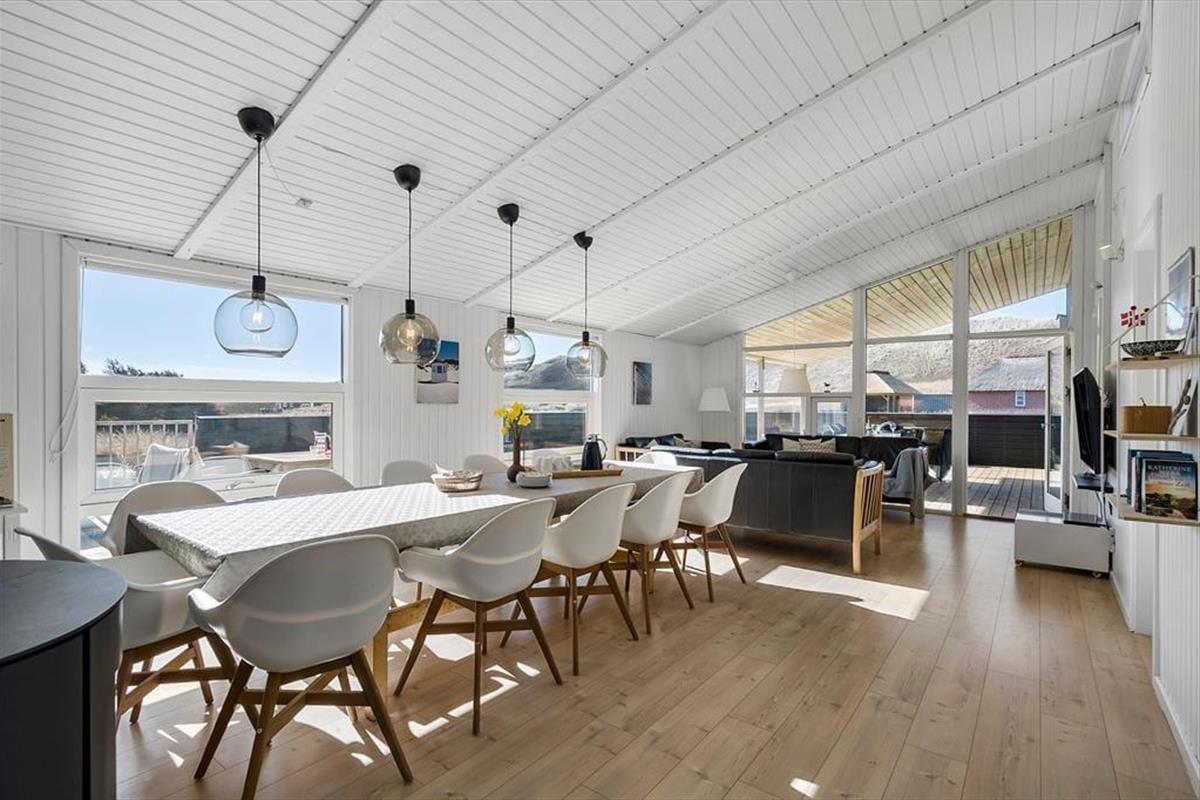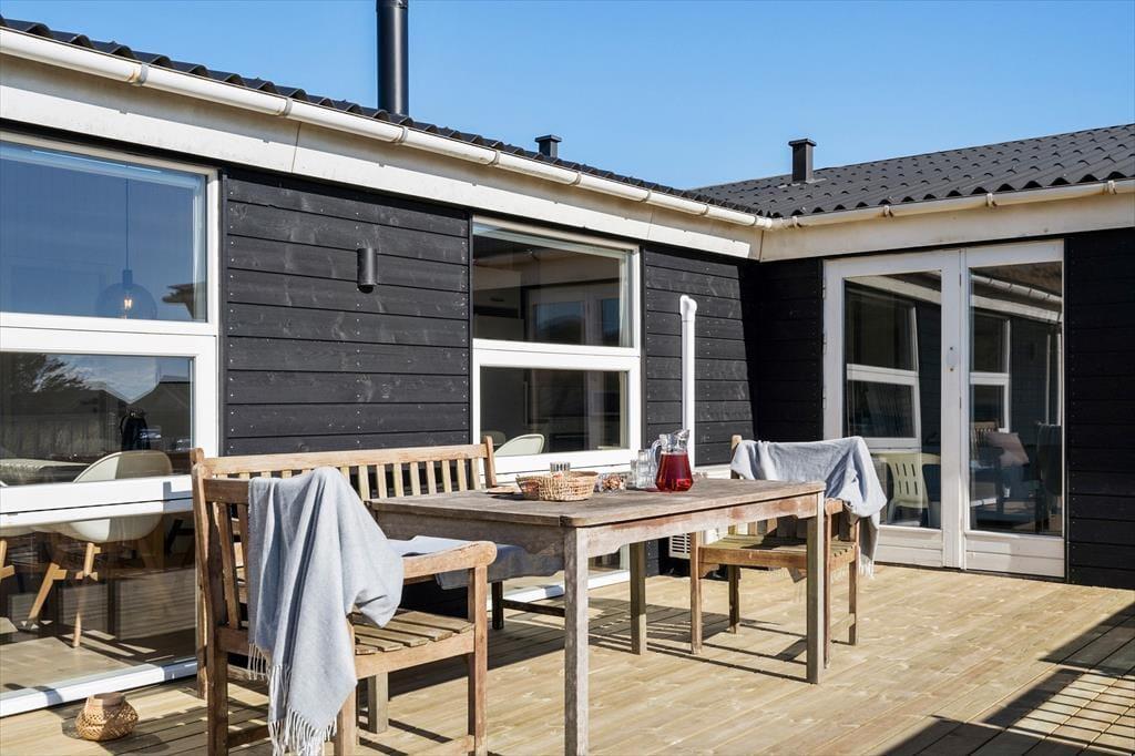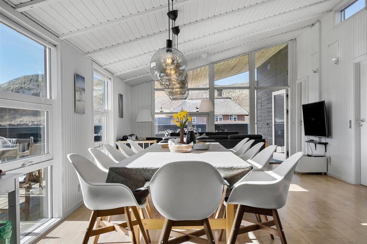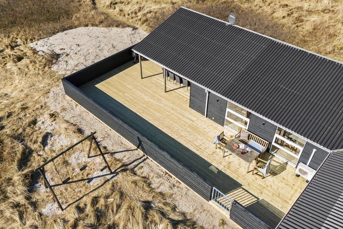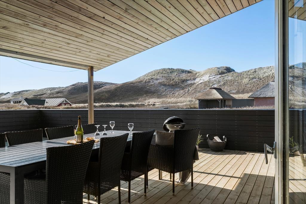 Wohnraum und Terrasse verwöhnen mit einem reizvollen Ausblick auf die äußerste Dünenreihe Aargabs. Der Ausblick erinnert Sie zu jeder Zeit daran, wie angenehm nah Sie am Strand wohnen. Es dauert nur wenige Minuten, bis Sie oben auf den Dünen stehen und weit über die Nordsee blicken. Am Strand können Sie nach Herzenslust baden, mit den Kindern im warmen Sand spielen, Ihren Drachen steigen lassen und lange Spaziergänge unternehmen. Holmsland Klit ist eine schmale Nehrung zwischen Nordsee und Ringkøbing Fjord. Das Wasser ist zu beiden Seiten schnell erreicht. Daher gilt die ausgesprochen schöne Gegend als Eldorado für Angler, Windsurfer, SUP-Boarder und andere Wassersportler. Bei Radfahrern und Wanderern ist die Gegend ebenfalls sehr beliebt. Dank der Nähe zum interessanten Fischereihafenort Hvide Sande, können Sie Ihre Urlaubstage problemlos mit einem Restaurantbesuch oder einem großen Eis am Hafen ausklingen lassen.