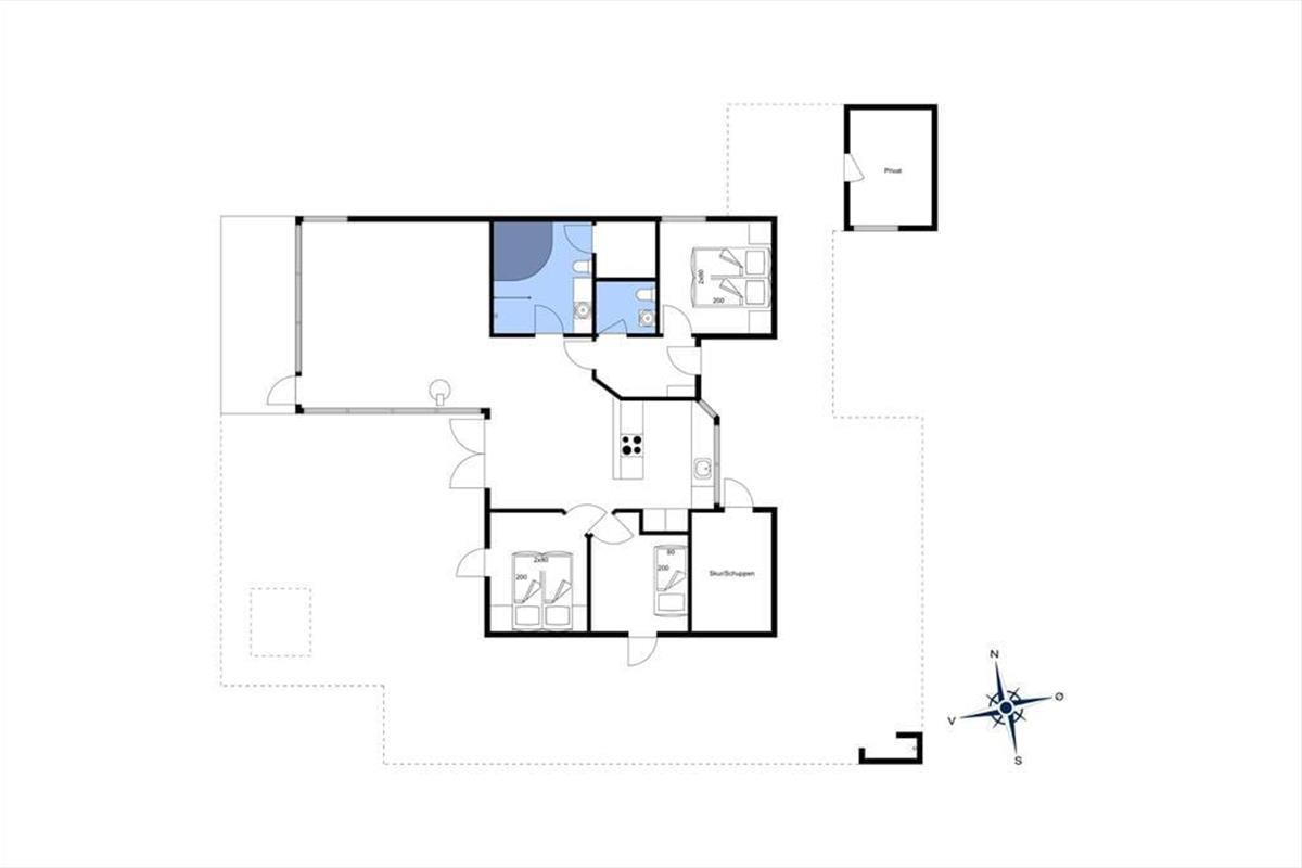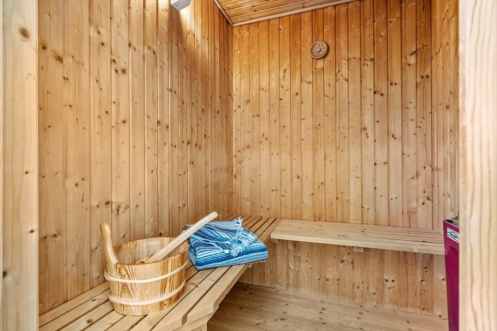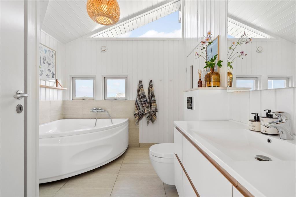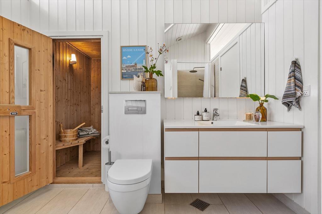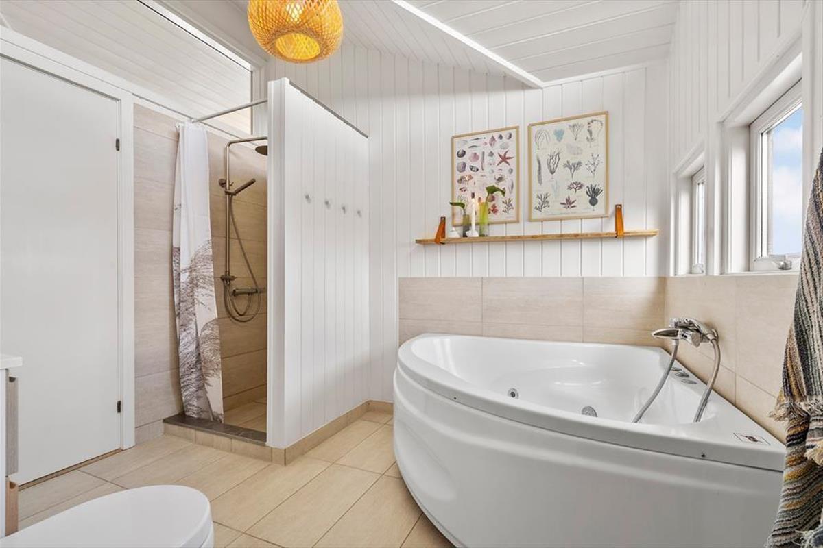 Das Haus ist wunderschön in den Dünen gelegen. Man fühlt sich der Natur ganz nahe, auch wenn man im stilvollen Wohnzimmer entspannt oder in der offenen Küche Brötchen backt und Abendessen zubereitet. Sie werden sicher auch bemerken, dass das Licht so nahe an der Küste etwas ganz Besonderes ist, und durch die großen Wohnzimmerfenster des Hauses hat die Sonne reichlich Gelegenheit, ins Innere zu blicken. Der gesamte Innenbereich ist hell – nicht nur im Wohnbereich, sondern auch in den drei einladenden Schlafzimmern sowie im Gäste-WC und Badezimmer. Letzteres verfügt außerdem sowohl über einen Whirlpool als auch über eine Sauna, sodass der Urlaub auf Wunsch zu einem echten Wellness-Aufenthalt werden kann.