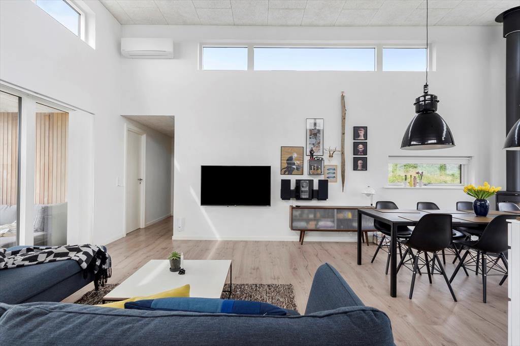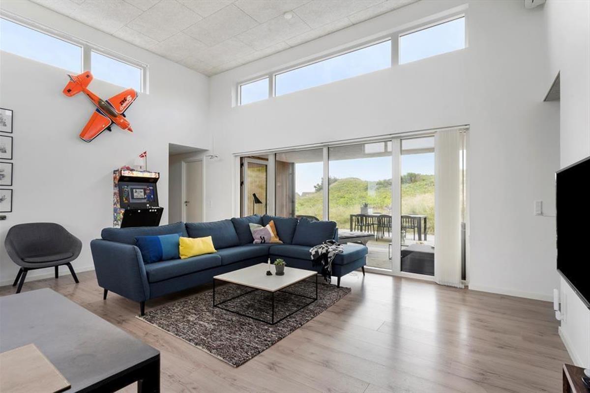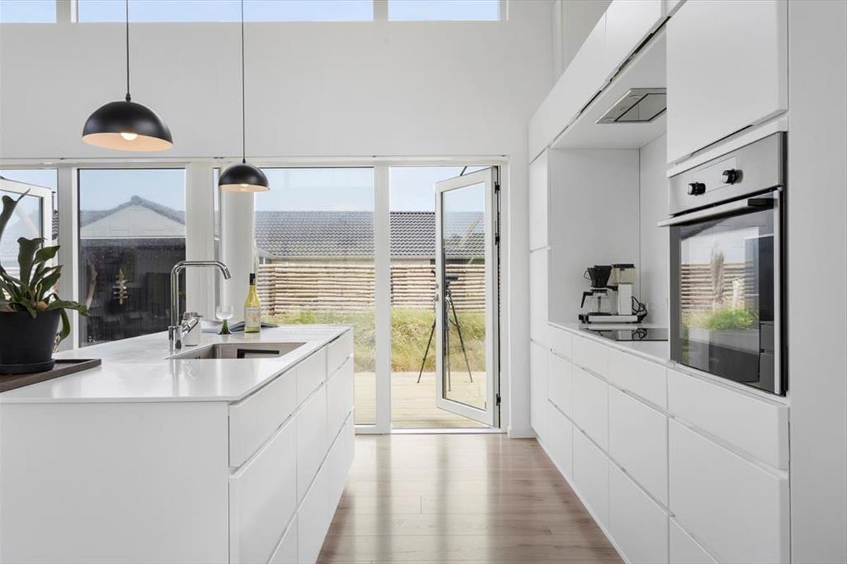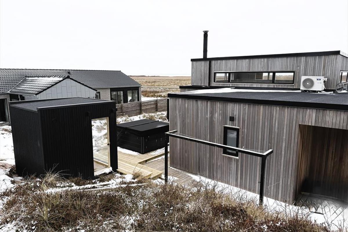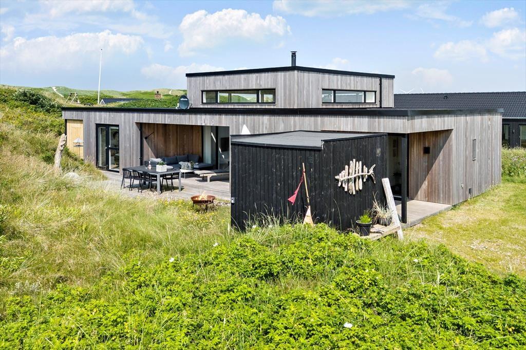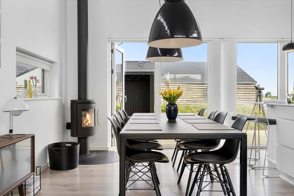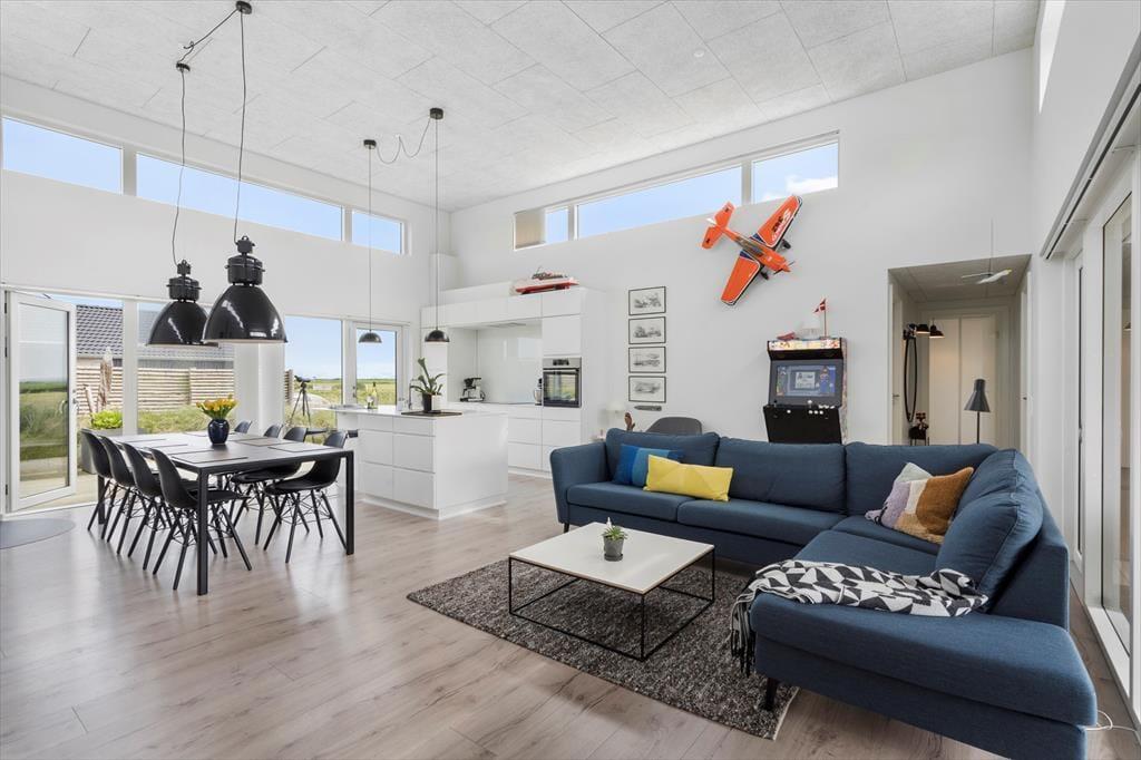 Die ansprechende Holzfassade des im Jahr 2019 erbauten Ferienhauses fügt sich wunderbar in die landschaftlich schöne Umgebung Holmsland Klits ein. Im Inneren sorgen viele Fensterpartien für einen hübschen Tageslichteinfall. Vom Wohnraum blickst du über die offene Landschaft und siehst den Fjord im Osten schimmern. Die tolle Küche ist offen in den Wohnraum integriert. Dadurch genießt du selbst während der Zubereitung der Mahlzeiten die Gesellschaft deiner Lieben. Der an der Wand hängende Spieleautomat garantiert Groß und Klein viel Spaß und Unterhaltung. An kühlen Tagen verwöhnt dich der Kaminofen mit behaglicher Wärme und einem Maximum an echter Ferienhausatmosphäre. Zur Wohnfläche zählen darüber hinaus vier große Schlafräume und zwei gute Badezimmer. Die Schlafräume und Bäder verteilen sich auf zwei voneinander getrennte Bereiche, wodurch sich dieses Mietobjekt hervorragend für den gemeinsamen Urlaub zweier befreundeter Familien eignet.