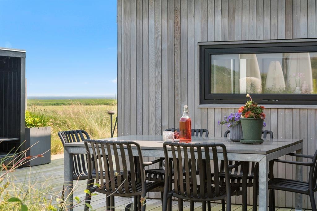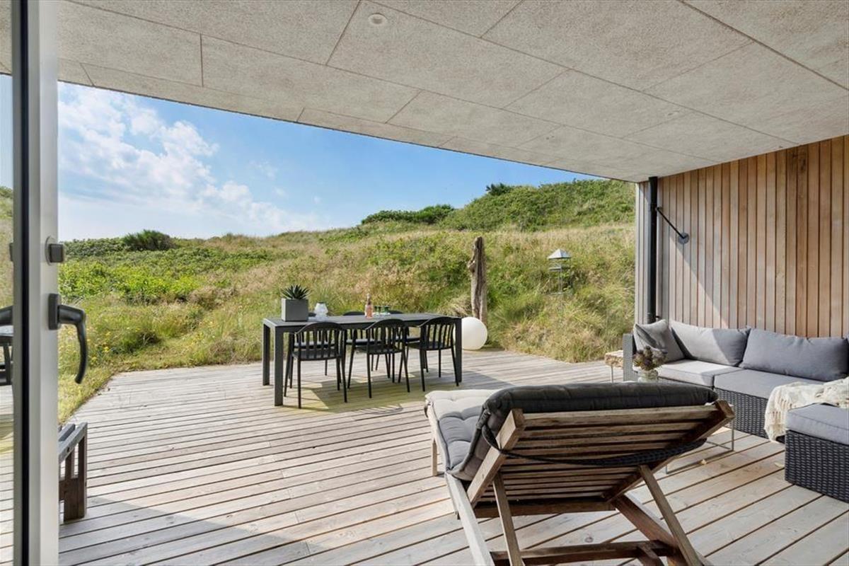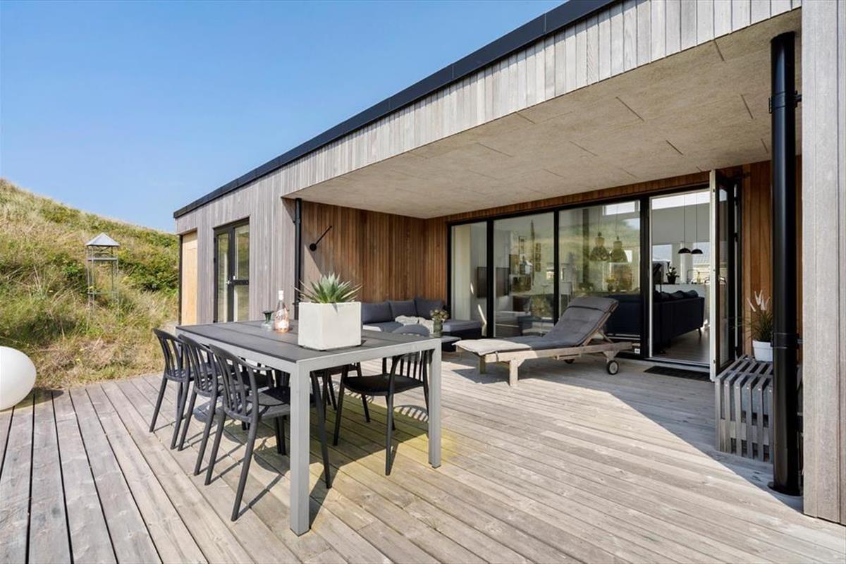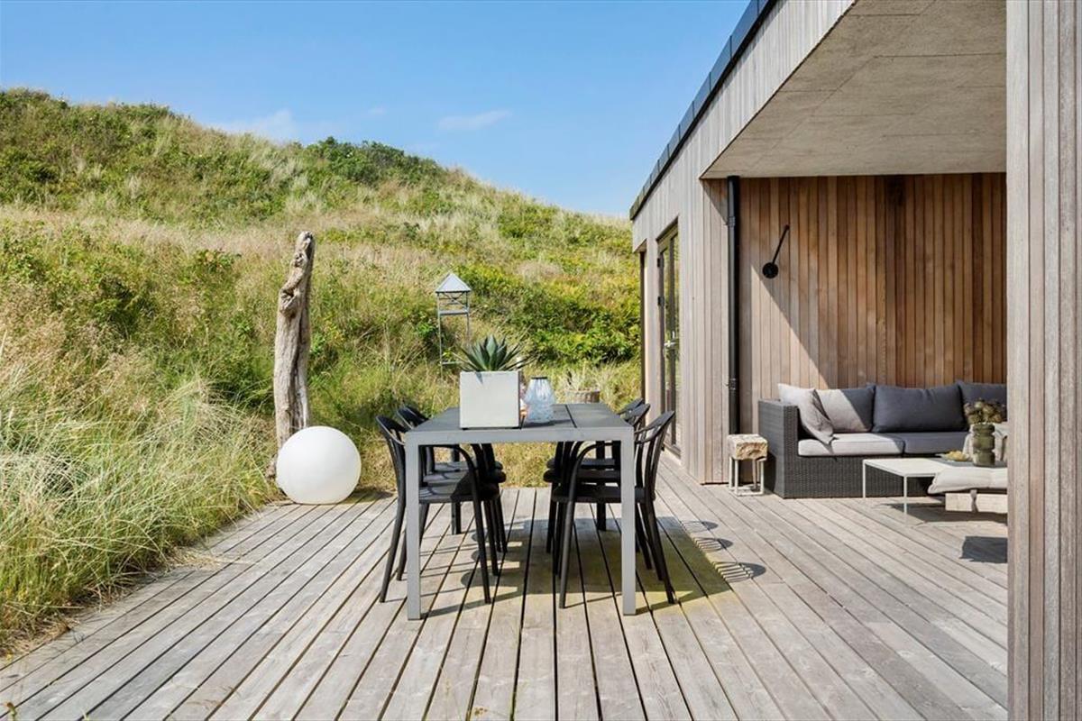 Dein Ferienhaus liegt am Rande von Mettes Bjerg, einer hohen Düne, der dein Ferienhausweg seinen Namen verdankt. Auf dem höchsten Punkt deines Naturgrundstücks erwartet dich eine Bank, auf der du dich in aller Ruhe niederlassen und vom Ausblick auf die hübsche Landschaft in den Bann ziehen lassen kannst. Die Aussicht auf den Ringkøbing Fjord ist von hier oben wunderschön. Das Wasser siehst du auch von der nach Norden und der nach Osten gerichteten Terrasse aus im Hintergrund schimmern. Die dritte Terrasse deines Ferienhauses weist gen Süden. Sie wird ein wenig durch die Dünen abgeschirmt und lädt zum Entspannen in der Sonne ein. Ein Teil der Südterrasse ist überdacht und vom Haus eingerahmt, sodass du hier lange Urlaubsabende angenehm geschützt im Kreise deiner Lieben ausklingen lassen kannst.