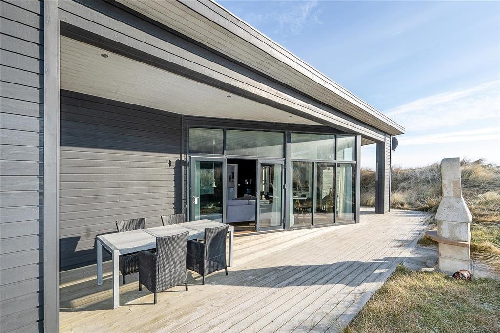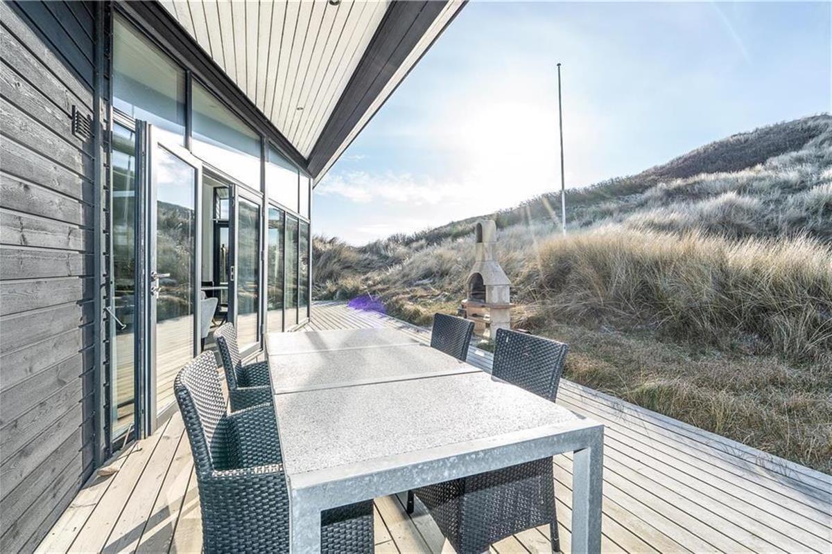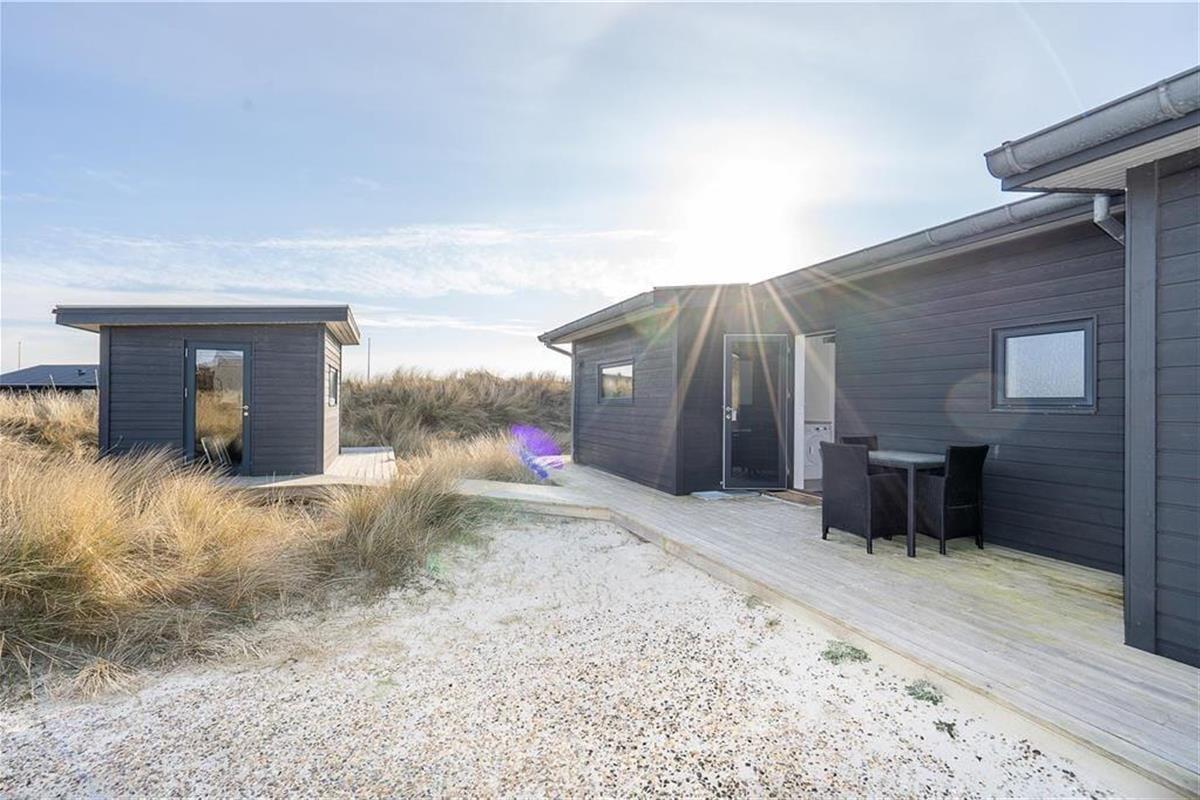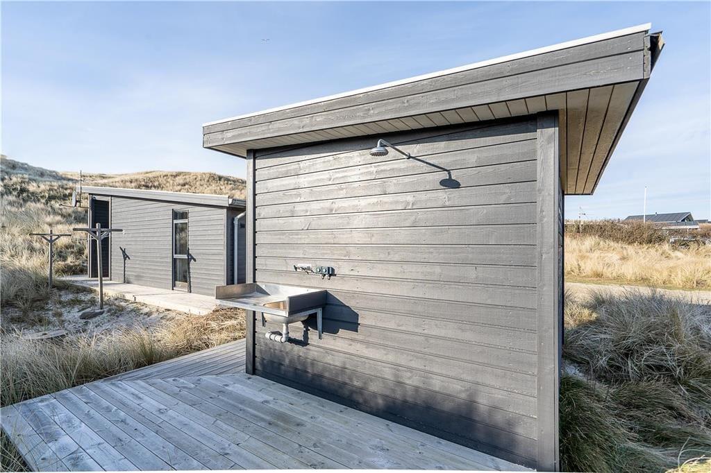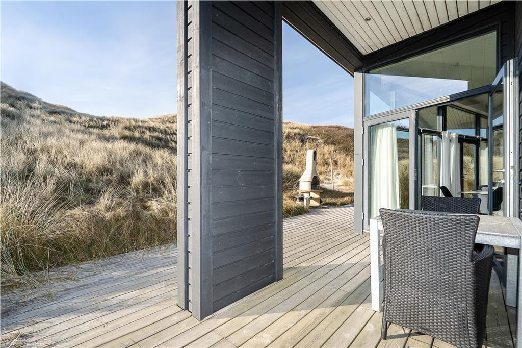 Auf der Holzterrasse, die das gesamte Mietobjekt umgibt, werden Sie zu jeder Tageszeit einen sonnigen und windgeschützten Aufenthaltsplatz finden. Ein Teil der Terrasse ist überdacht. Während Sie hier in aller Ruhe sitzen und grillen, genießen Sie einen wunderschönen Blick auf die Dünen und die untergehende Abendsonne. Sie können jeden neuen Urlaubstag mit einer Erfrischung unter der Außendusche begrüßen. Die Dusche spült Ihnen außerdem nach einem Abstecher an den Strand das Salz und den Sand des Meeres von der Haut. Surfer können Ihre nassen Neoprenanzüge und das Equipment im erwärmten und isolierten Schuppen trocknen und aufbewahren. Angler wird der Fischreinigungsplatz erfreuen. Für E-Autos steht eine Lademöglichkeit zur Verfügung.
