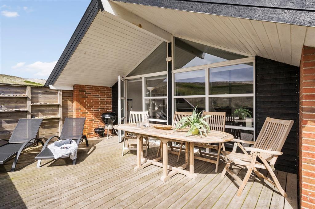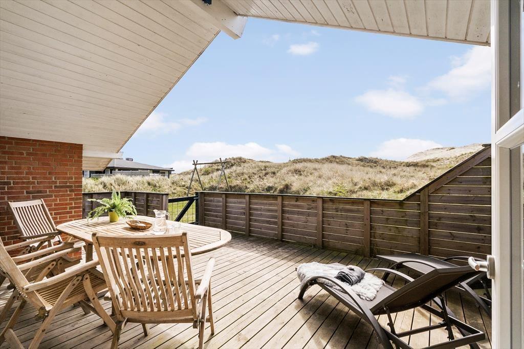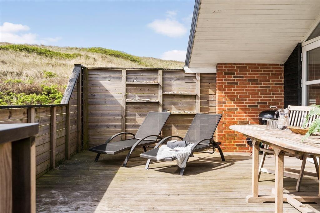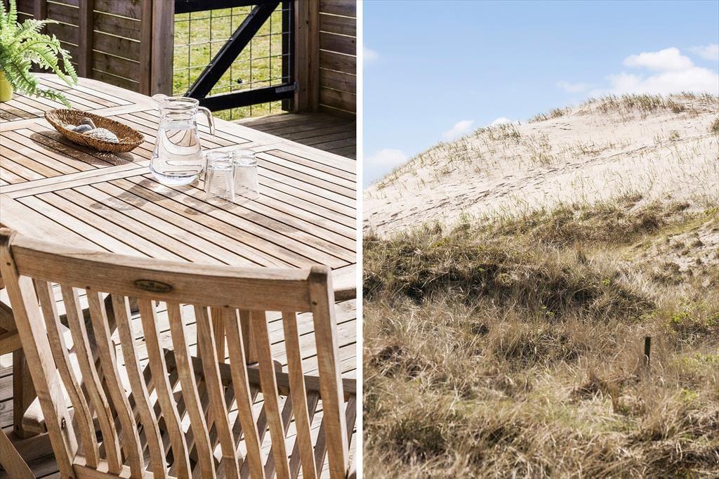 Draußen im Freien können die Kinder schaukeln und sich auf dem Naturgrundstück tummeln, das direkt an die hohen Dünen grenzt. Falls das Wetter dazu einlädt, unter freiem Himmel zu frühstücken, können Sie den Tisch in der Sonne auf dem großen Terrassenareal decken, das sich östlich und südlich des Hauses erstreckt. Ein kleinerer Teil der Terrasse ist überdacht. Eine Umrandung mit Gartentor schließt den Aufenthaltsbereich gänzlich ab, was insbesondere Eltern kleiner Kinder und Hundebesitzer sicherlich zu schätzen wissen.