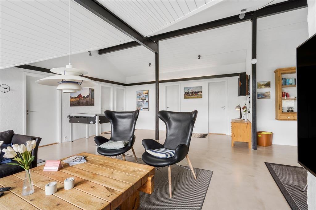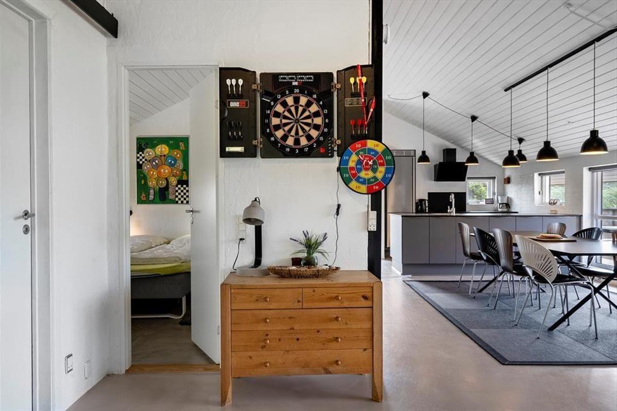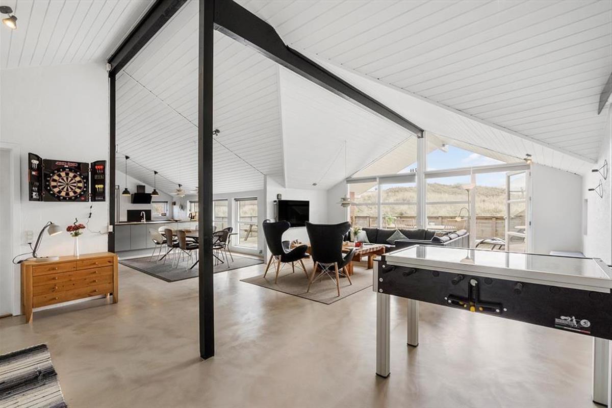 Die gemütlichen Stunden im Kreise der Lieben verbringen Sie am besten im Aufenthaltsbereich, der Küche, Esszimmer und Wohnzimmer miteinander kombiniert. Die Fenster geben den Blick auf die schöne Dünenlandschaft frei und sorgen tagsüber für einen angenehmen Lichteinfall. Abends können Sie die gemütliche Stimmung noch steigern, indem Sie den Kamin anfeuern und einen Film auf dem Flachbildfernseher schauen. Das Wohnzimmer ist übrigens sowohl mit Tischfußball als auch mit einer Dartscheibe ausgestattet, sodass Erwachsene wie Kinder sich auf unterhaltsame Stunden freuen können.