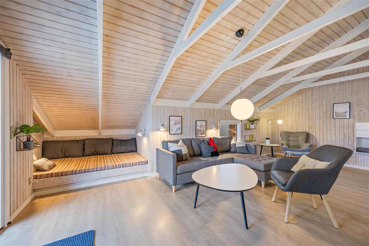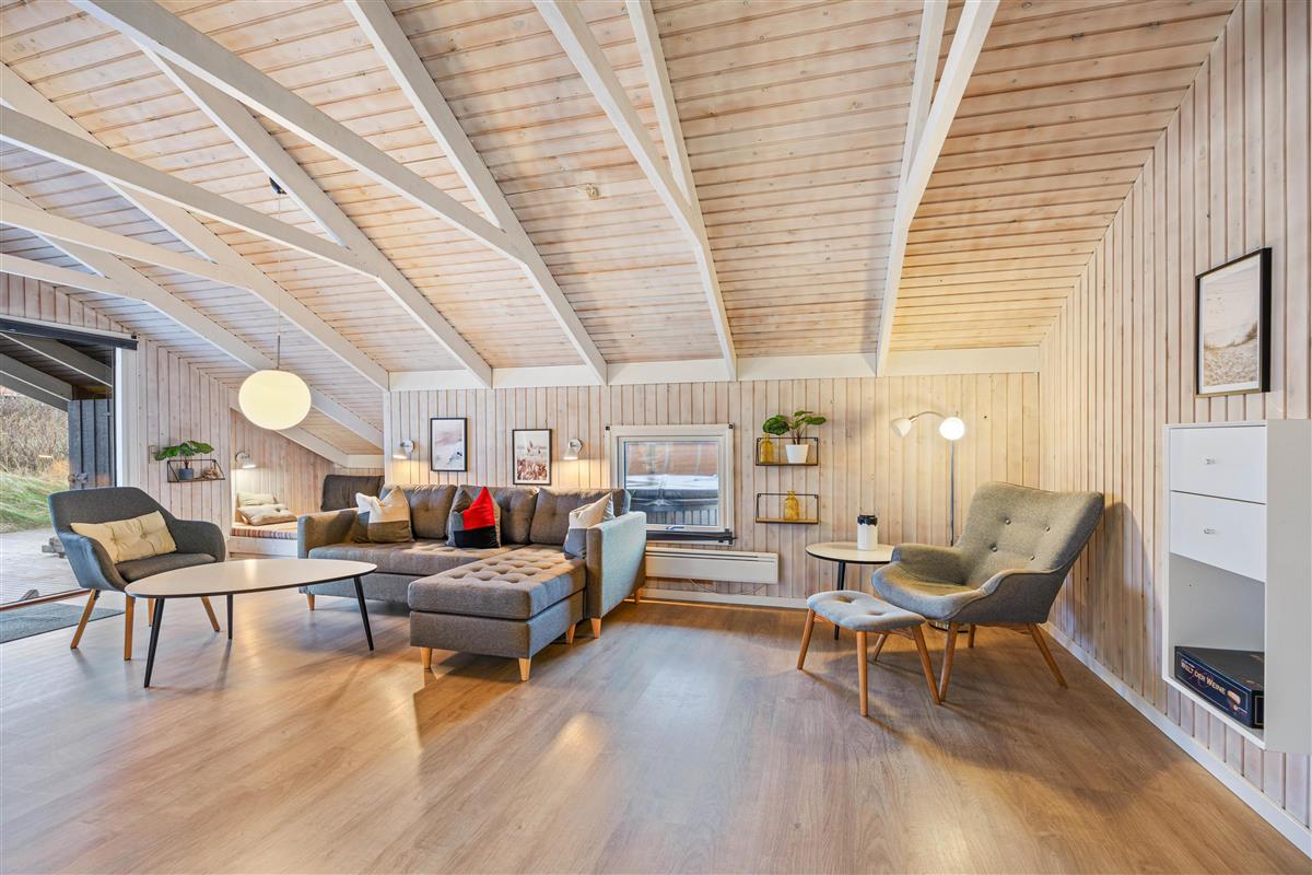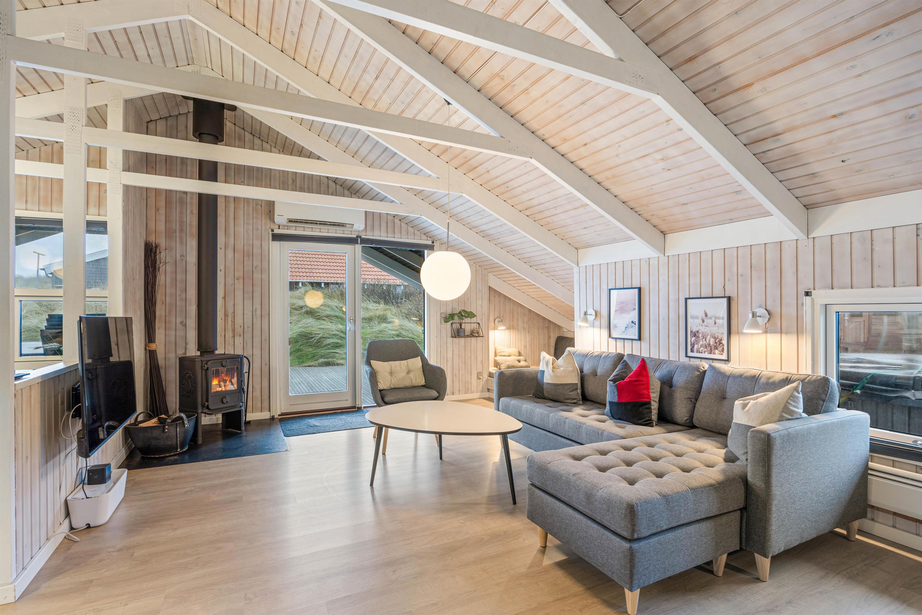 Your cosy holiday home welcomes you for a relaxing break right by the Danish West Coast. Make yourself comfortable for a family film night in the inviting corner sofa area while enjoying the warmth of the crackling wood-burning stove.