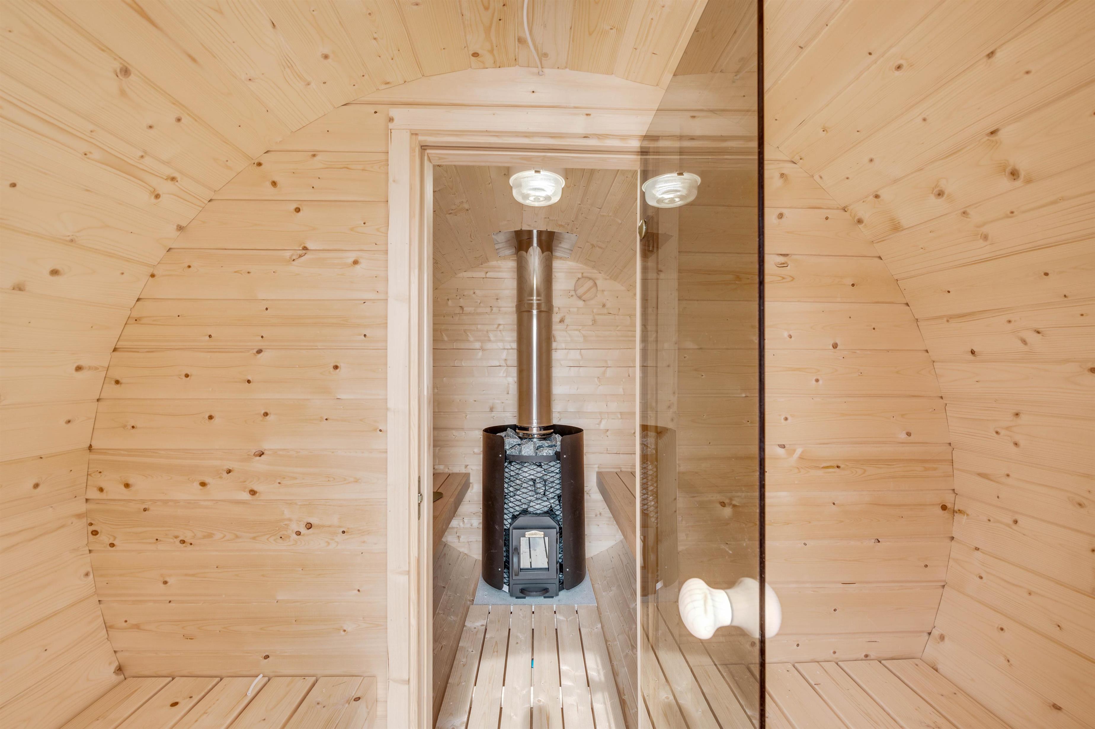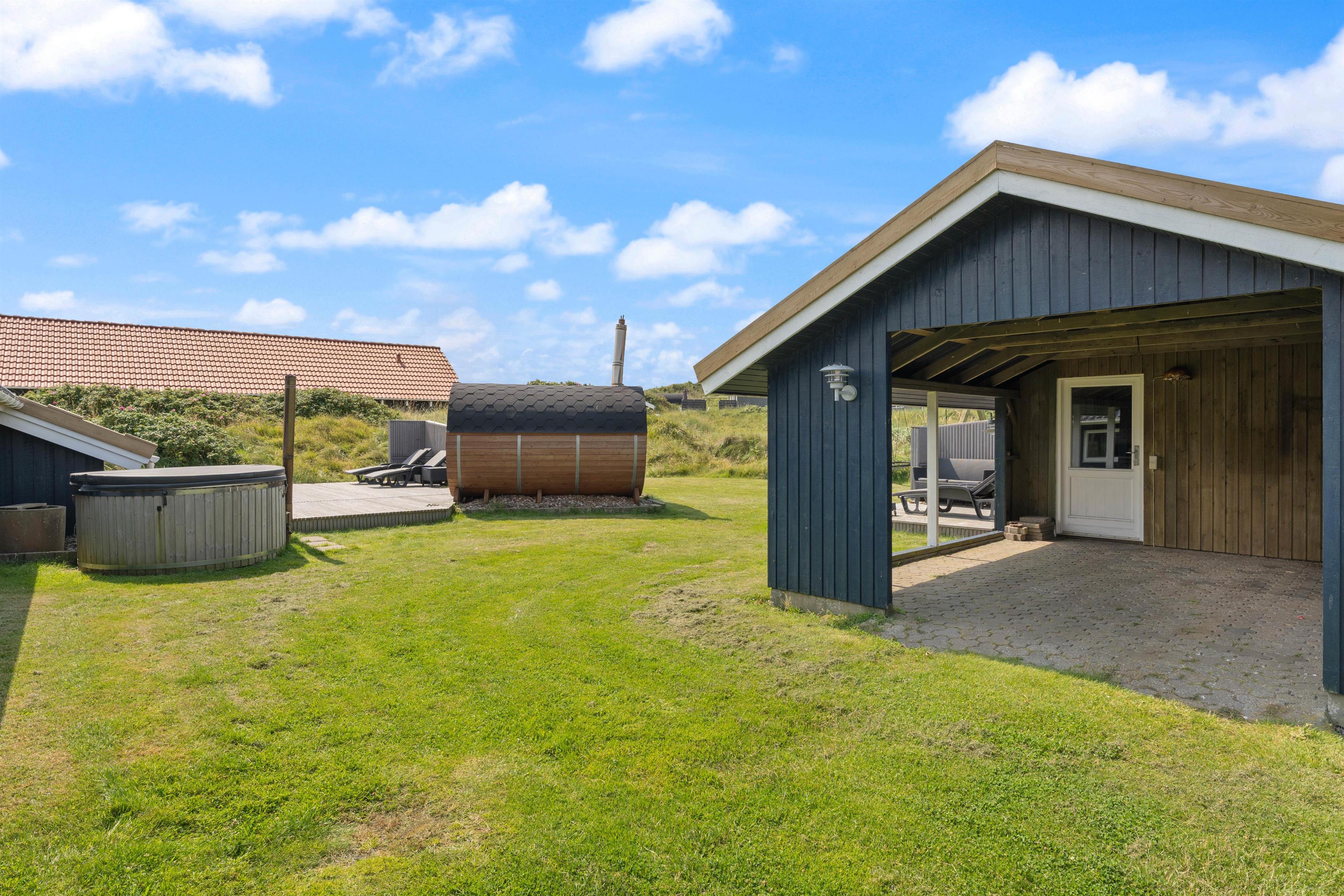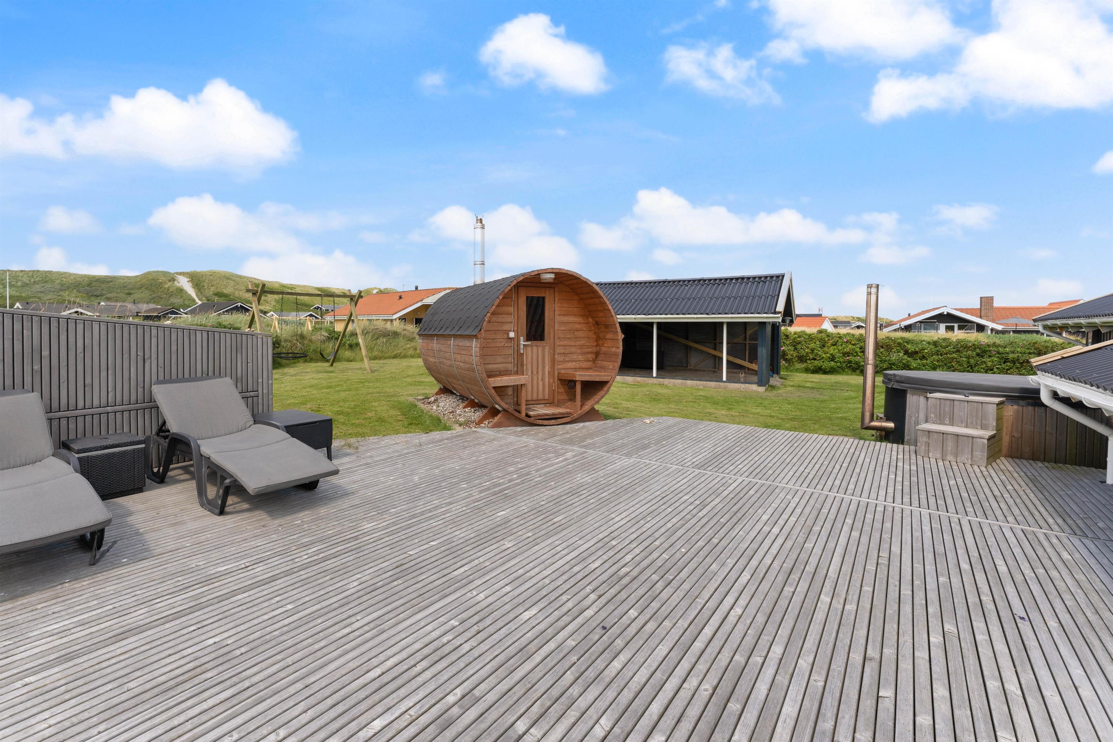 The outdoor area of your holiday home offers a relaxation oasis. Here, a hot tub and outdoor sauna invite you to enjoy wellness evenings under the starry sky, with the sound of the sea in the distance.