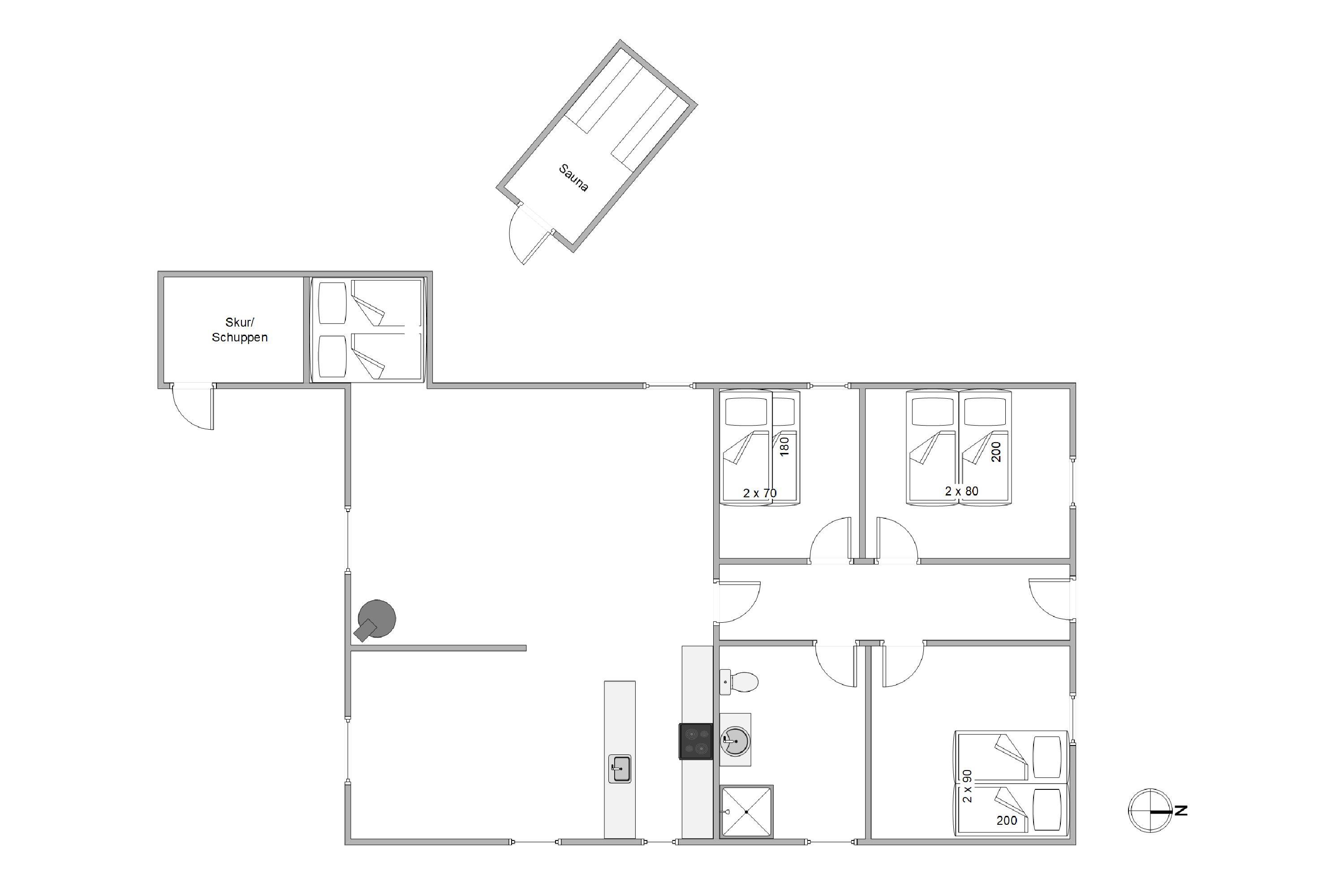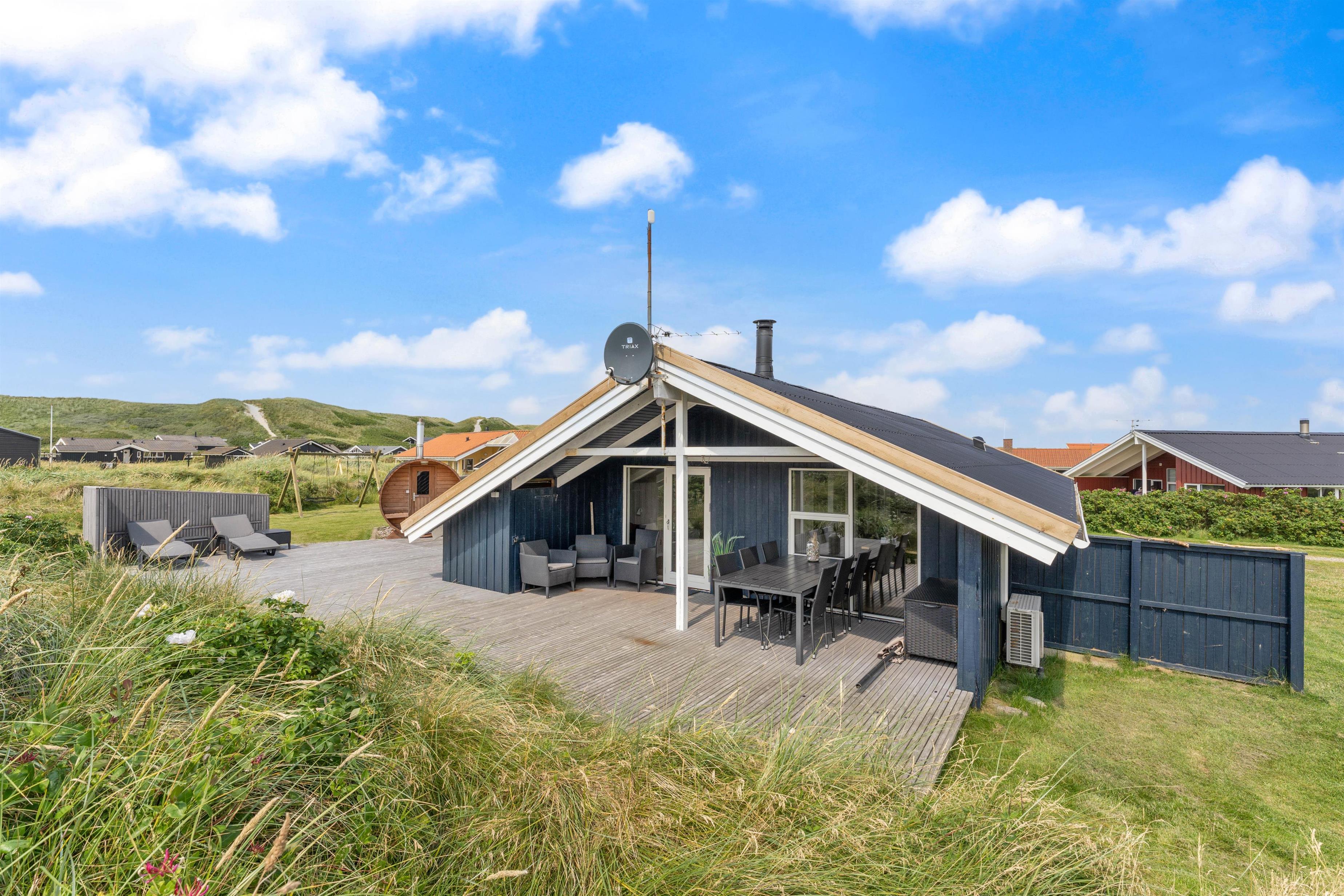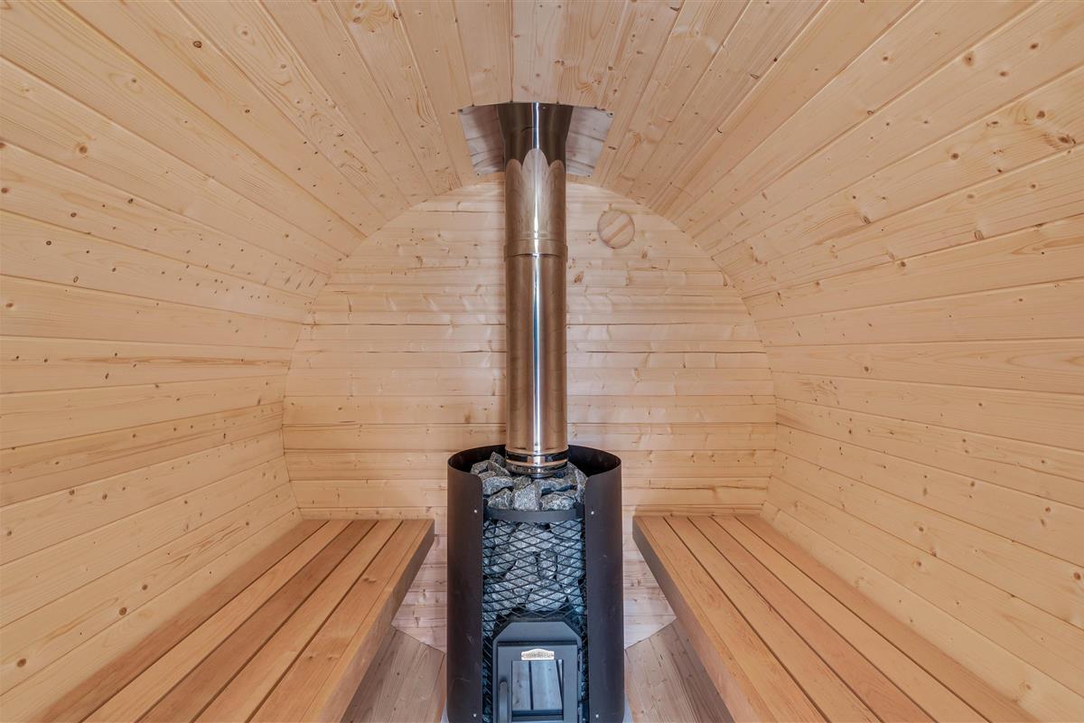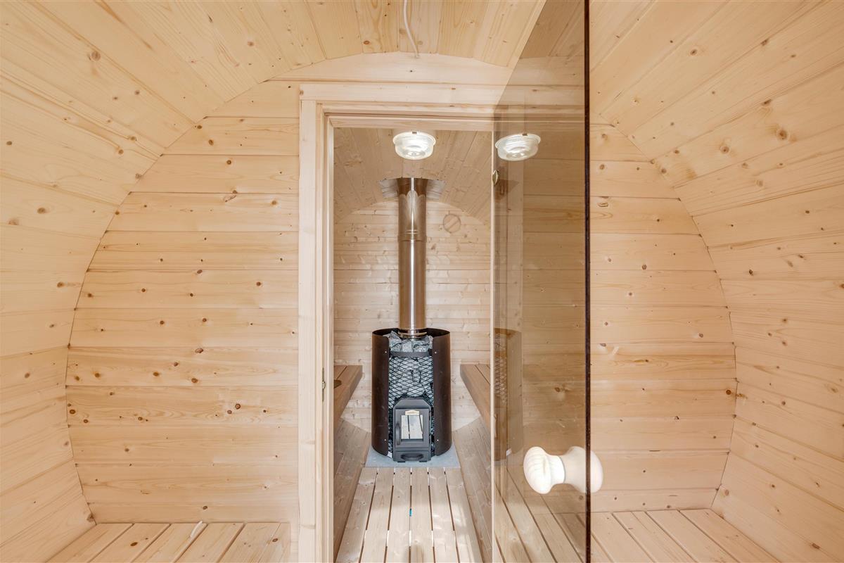 The outdoor area of your holiday home offers a relaxation oasis. Here, a hot tub and outdoor sauna invite you to enjoy wellness evenings under the starry sky, with the sound of the sea in the distance.