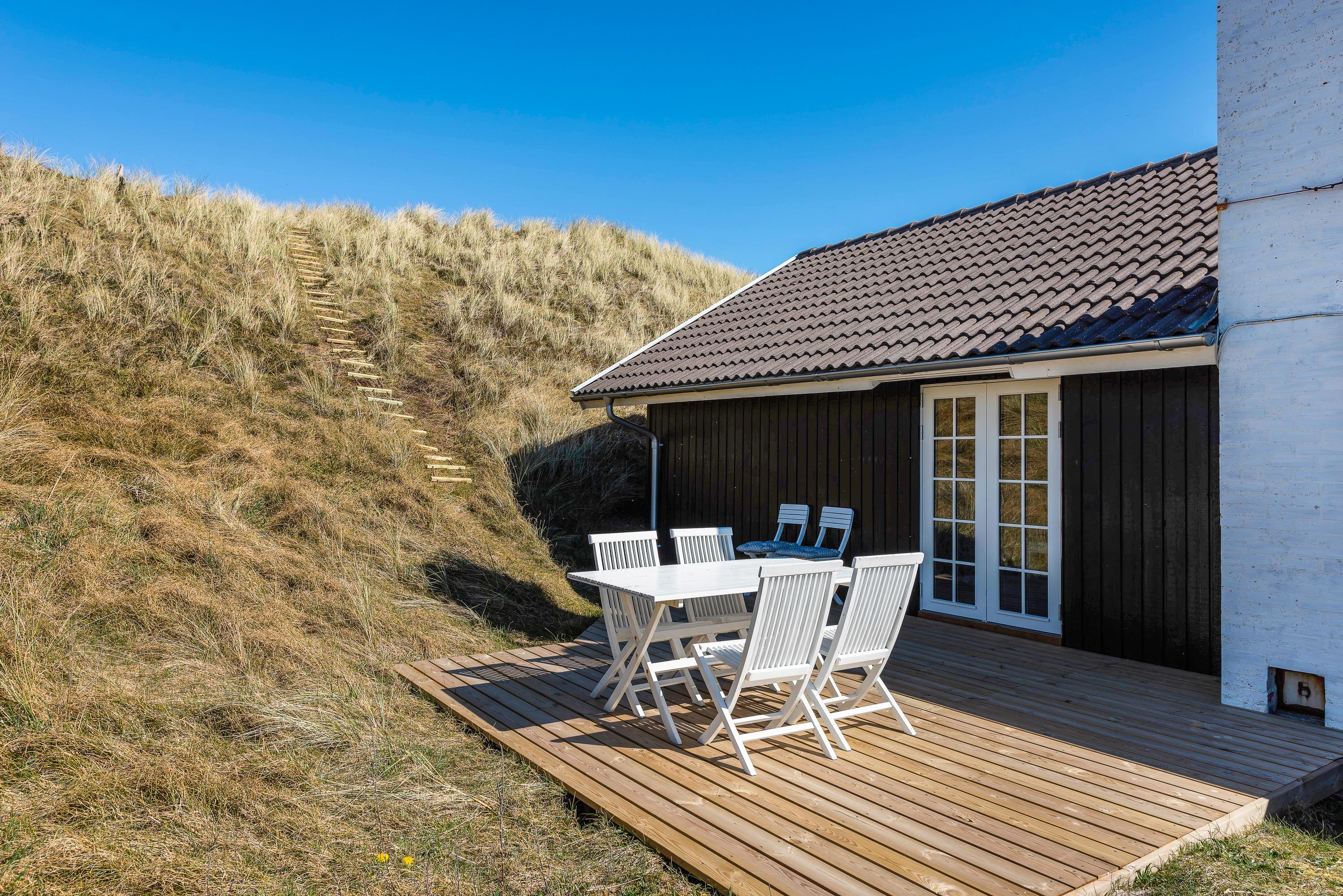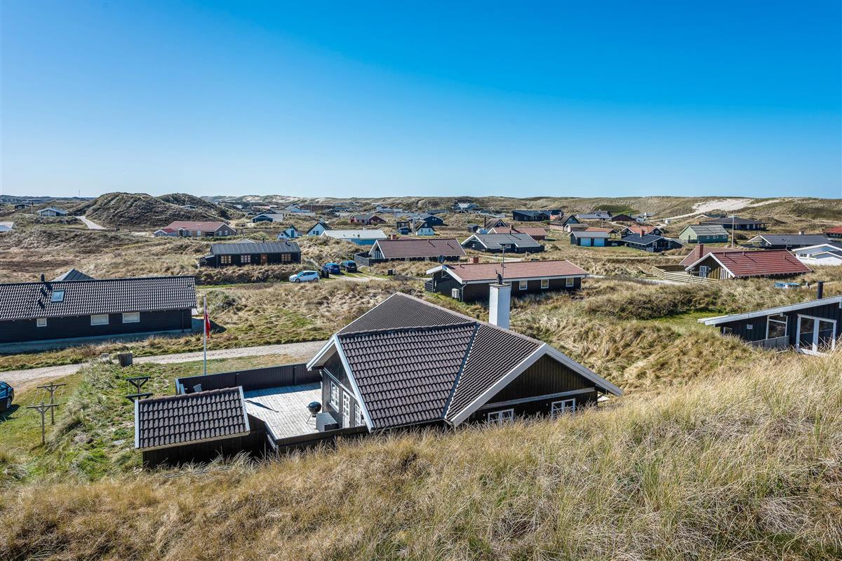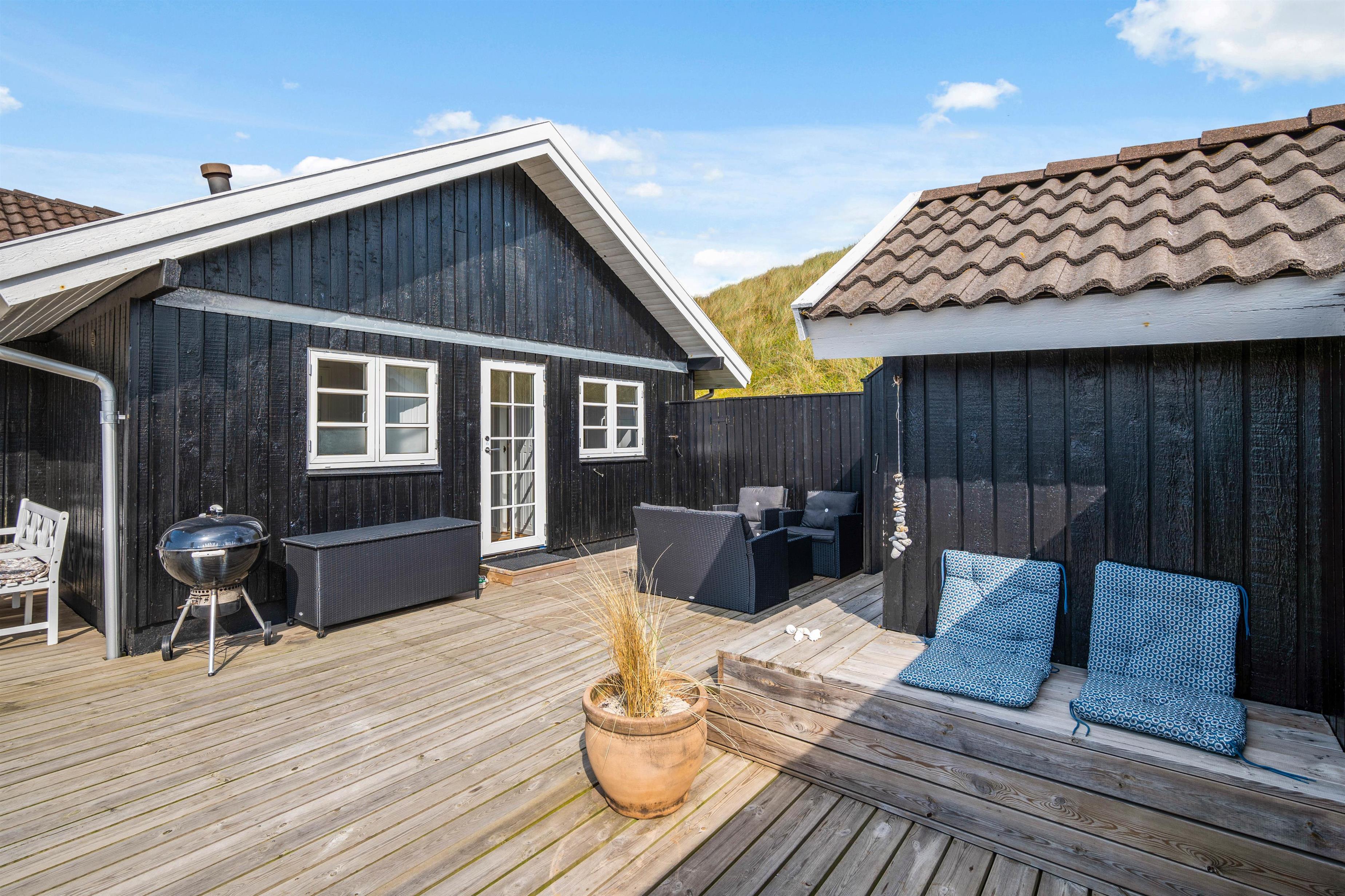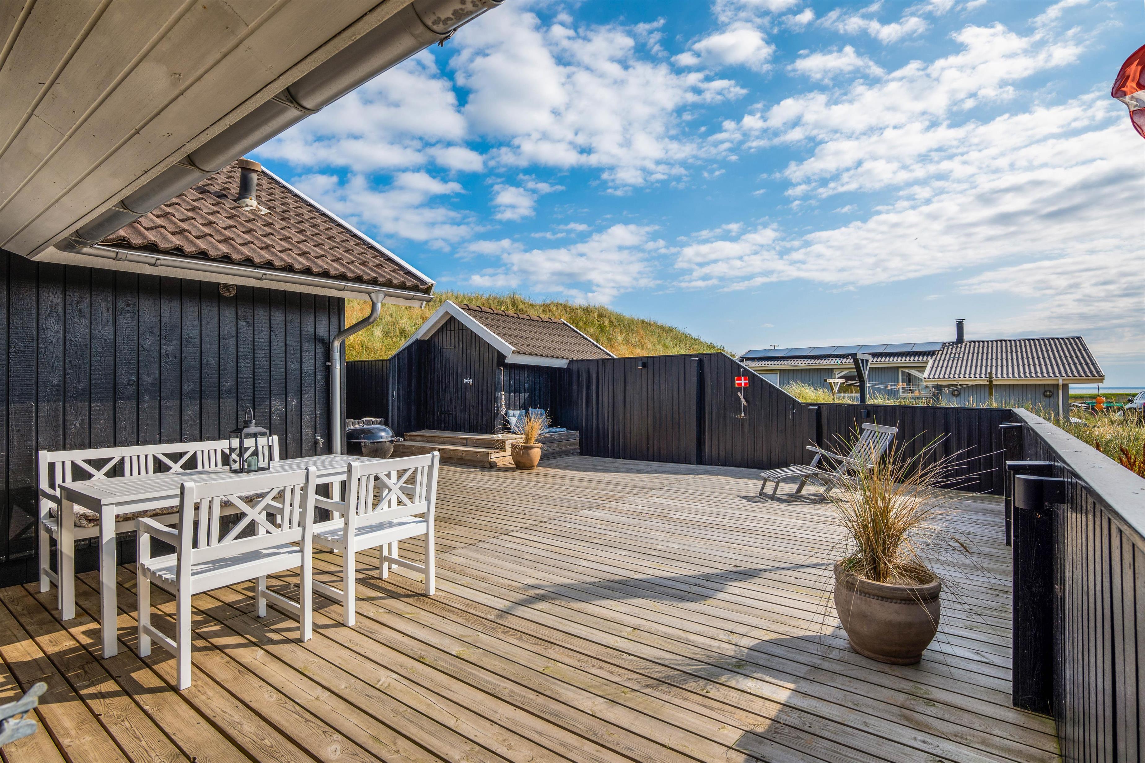 This comfortable holiday home sits on a fantastic dune plot with magnificent views over Ringkøbing Fjord. A beautiful, well-sheltered and partially covered terrace wraps around the holiday home. You can follow the sun's path and always find a sunny spot. Relax and enjoy the splendid fjord views.