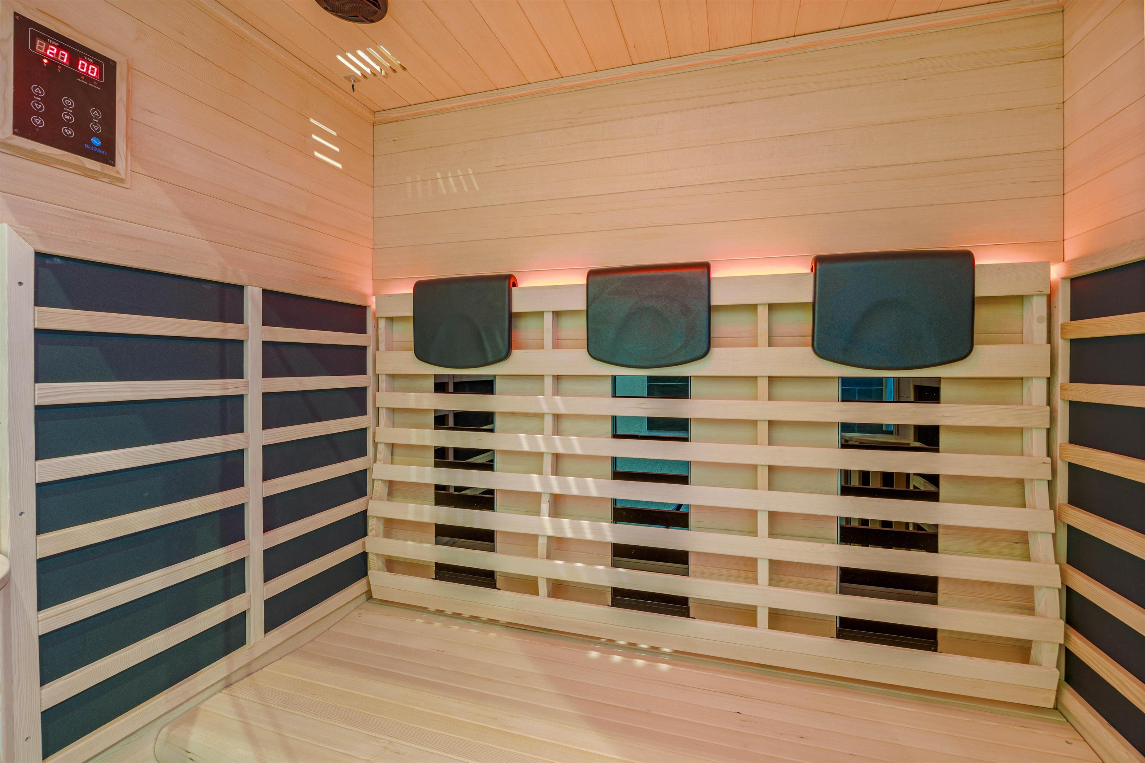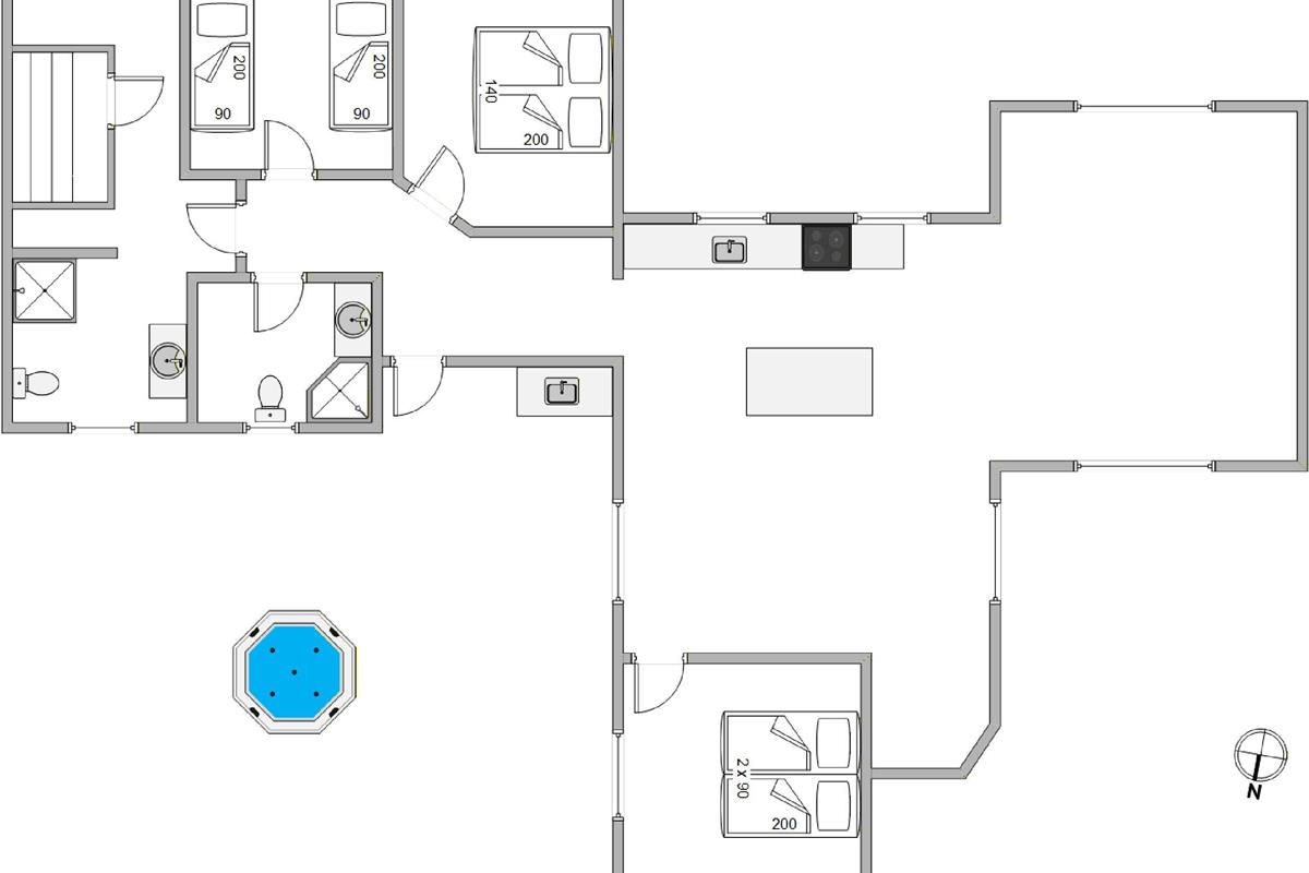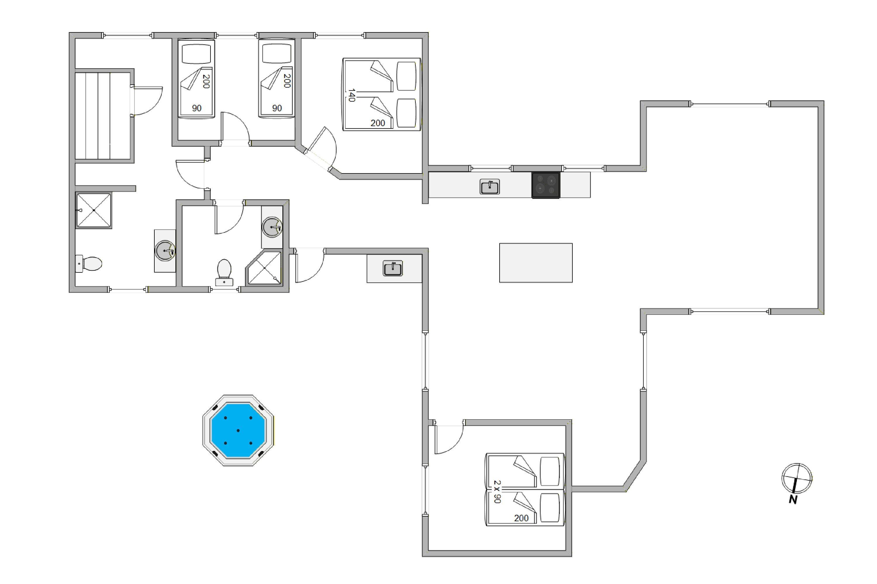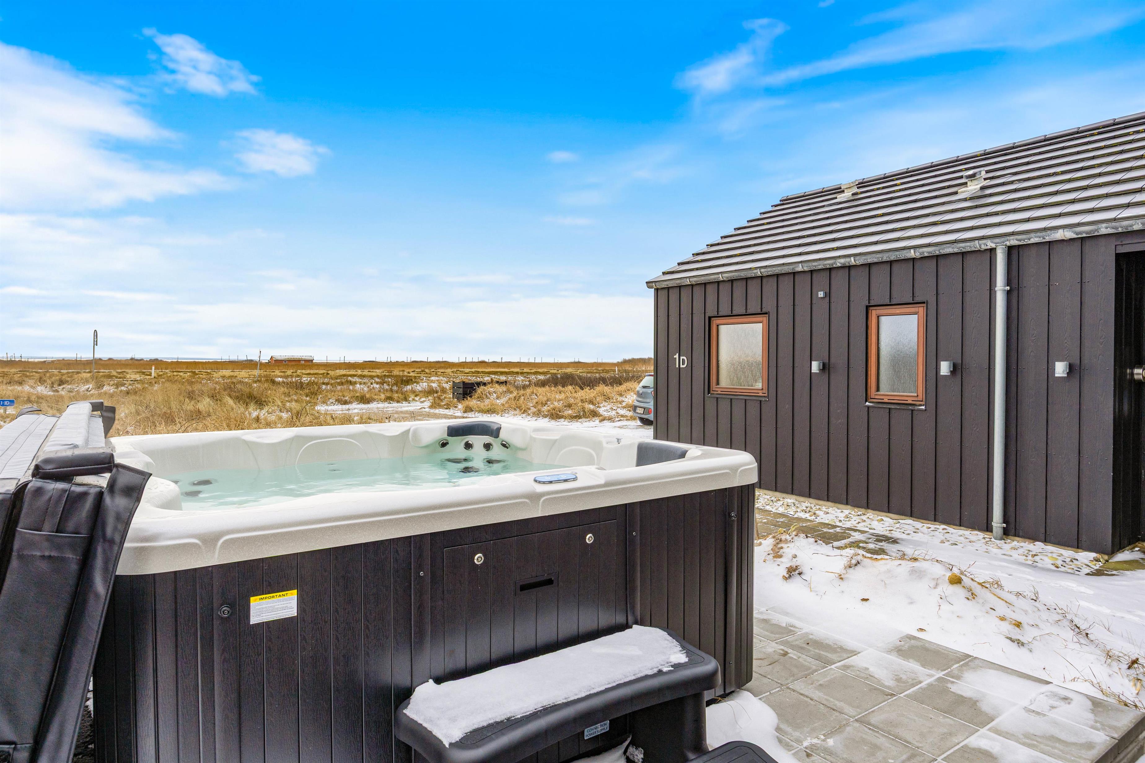 The holiday home offers three bedrooms. Two feature double beds, with one having adjustable mattresses. The third bedroom contains twin beds. Both bathrooms include a shower and underfloor heating. The main bathroom boasts a stunning brick-built shower, with the same high-quality bricks used in the large, beautiful round whirlpool.