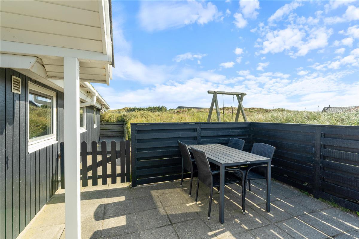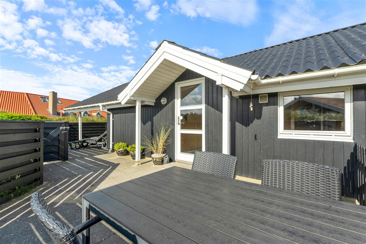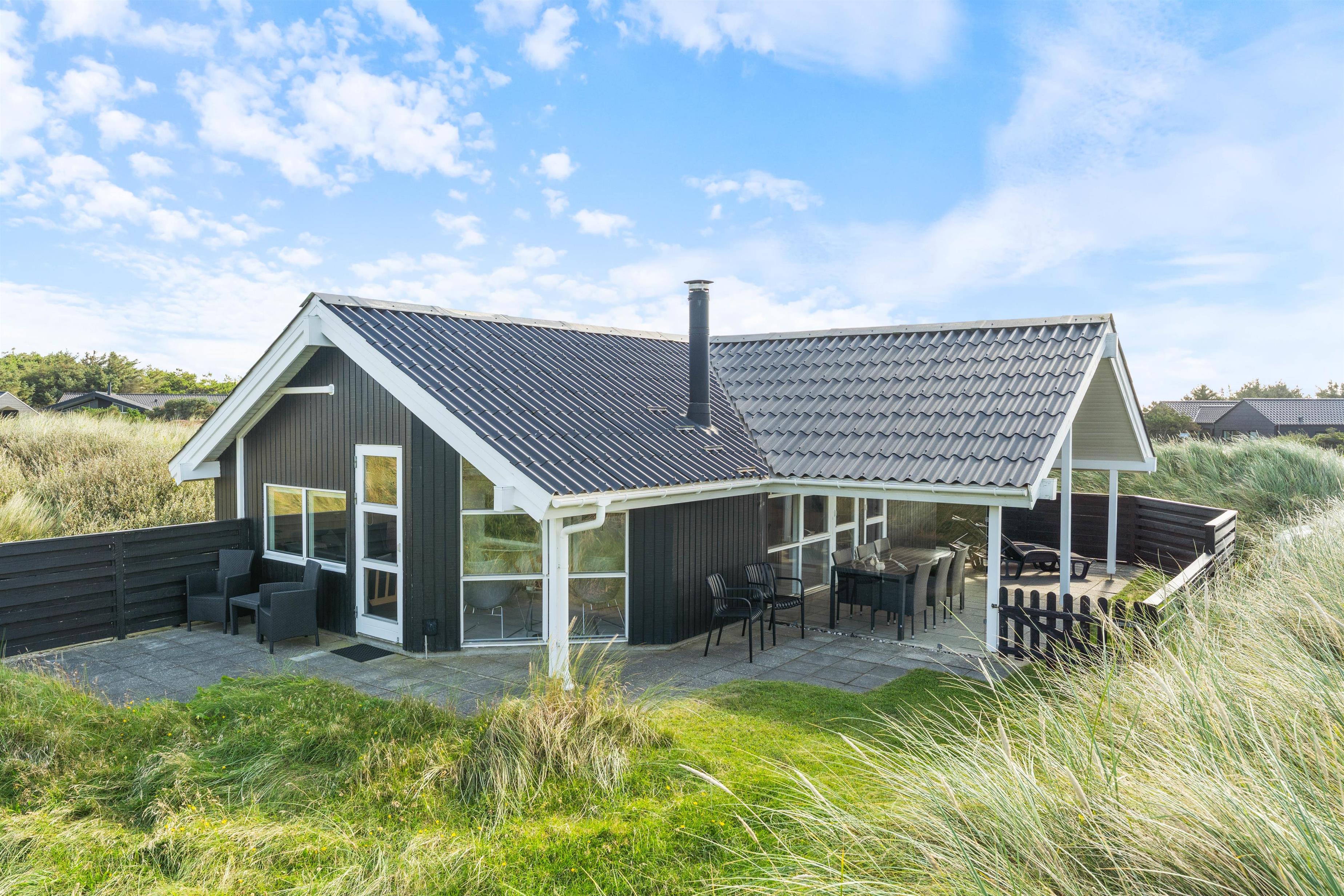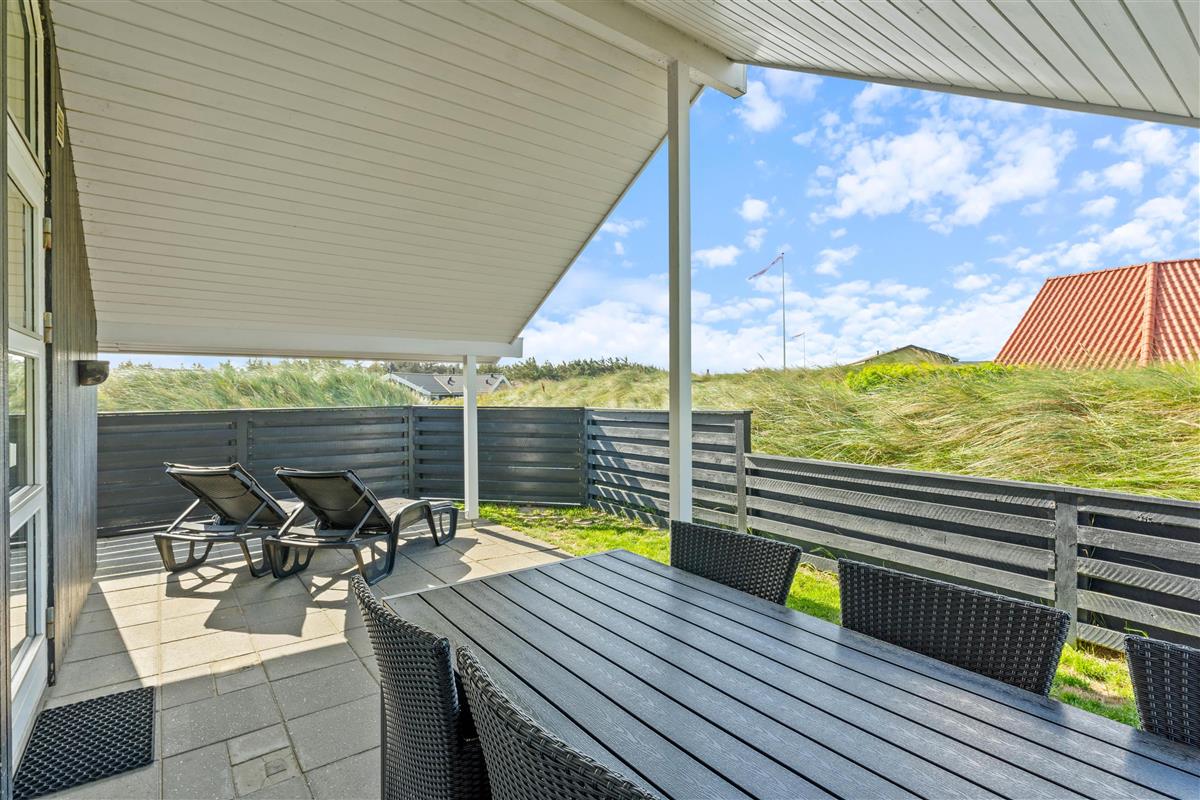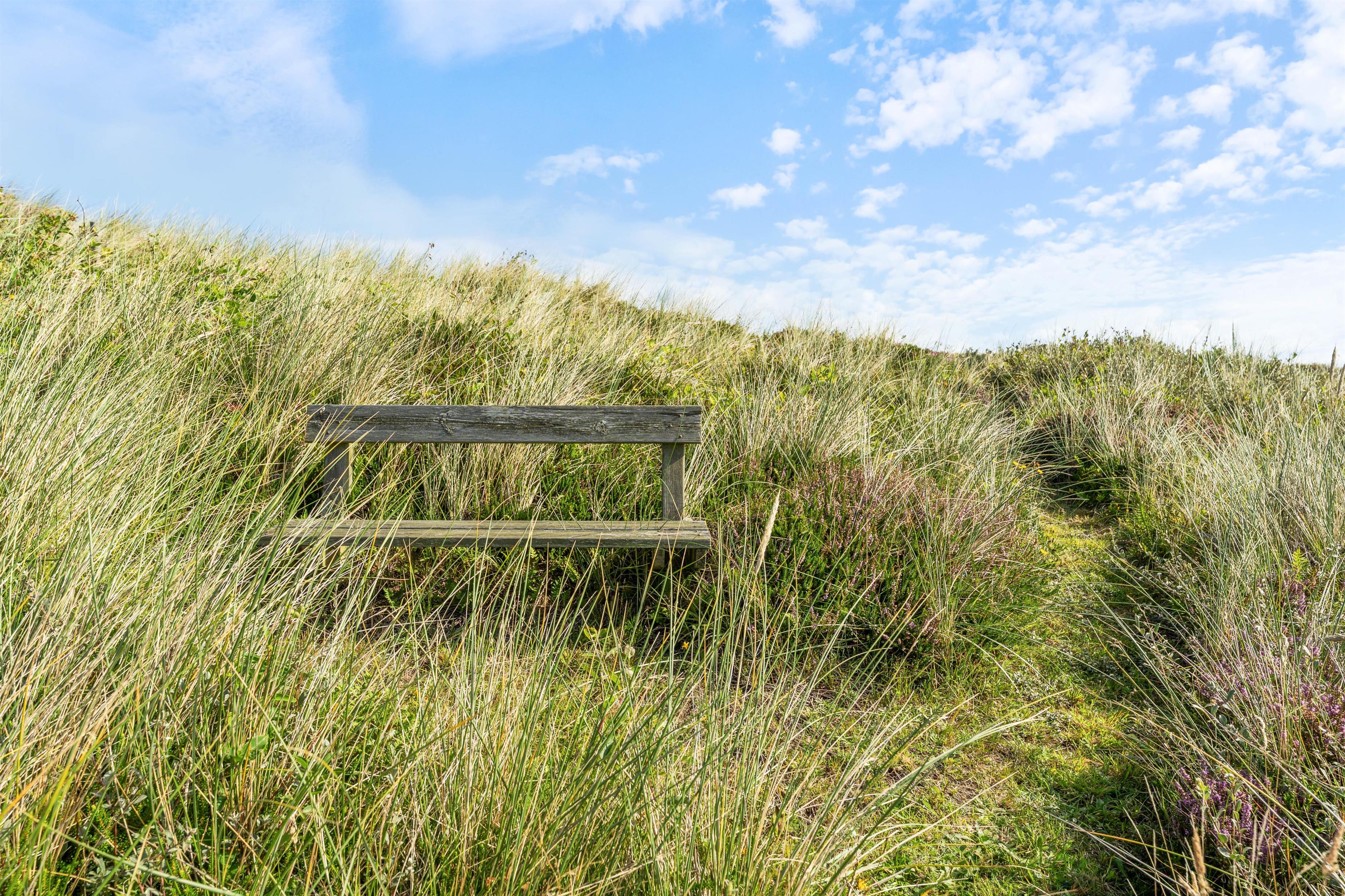 The terrace wraps almost entirely around the house, offering both good shelter and a covered section, plus a private lawn where children and dogs can play or simply relax. A surrounding dune provides additional protection and ensures peaceful days in the sun.