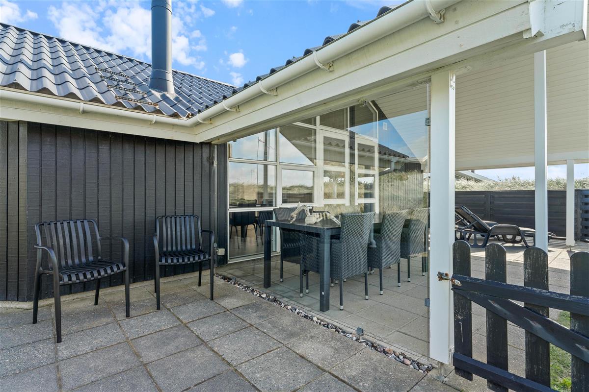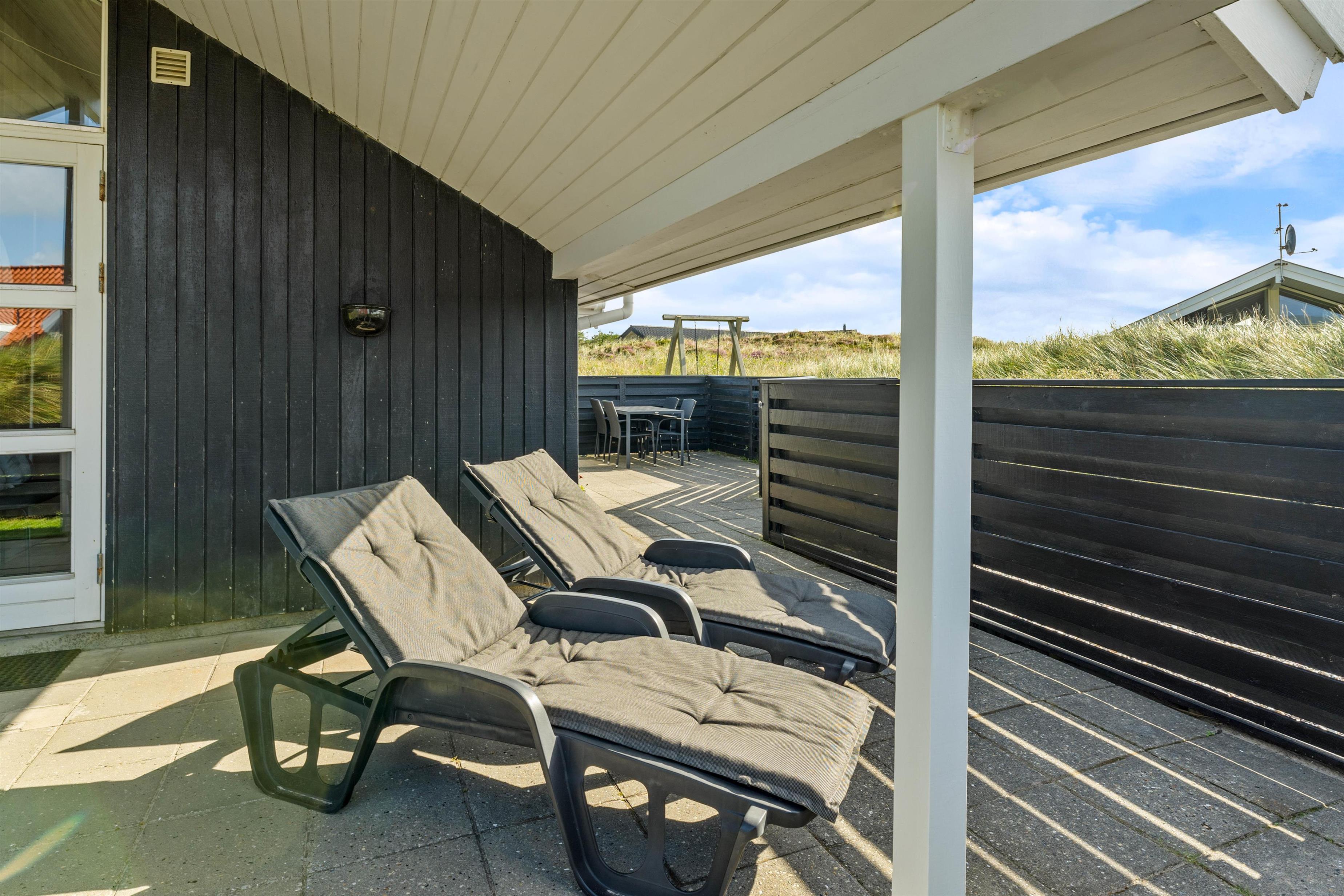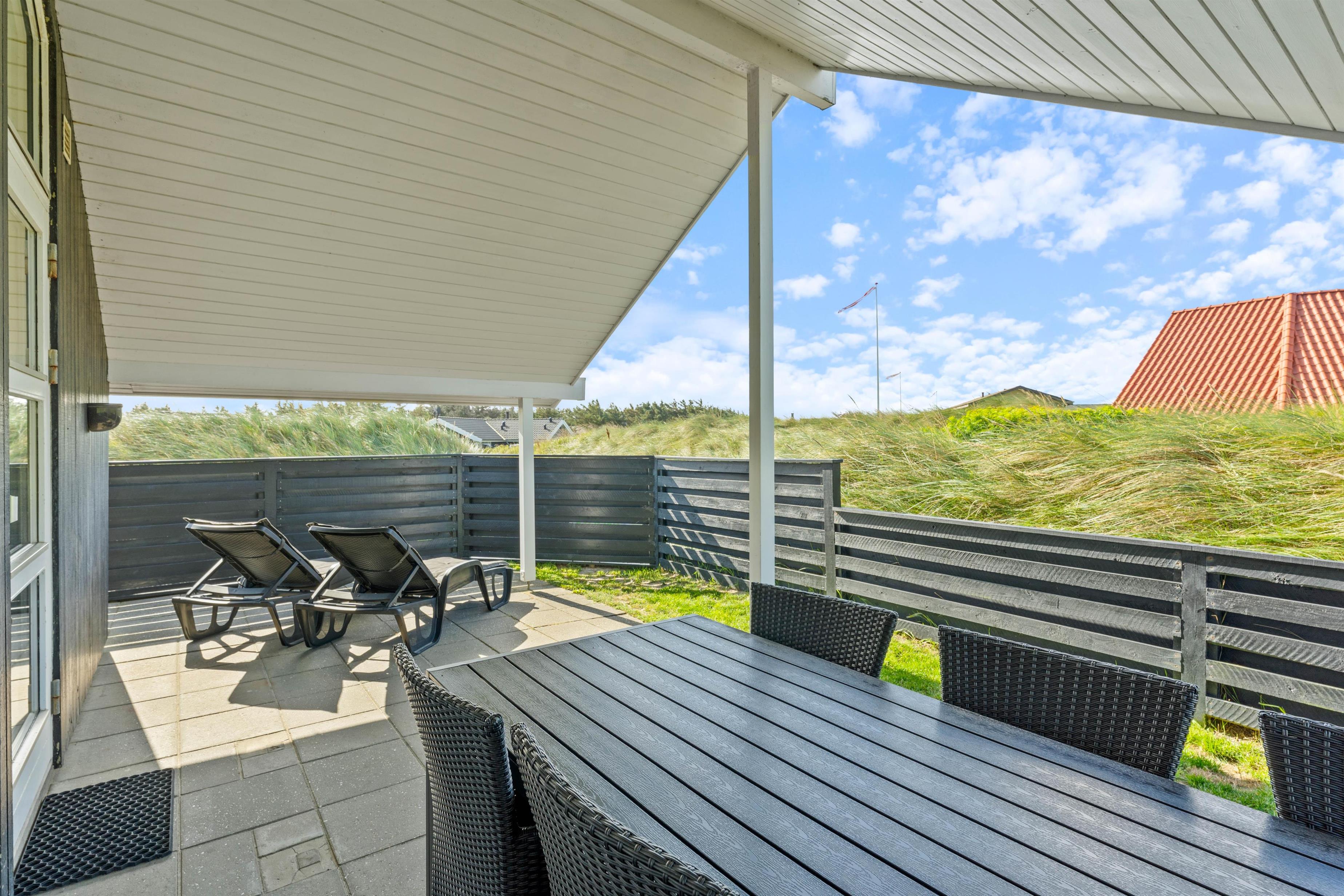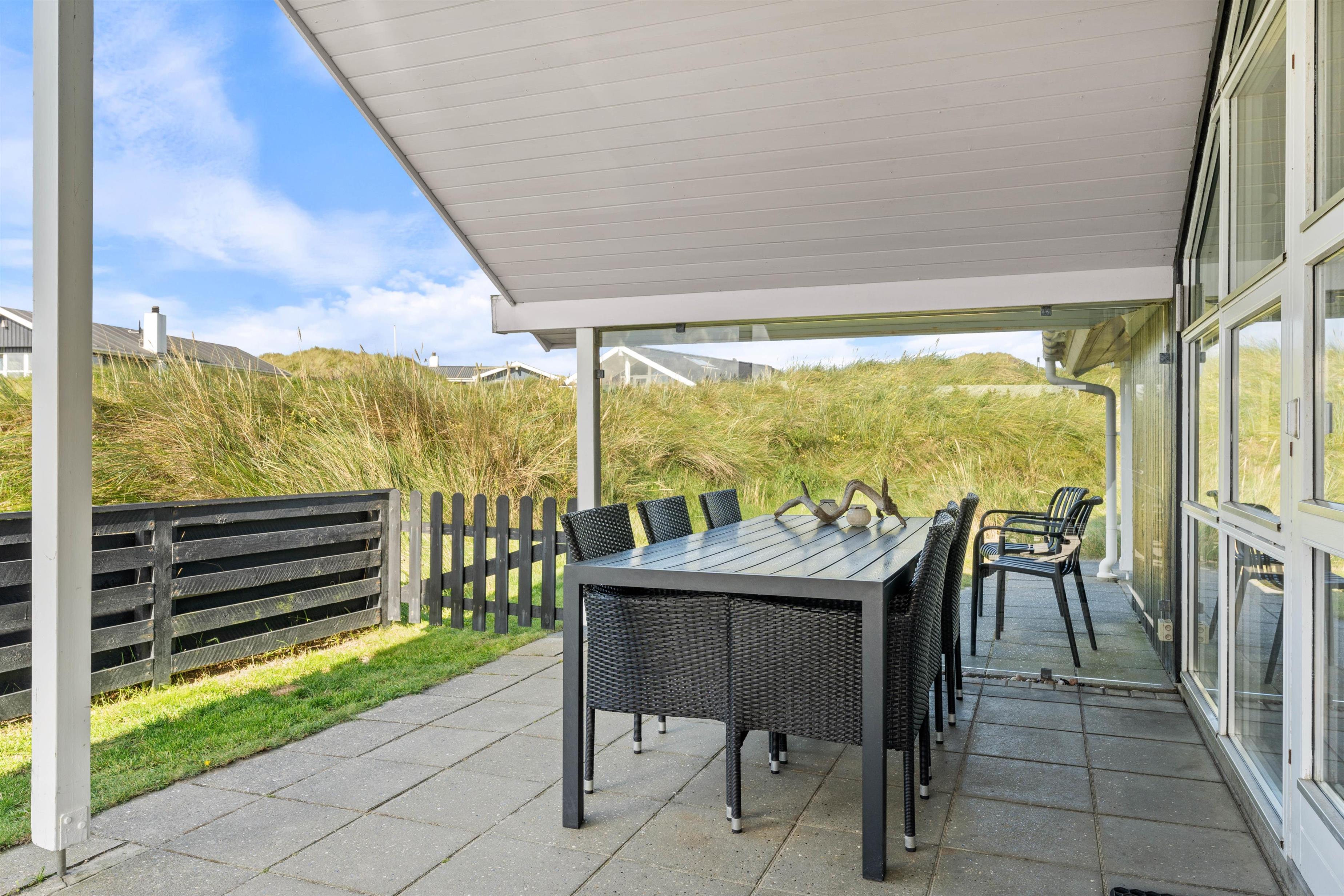 The terrace wraps almost entirely around the house, offering both good shelter and a covered section, plus a private lawn where children and dogs can play or simply relax. A surrounding dune provides additional protection and ensures peaceful days in the sun.