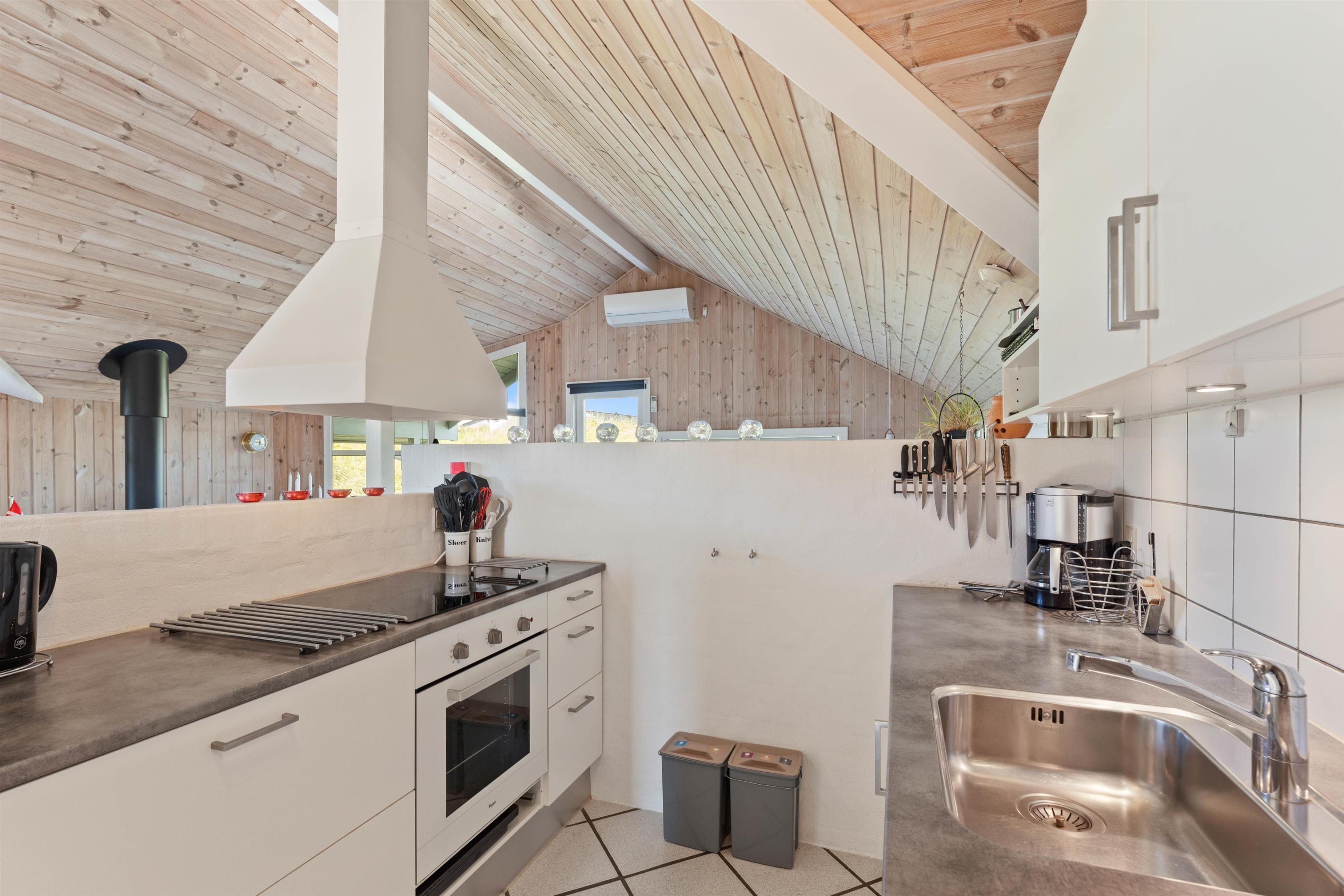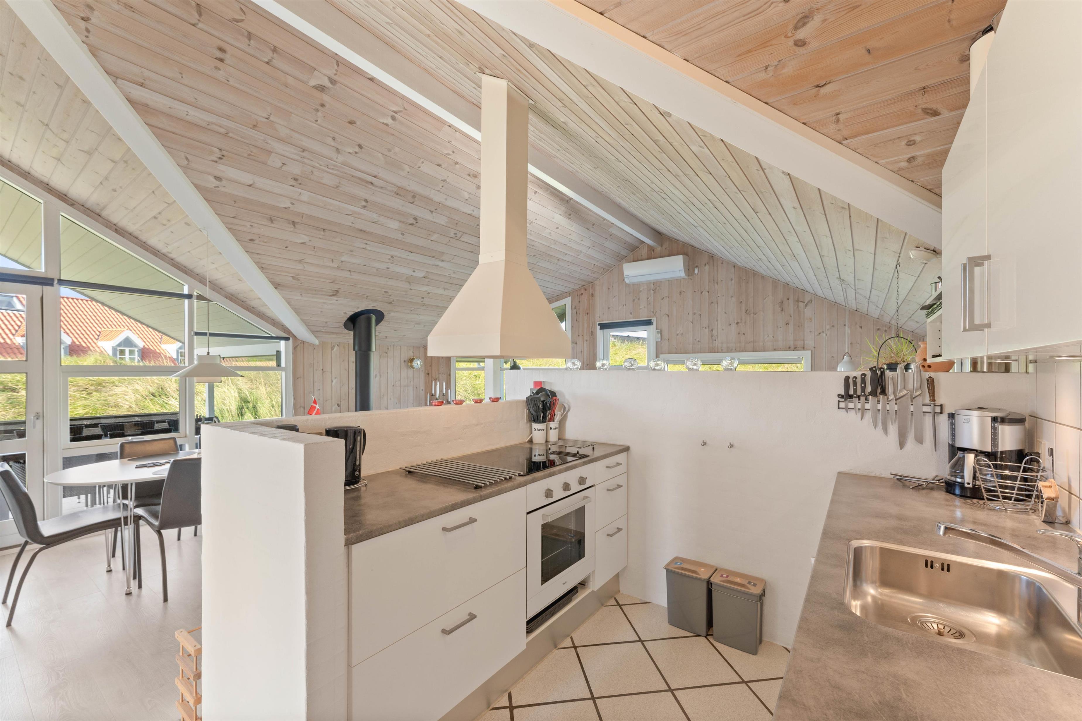 This cosy wooden house impresses with its classic charm and beach-close location. The heart of the holiday home is the open-plan living and cooking area with its large windows, perfect for shared activities and cooking together.