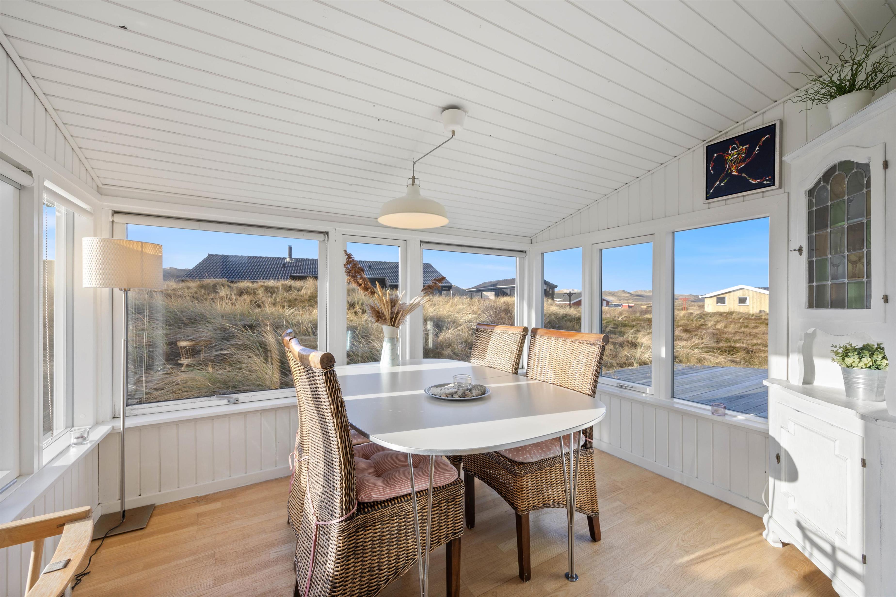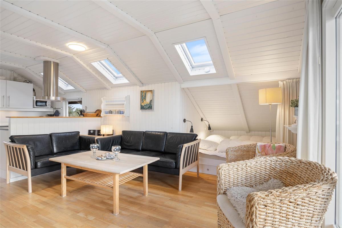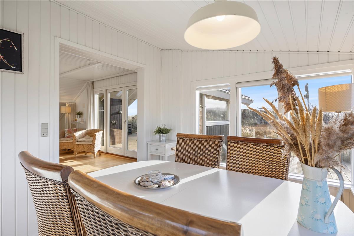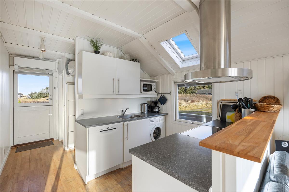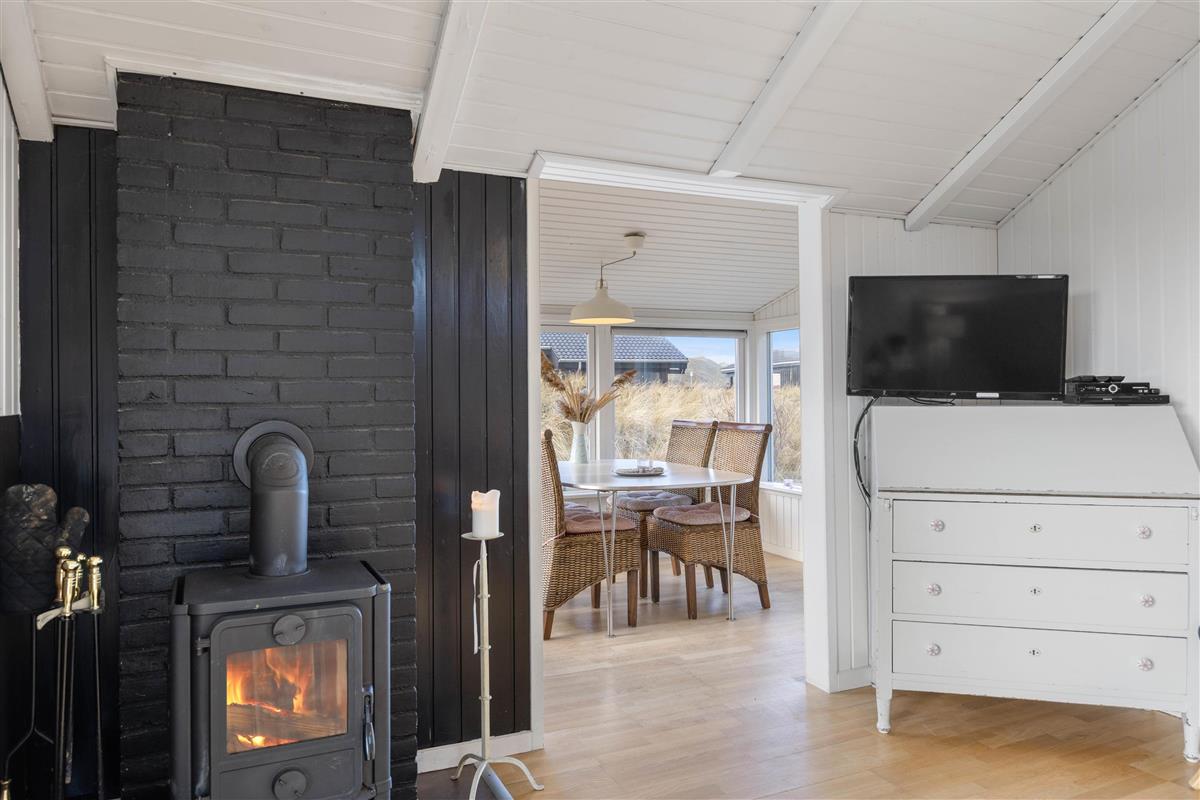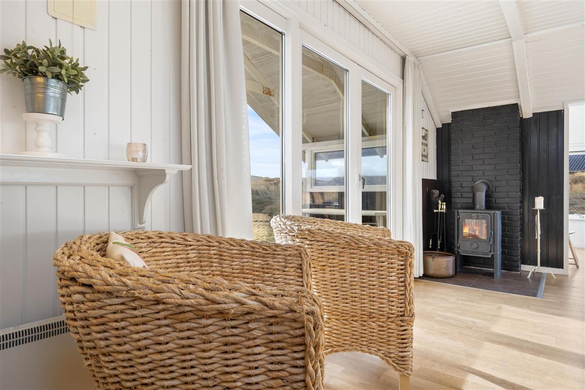 The conservatory offers particularly splendid views over the Årgab dunes. Here you can relax together, dine and enjoy quality time. The heart of the house is the open-plan kitchen and living area, perfect for cooking together and unwinding. The wood-burning stove in the living area provides warmth on cooler days whilst creating a cosy holiday atmosphere. Two bedrooms, plus a snug sleeping alcove in the living room, provide space for up to 6 people, and your four-legged family members – dogs – will feel right at home too.