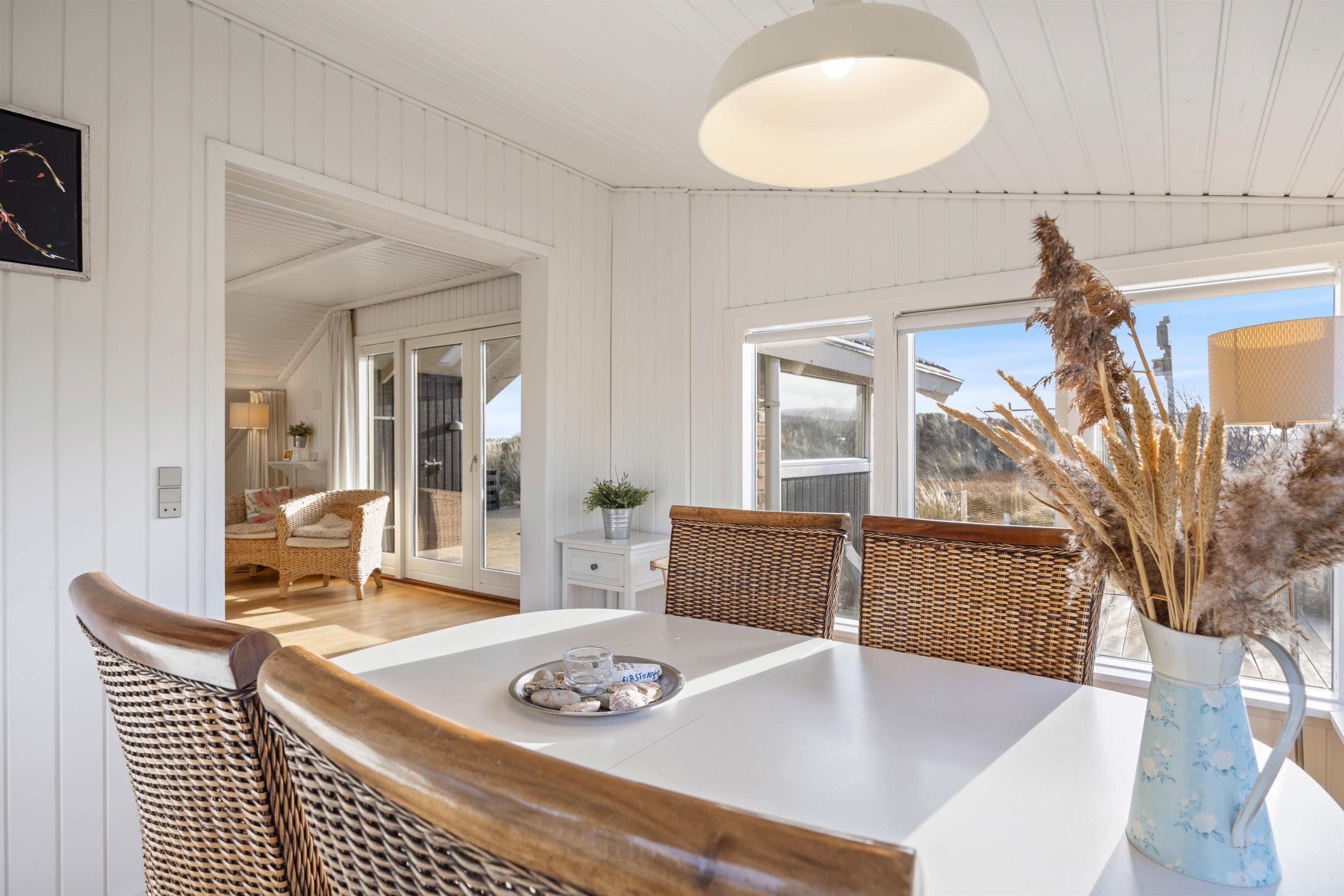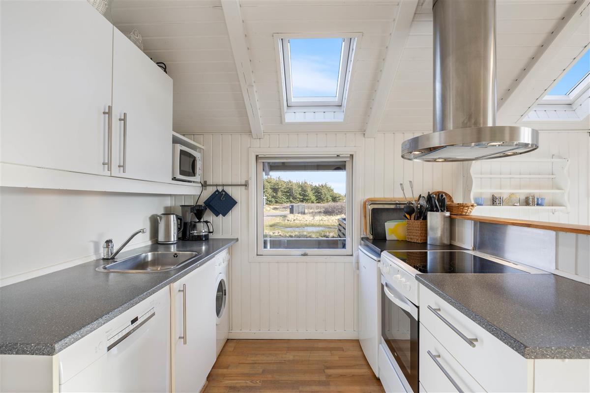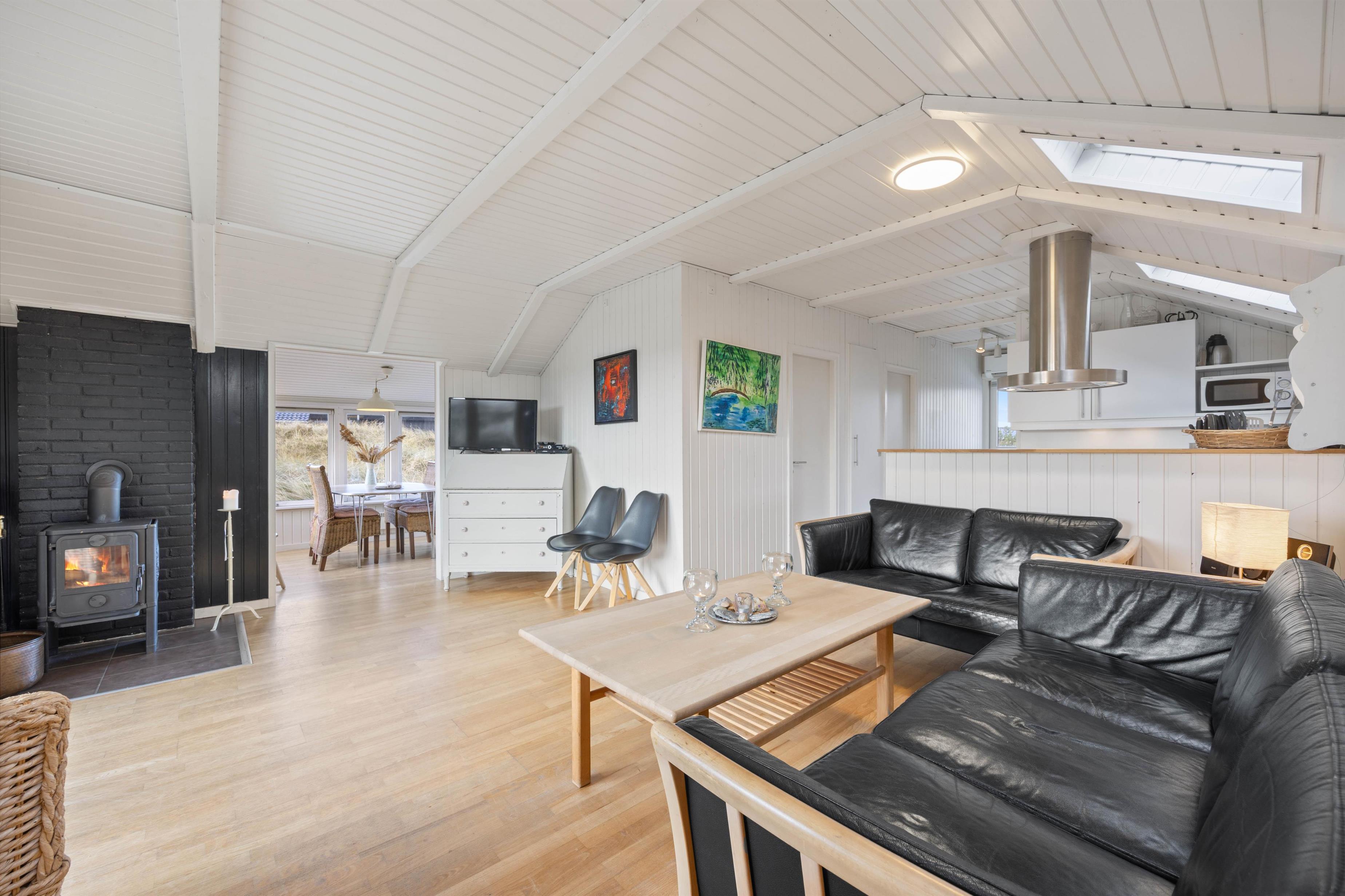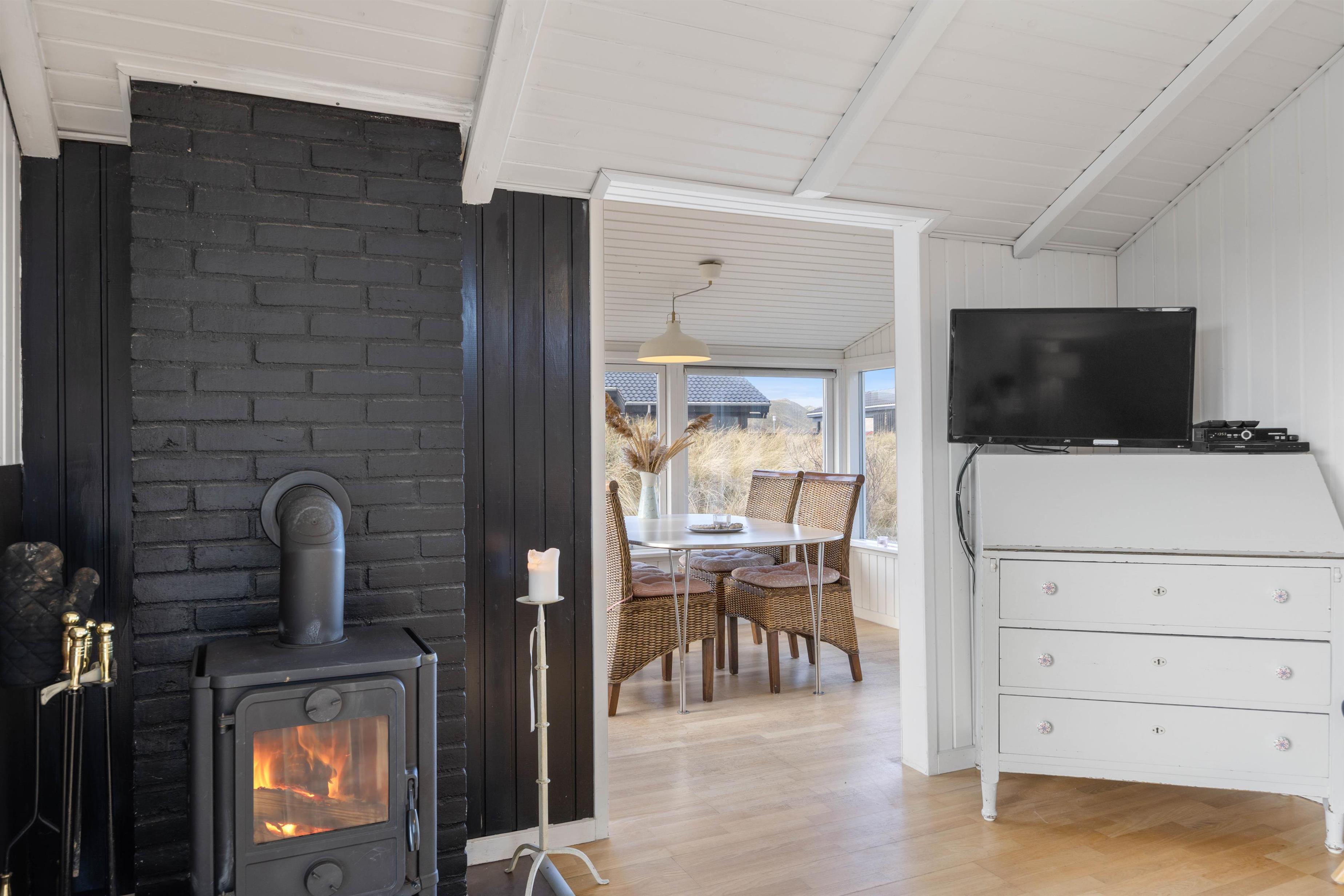 The conservatory offers particularly splendid views over the Årgab dunes. Here you can relax together, dine and enjoy quality time. The heart of the house is the open-plan kitchen and living area, perfect for cooking together and unwinding. The wood-burning stove in the living area provides warmth on cooler days whilst creating a cosy holiday atmosphere. Two bedrooms, plus a snug sleeping alcove in the living room, provide space for up to 6 people, and your four-legged family members – dogs – will feel right at home too.