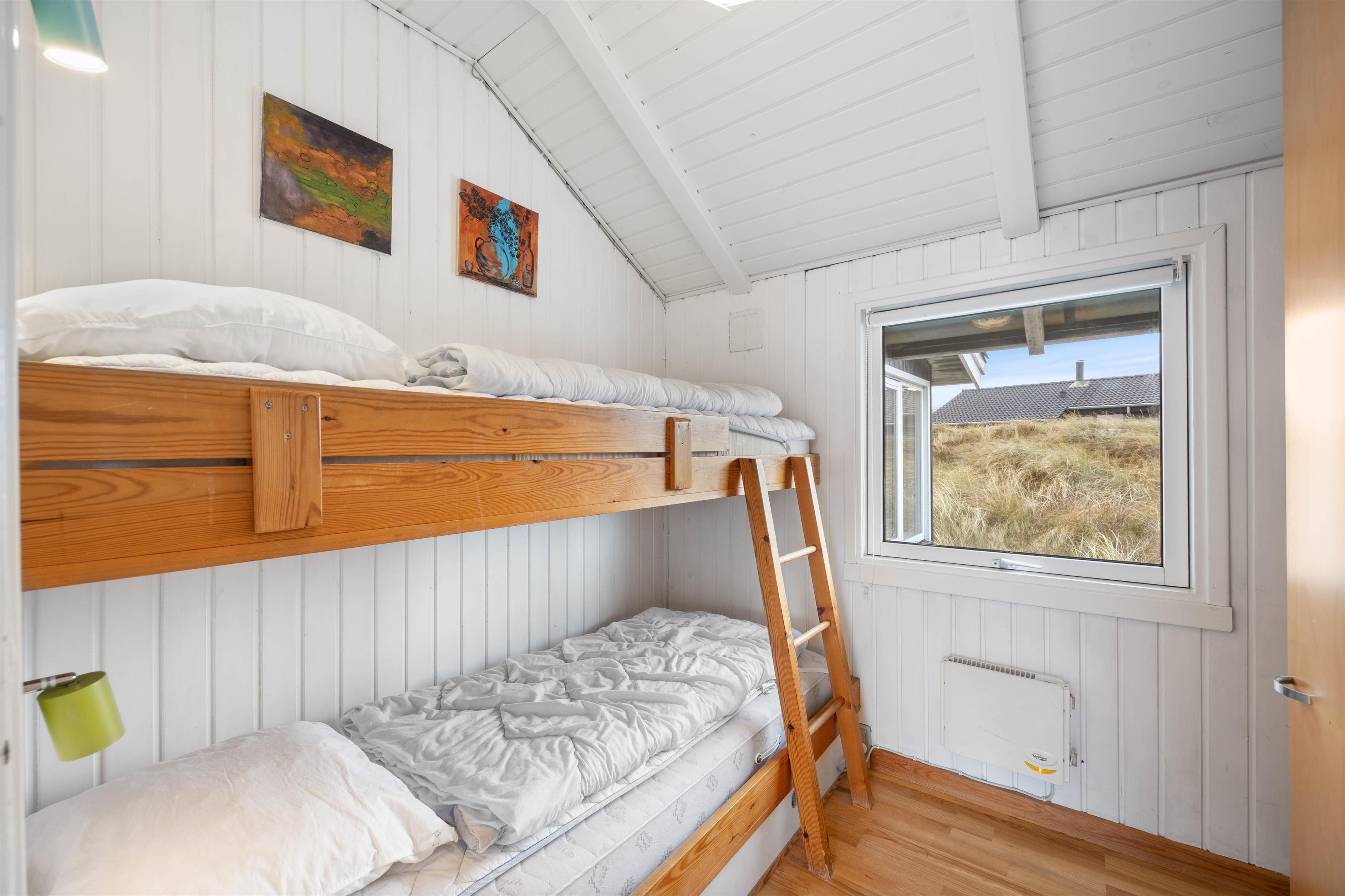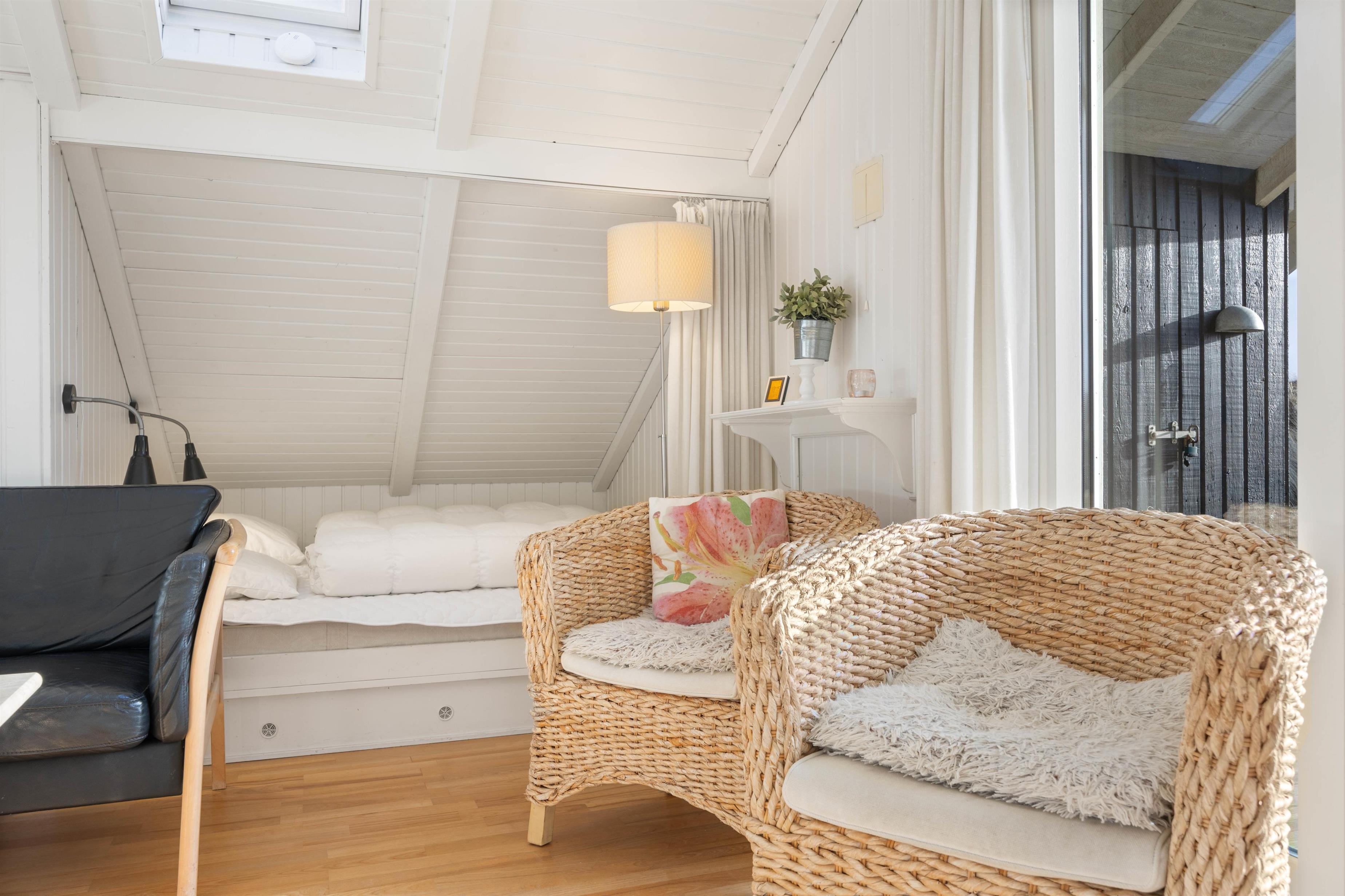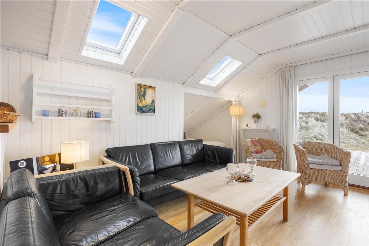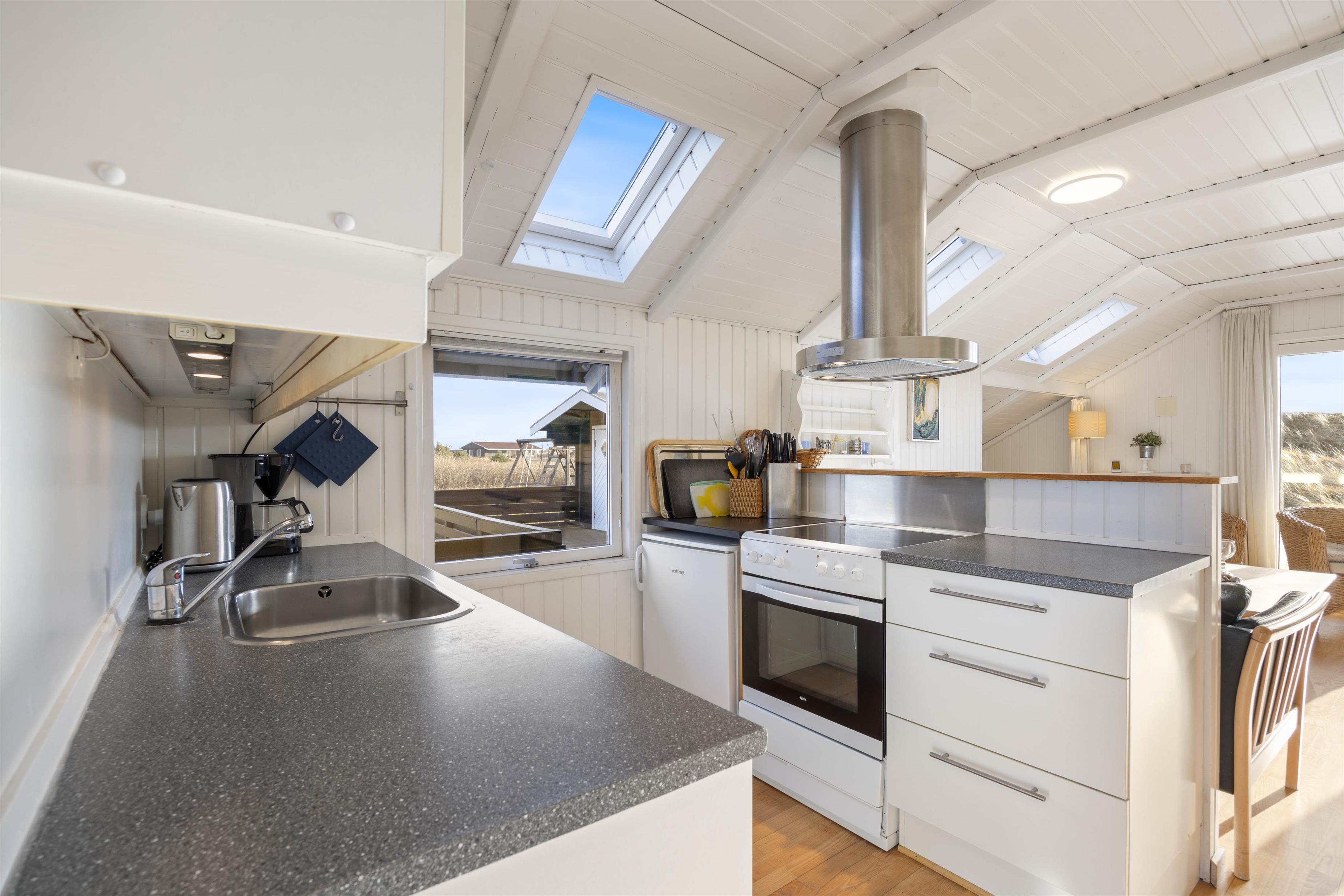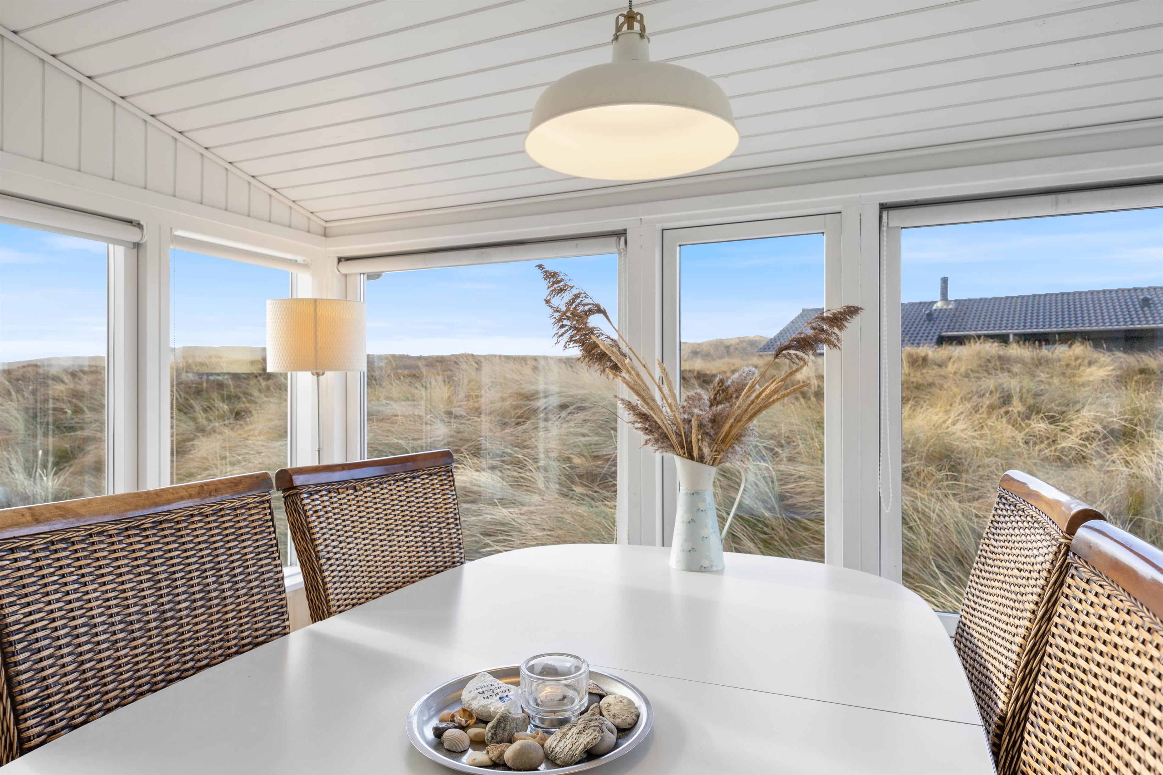 The conservatory offers particularly splendid views over the Årgab dunes. Here you can relax together, dine and enjoy quality time. The heart of the house is the open-plan kitchen and living area, perfect for cooking together and unwinding. The wood-burning stove in the living area provides warmth on cooler days whilst creating a cosy holiday atmosphere. Two bedrooms, plus a snug sleeping alcove in the living room, provide space for up to 6 people, and your four-legged family members – dogs – will feel right at home too.