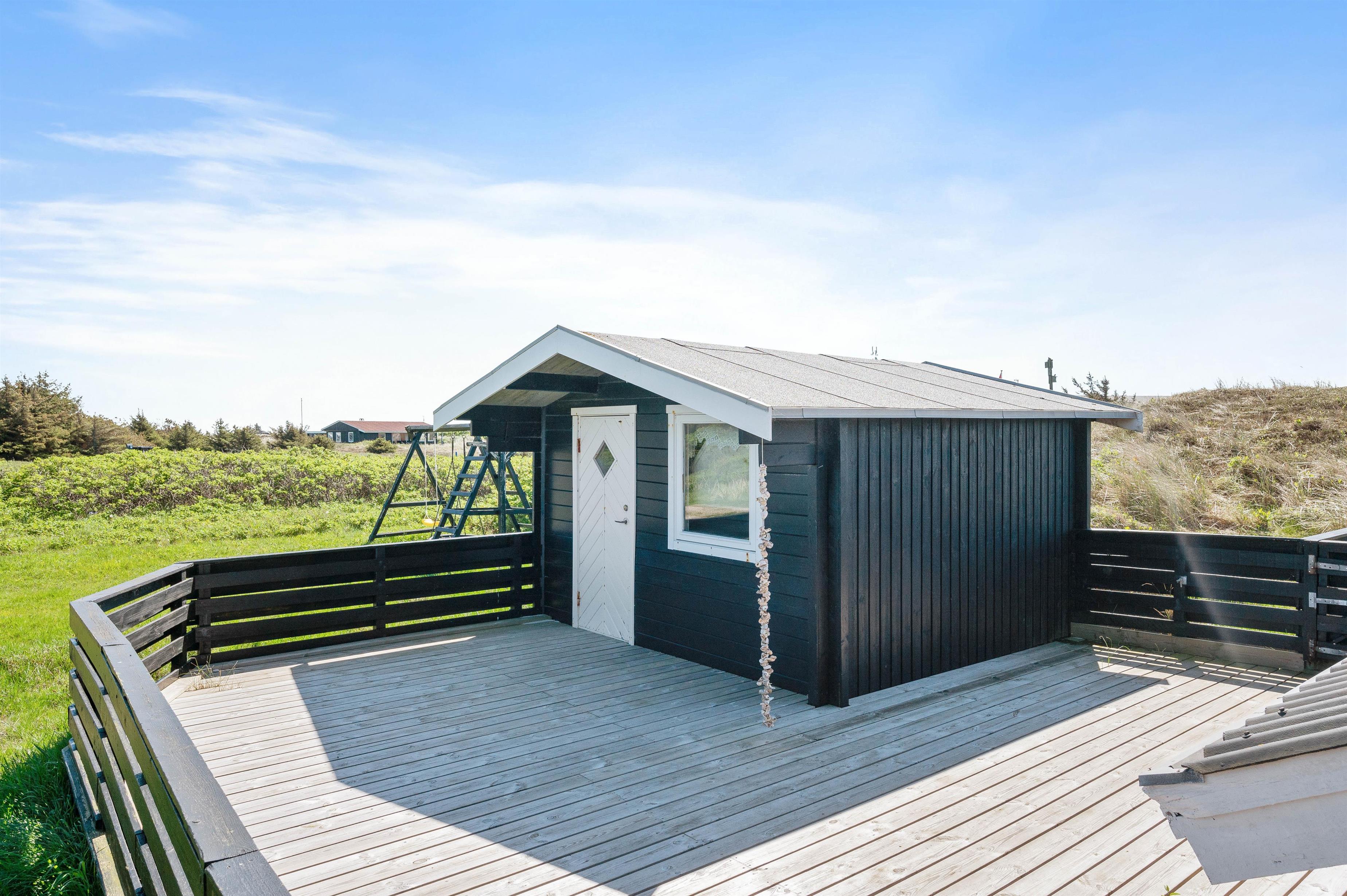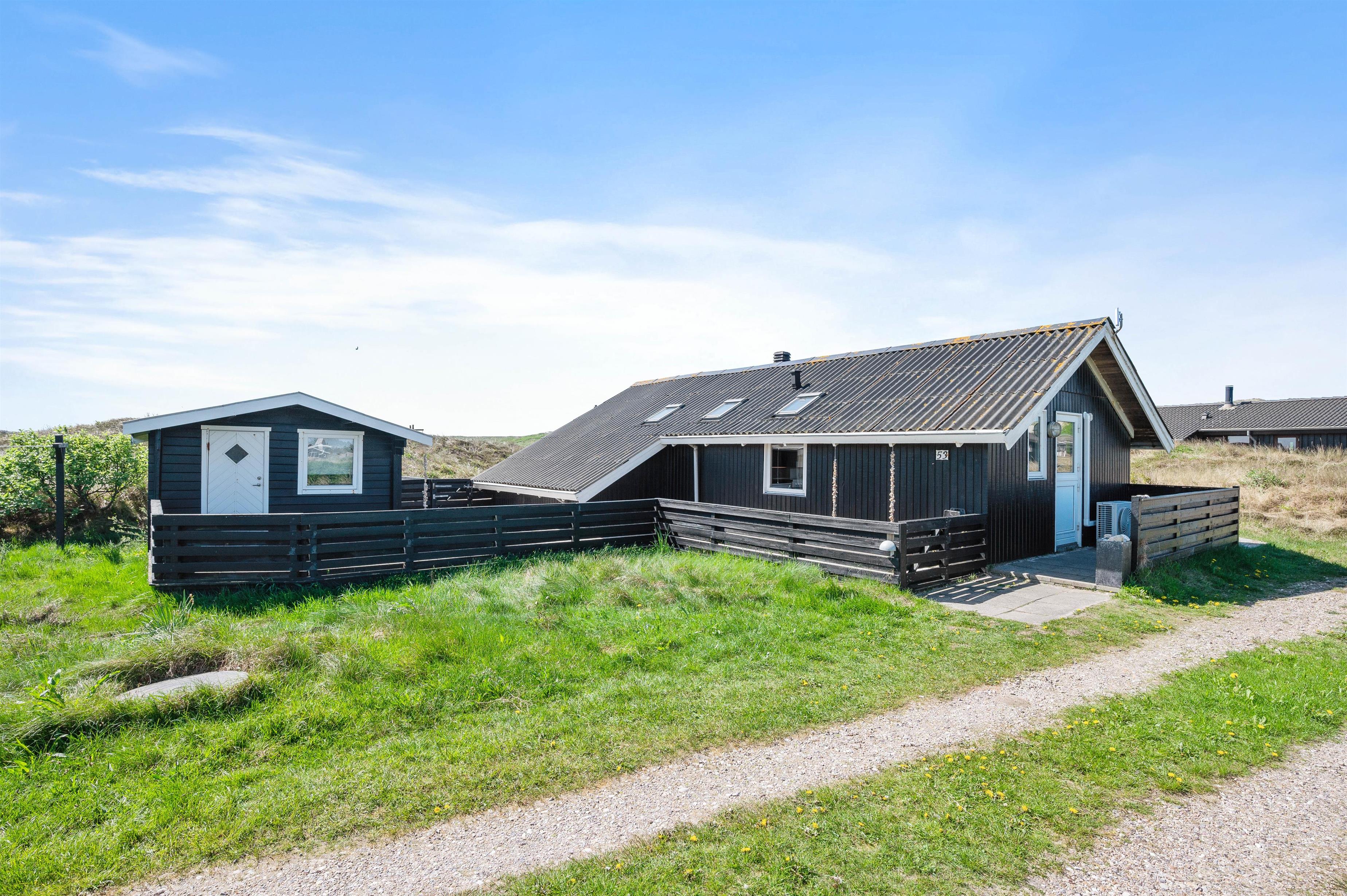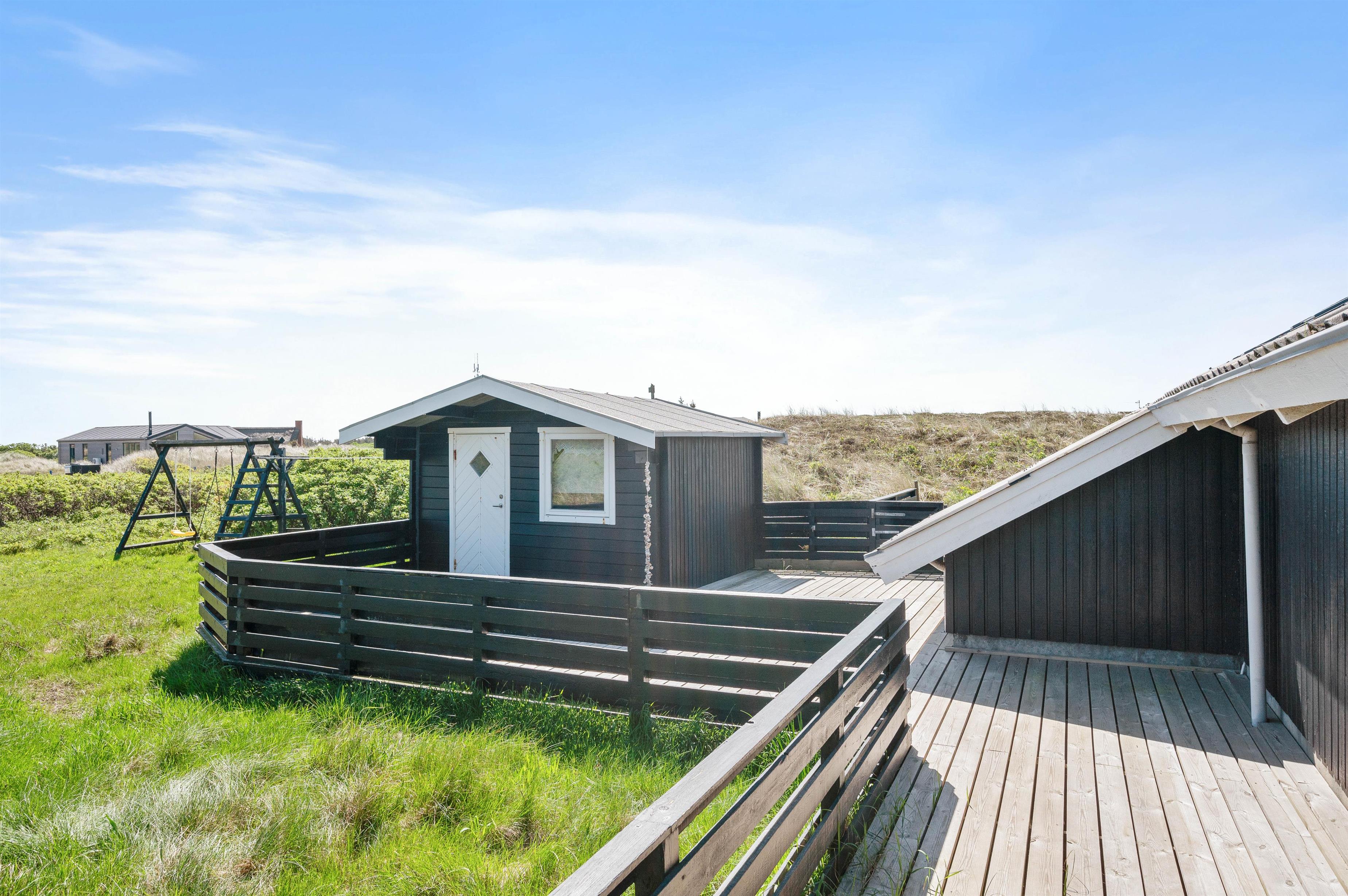 During the summer season, the local shop with bakery at the neighbouring campsite (200 metres away) is open. Here you can get fresh rolls daily and do your shopping. For larger shopping trips and dining out, the fishing town of Hvide Sande is just minutes away by car or easily accessible by bicycle. In this small coastal town with its fishing harbour and lock to Ringkøbing Fjord, you can watch the bustling harbour activity, dine in delightful restaurants and stylish cafés, or browse charming souvenir shops. For further excursions, the nearby historic harbour town of Ringkøbing is recommended.