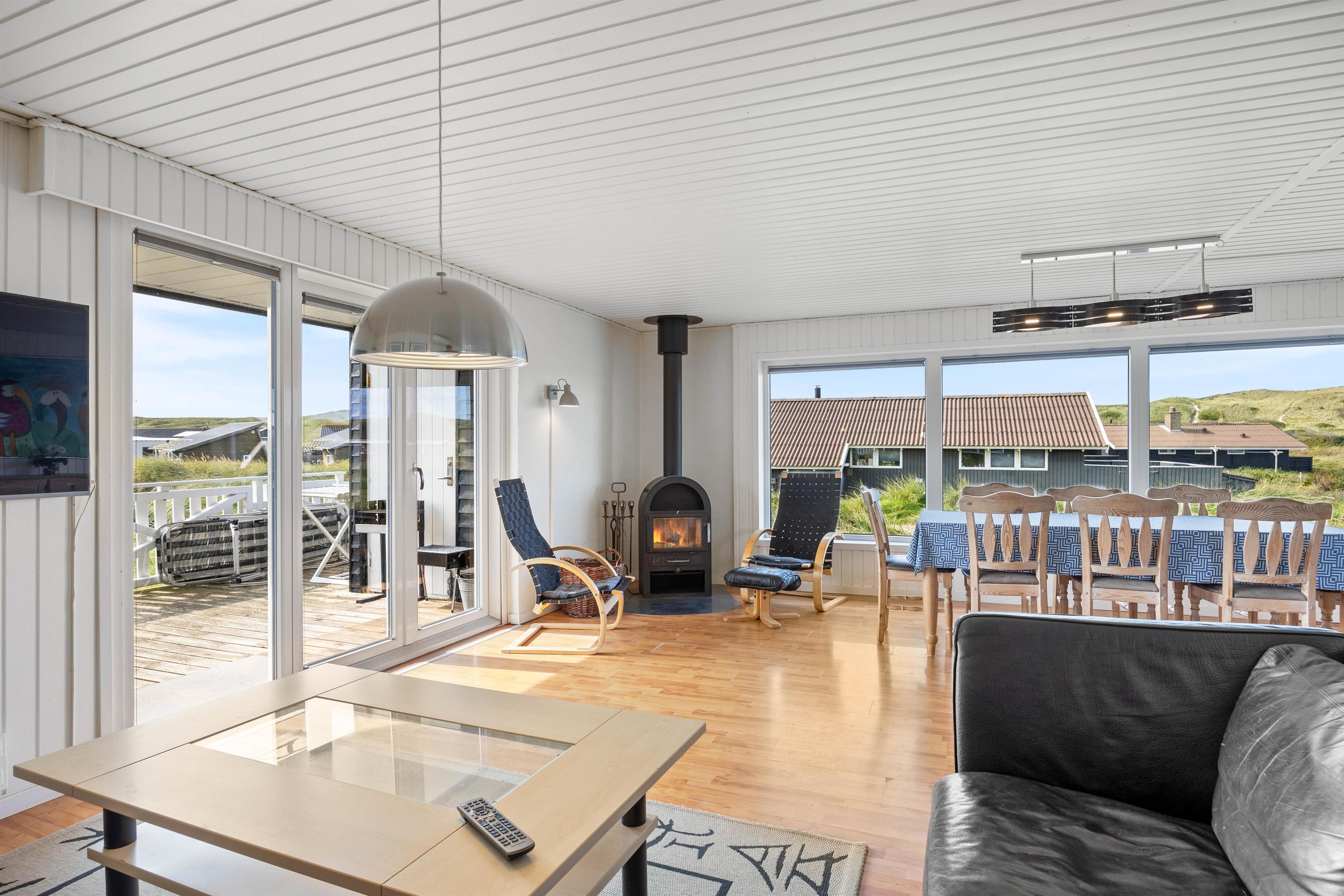 Large windows in the living area flood the house with natural light, while the wood-burning stove creates a cosy atmosphere on cooler evenings. The well-equipped kitchen opens onto the living room, creating a spacious open-plan area.