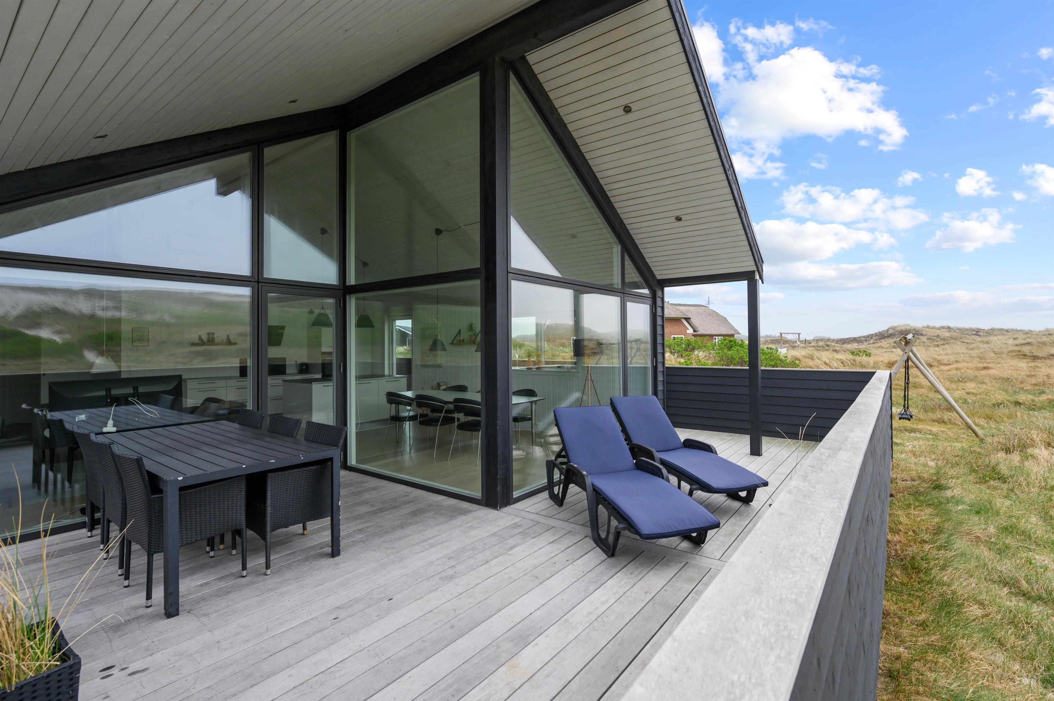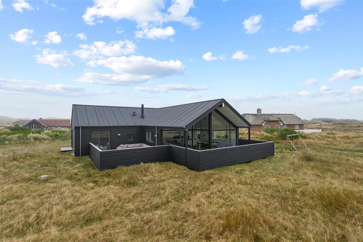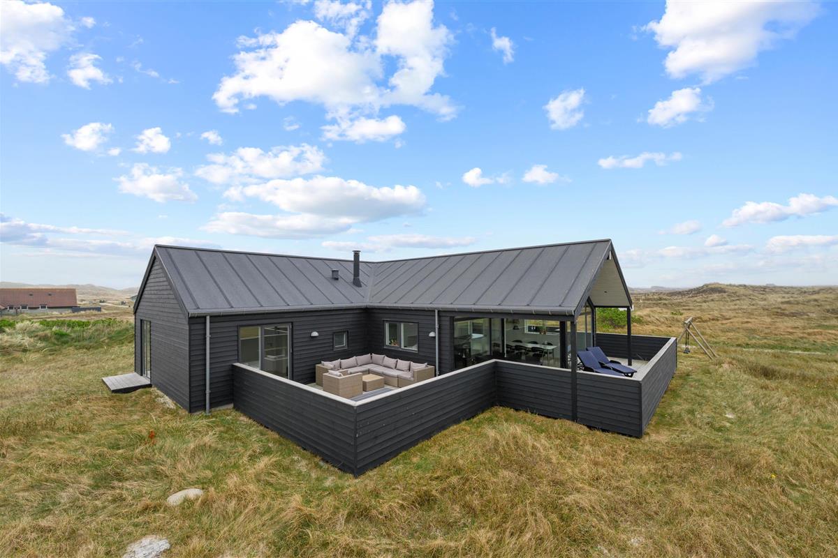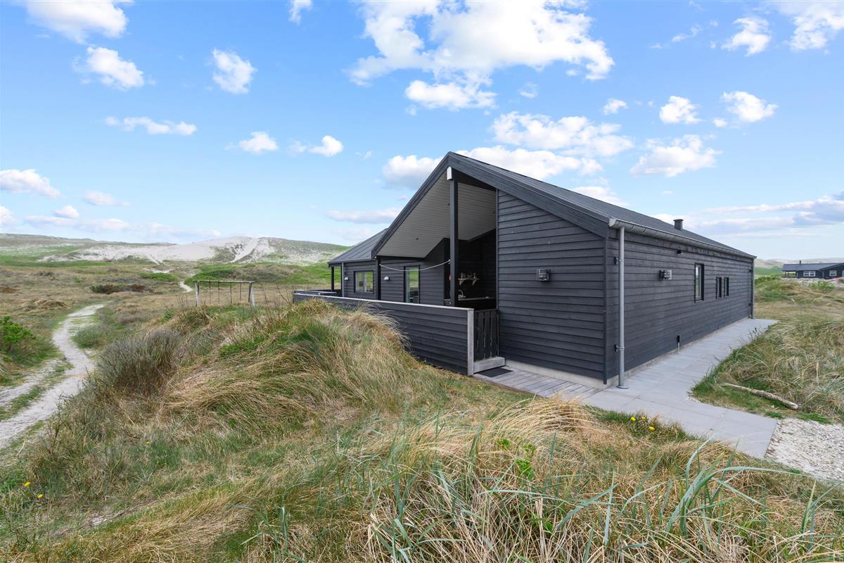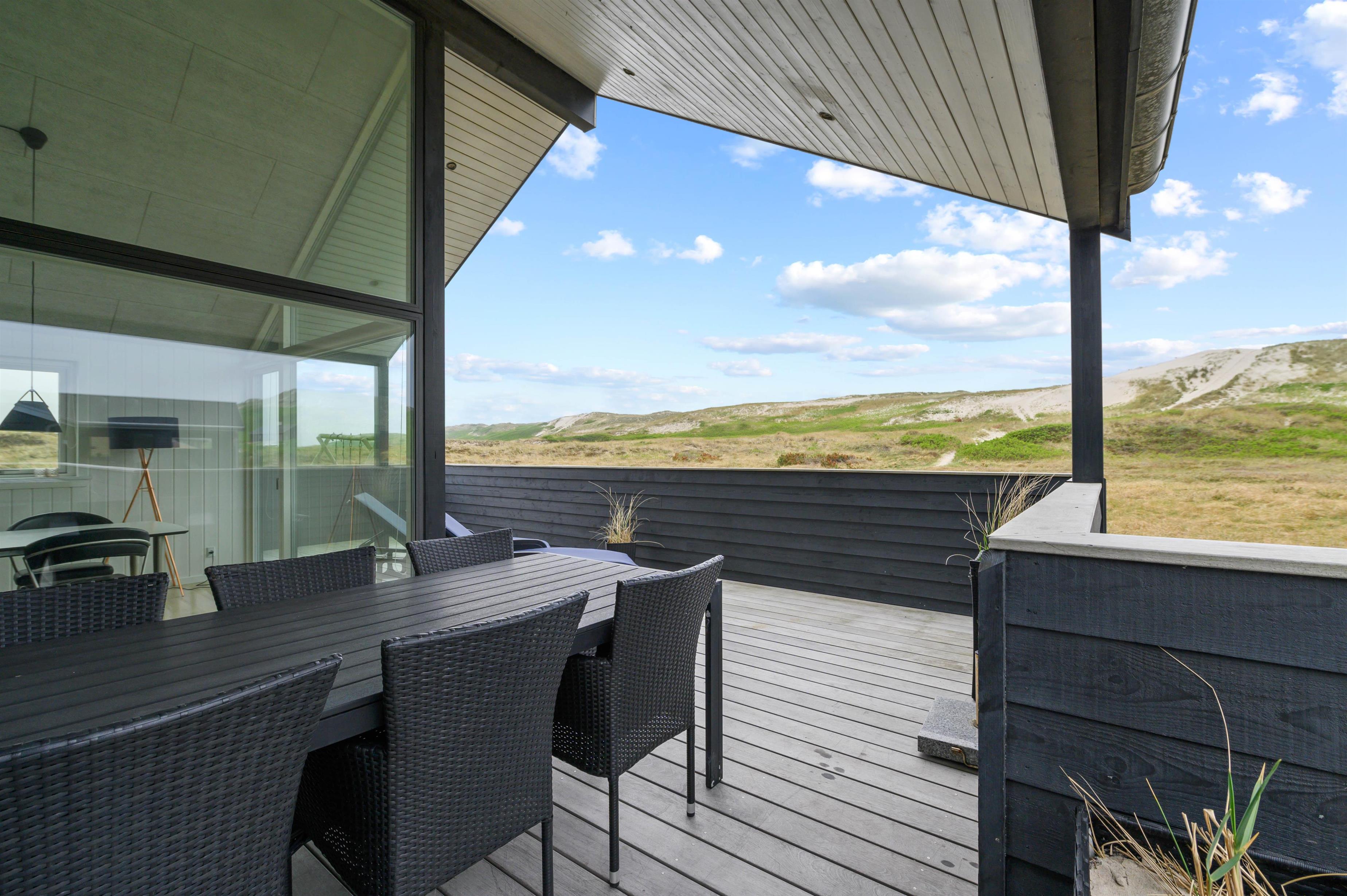Holiday home in the front row of dunes in Årgab featuring a fantastic covered and enclosed terrace. Beautiful rooms, two bathrooms and sauna. Vaulted ceiling in the kitchen and living room. Stunning views across the dune landscape. The North Sea and beautiful beach are just a few minutes' walk away.