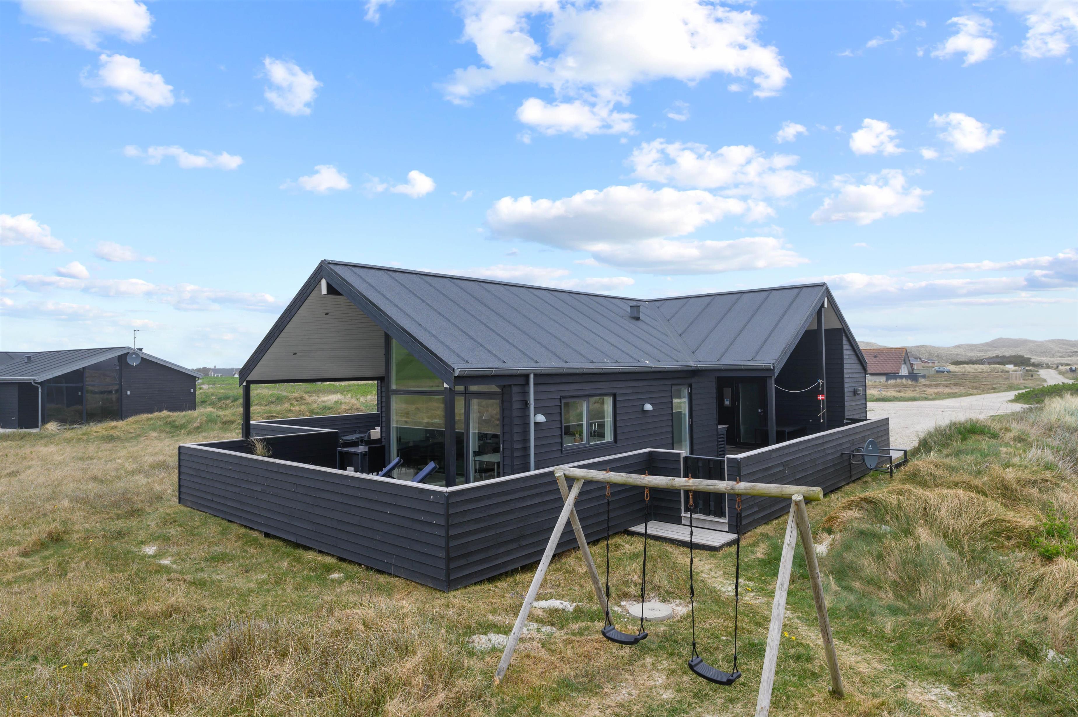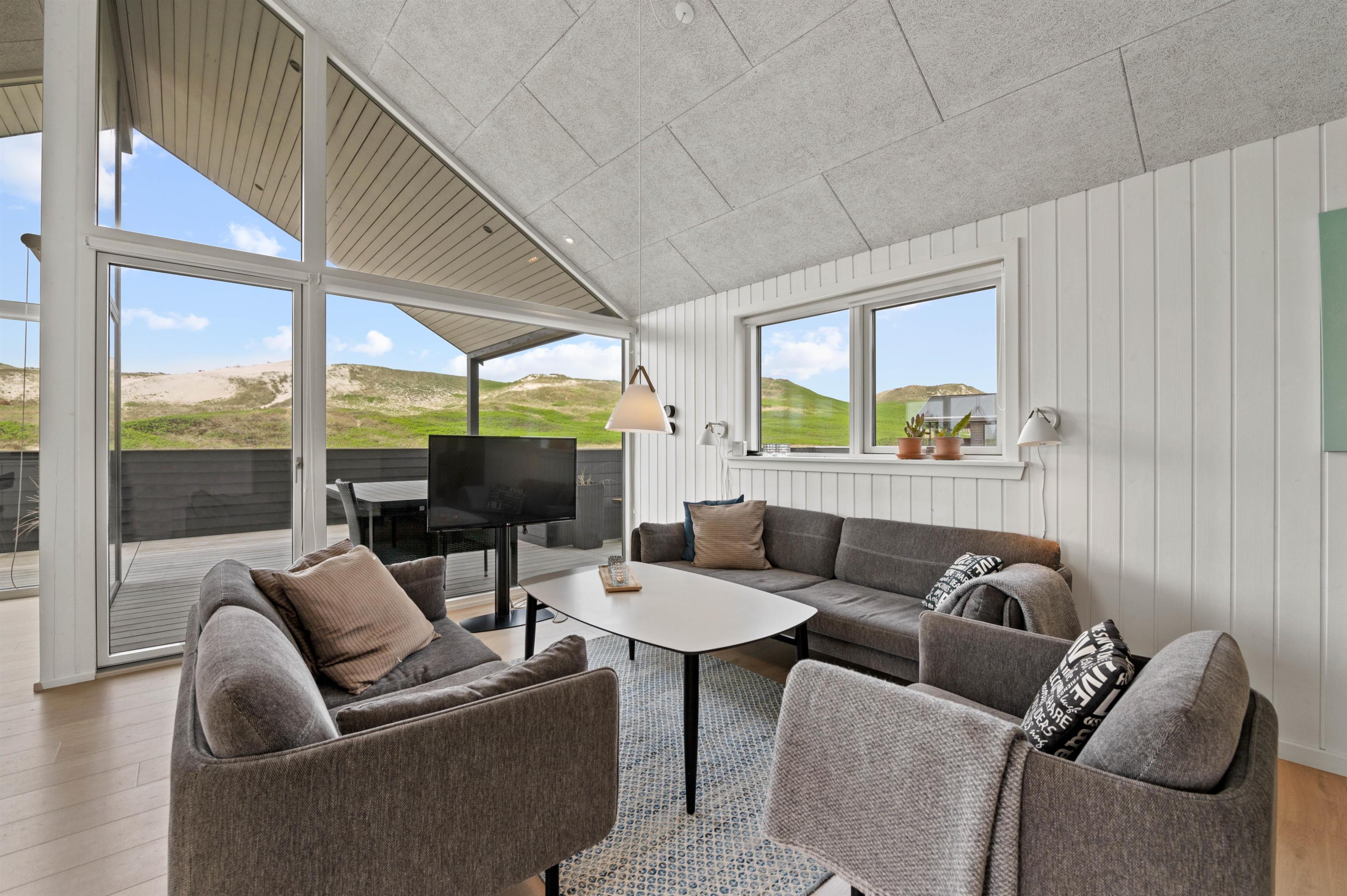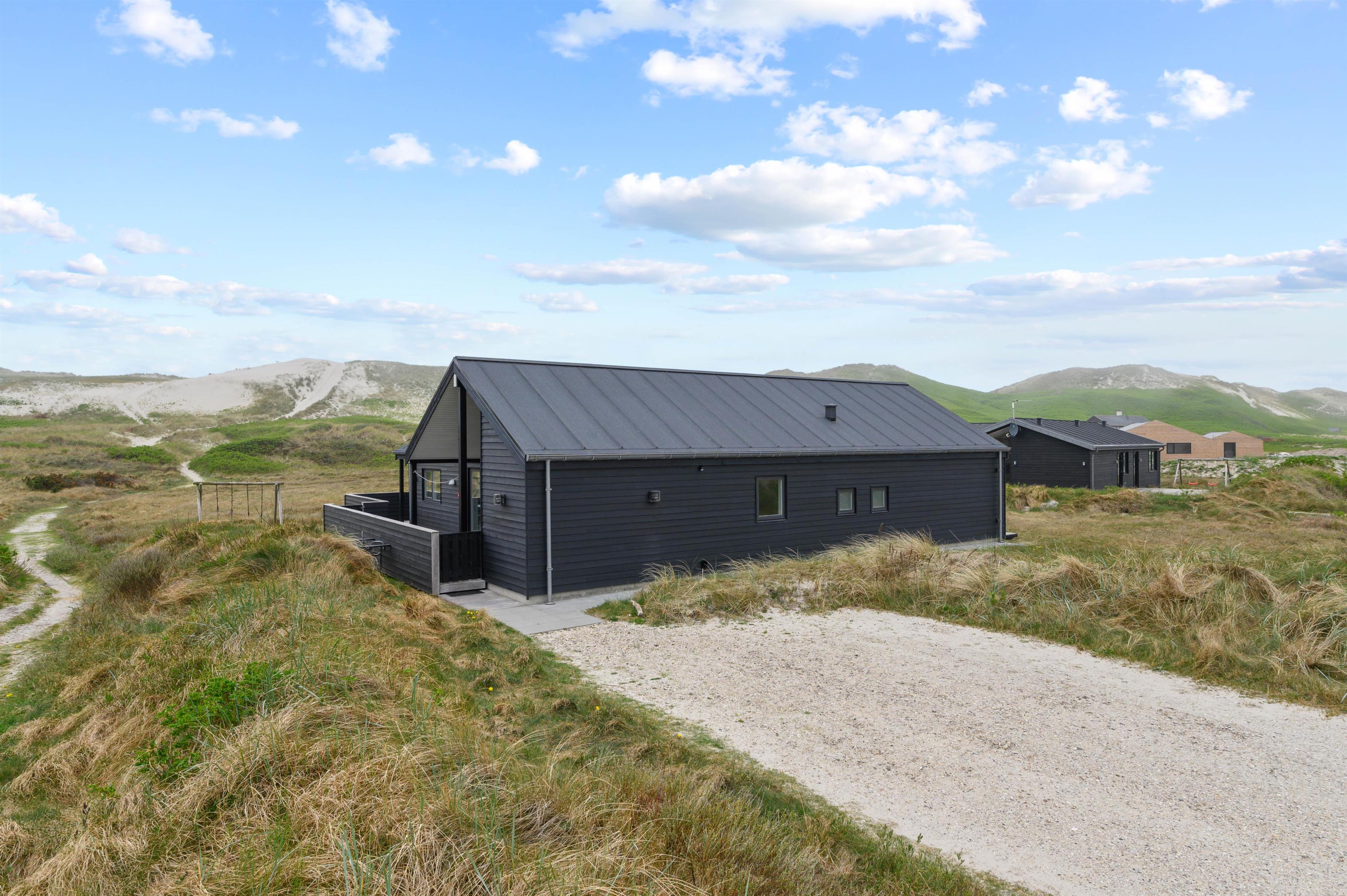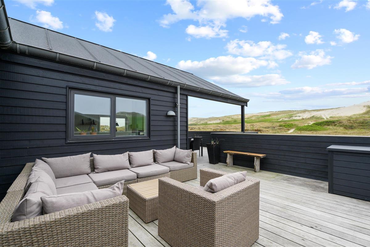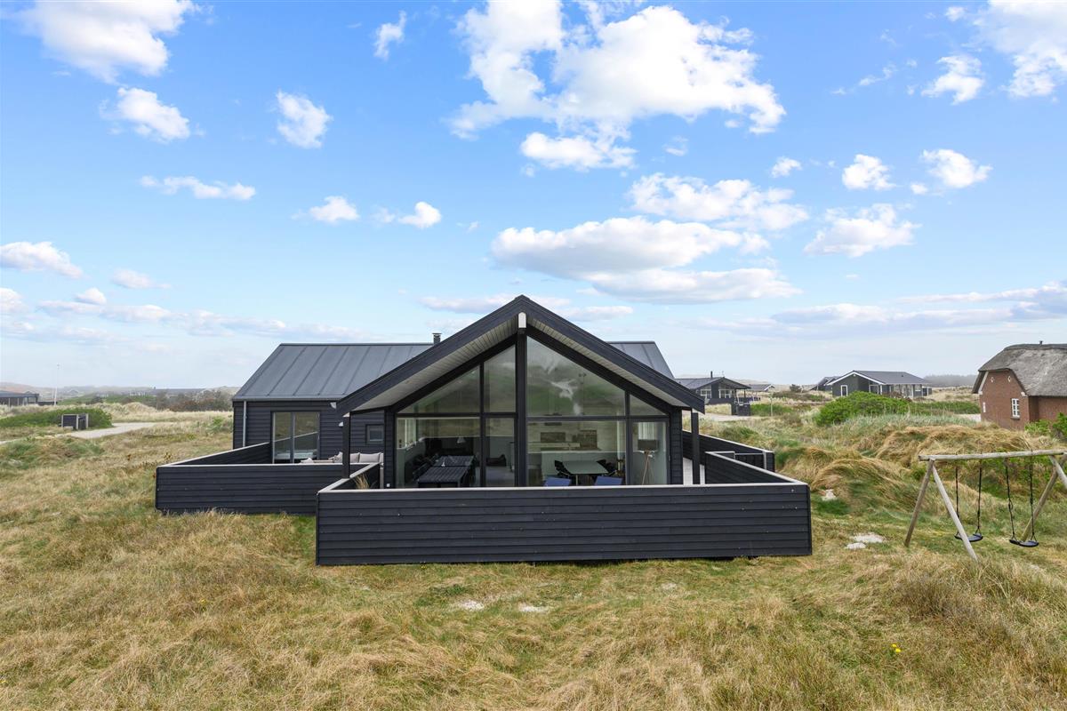 Holiday home in the front row of dunes in Årgab featuring a fantastic covered and enclosed terrace. Beautiful rooms, two bathrooms and sauna. Vaulted ceiling in the kitchen and living room. Stunning views across the dune landscape. The North Sea and beautiful beach are just a few minutes' walk away.