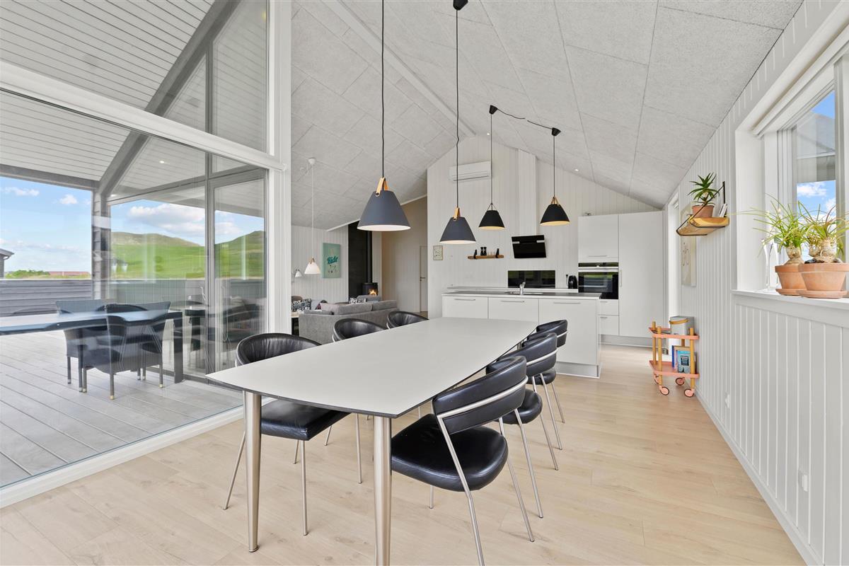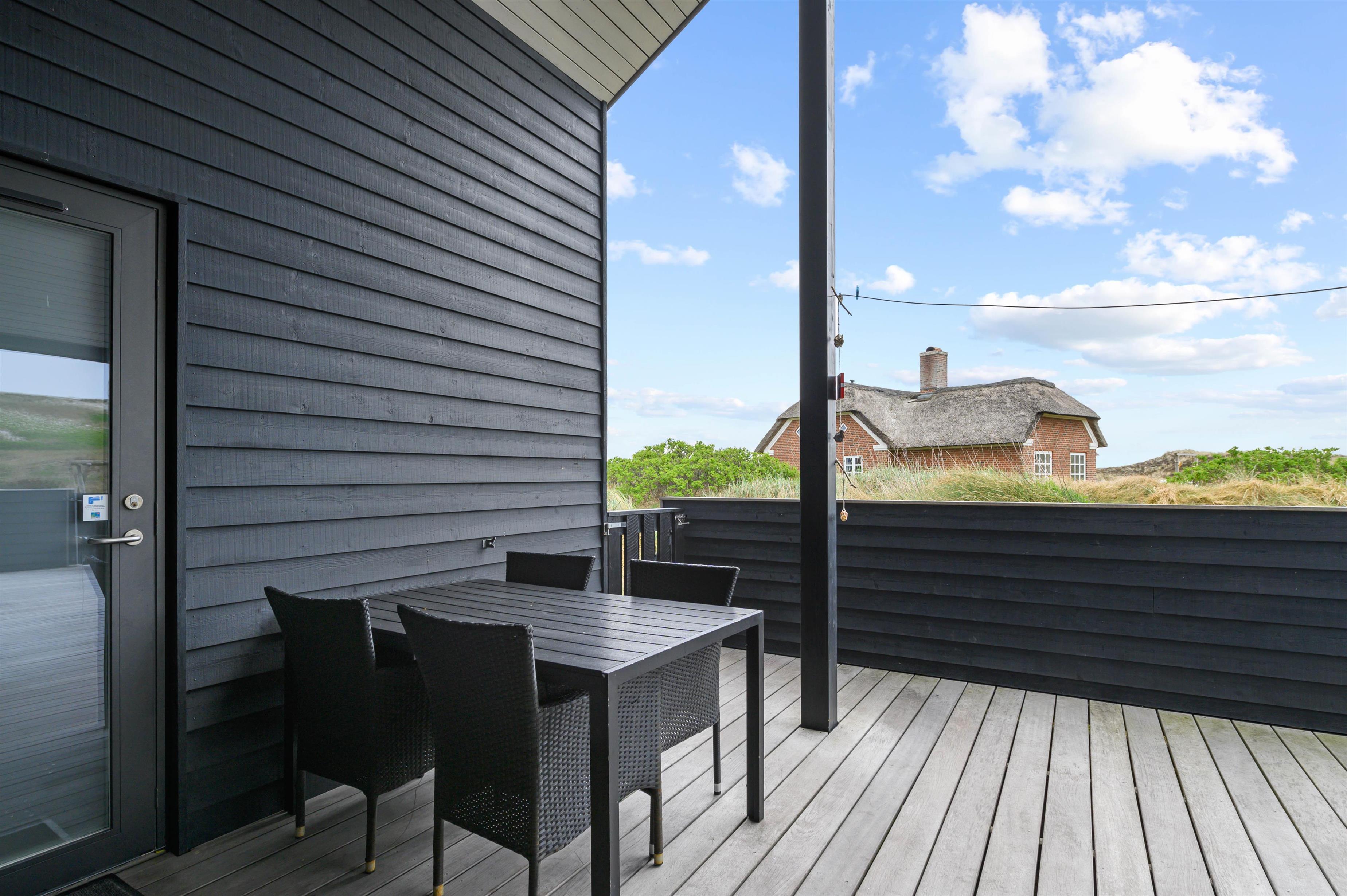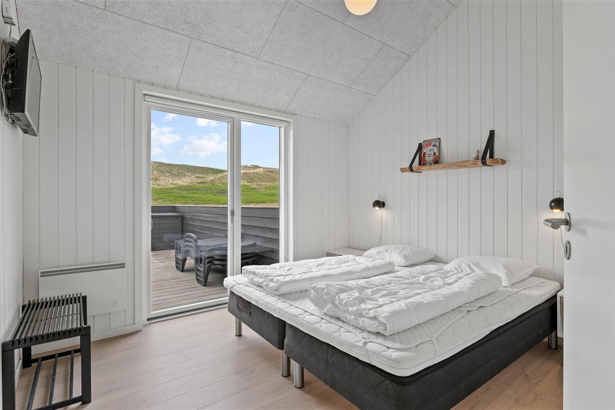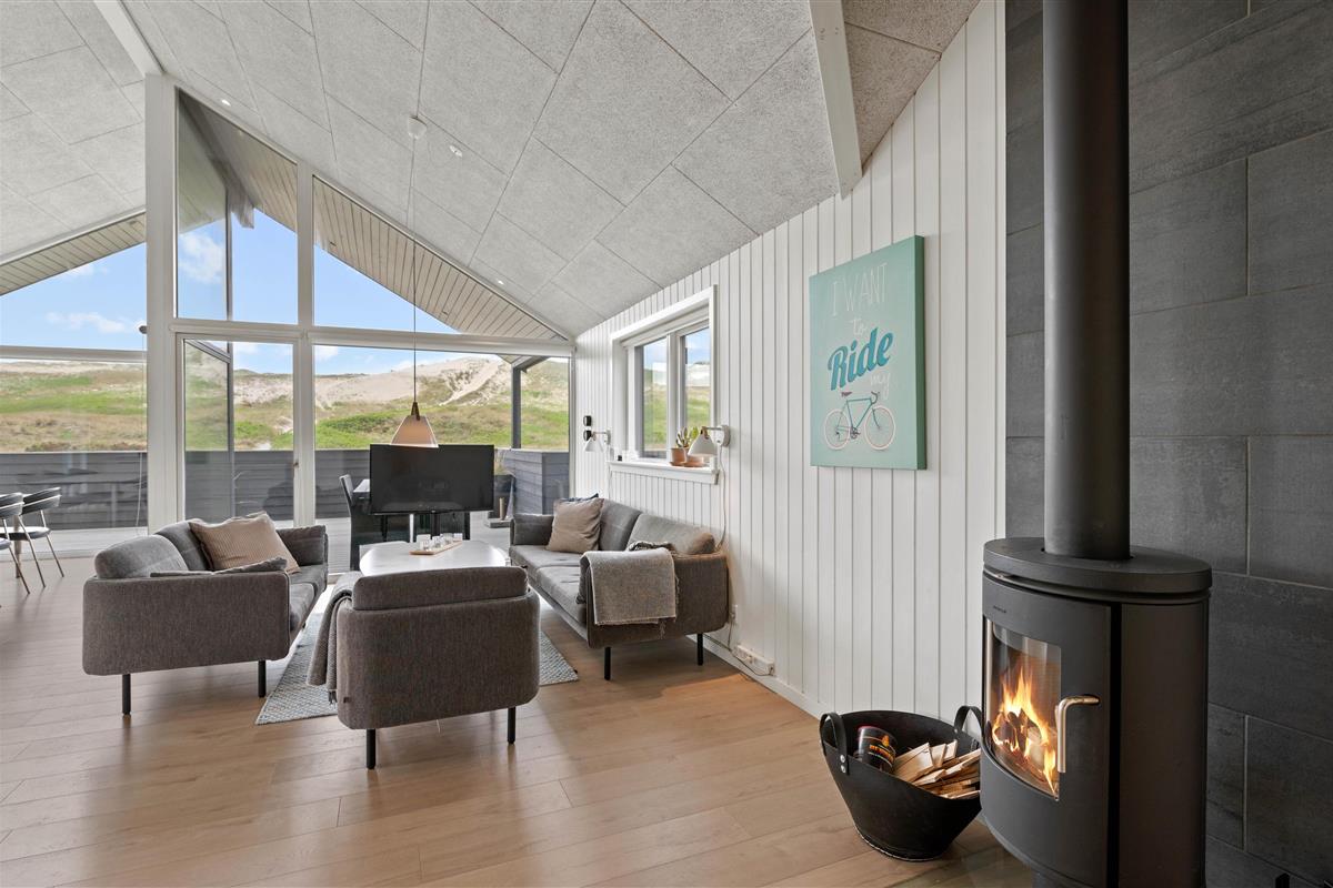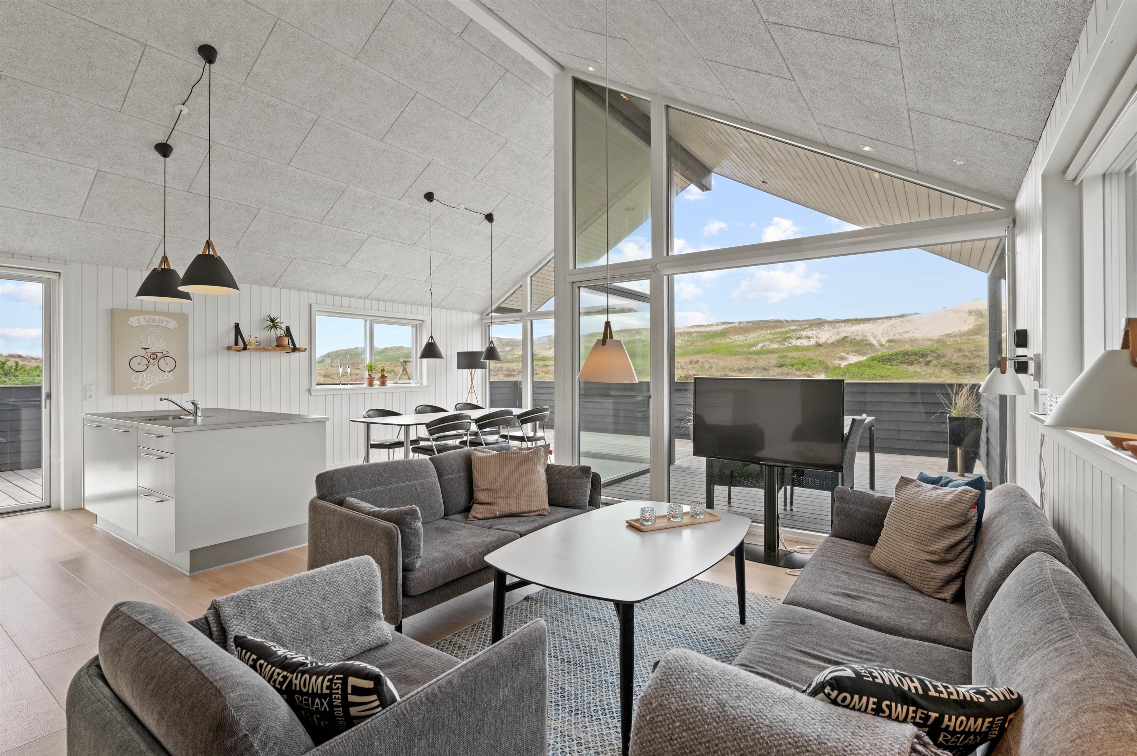 Holiday home in the front row of dunes in Årgab featuring a fantastic covered and enclosed terrace. Beautiful rooms, two bathrooms and sauna. Vaulted ceiling in the kitchen and living room. Stunning views across the dune landscape. The North Sea and beautiful beach are just a few minutes' walk away.