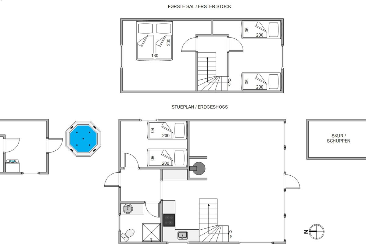 Das Ferienhaus bietet Platz für 6 Personen in 3 Schlafzimmern – 1 im Erdgeschoss und 2 im ersten Stock – alle mit Platz für eine gute Nachtruhe nach einem schönen Tag. Darüber hinaus findet ihr im Ferienhaus 1 Badezimmer mit Fußbodenheizung, eine Waschmaschine und einen Wäschetrockner.