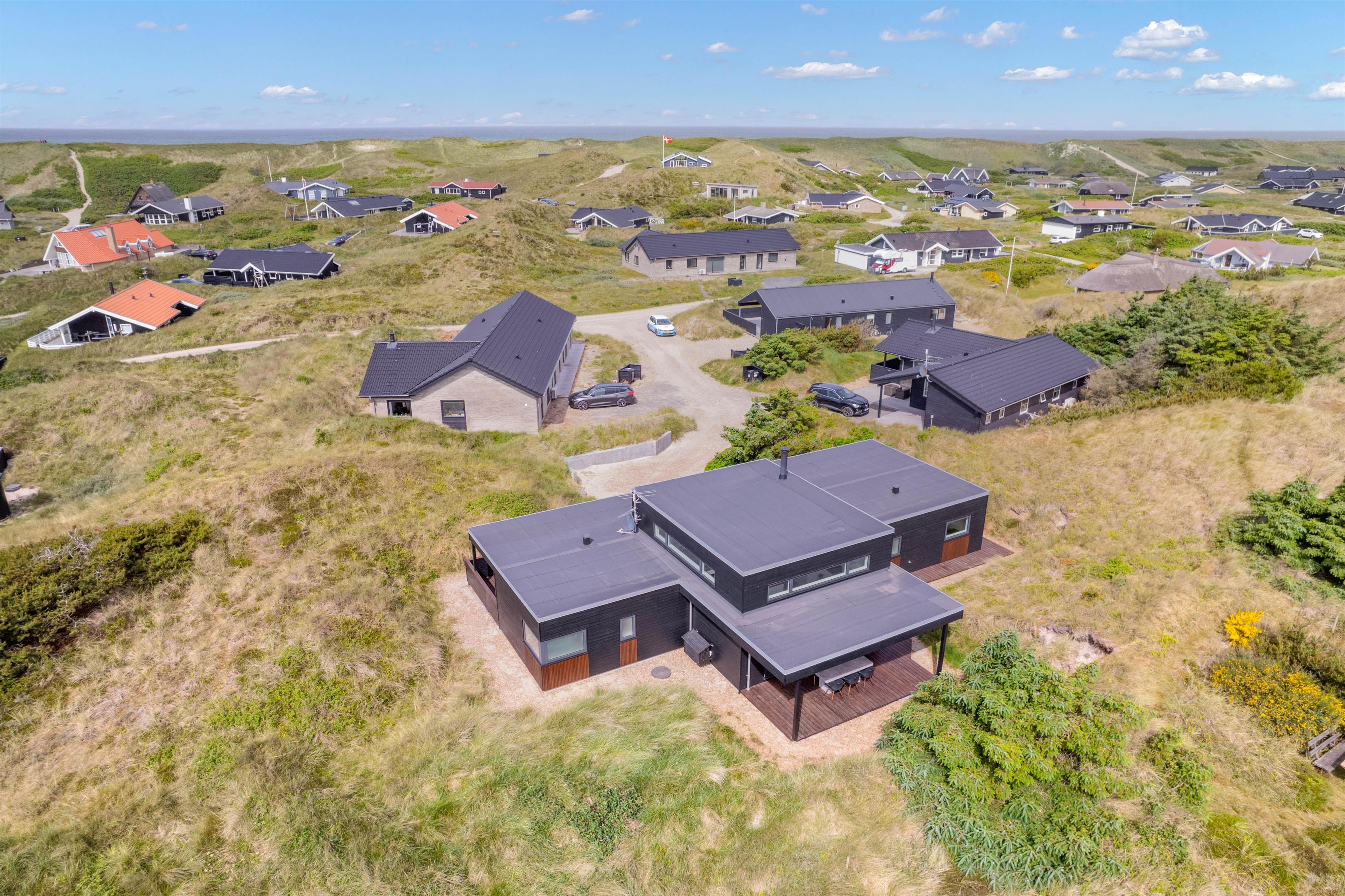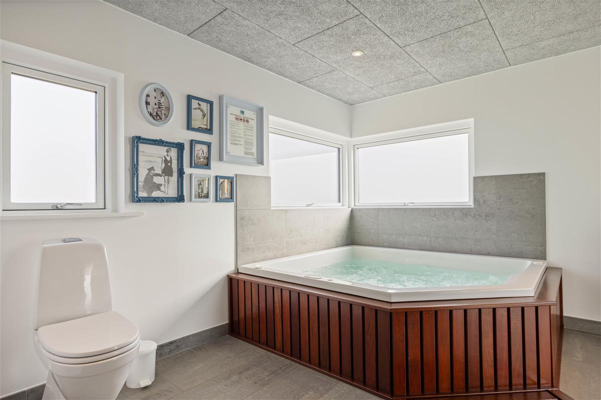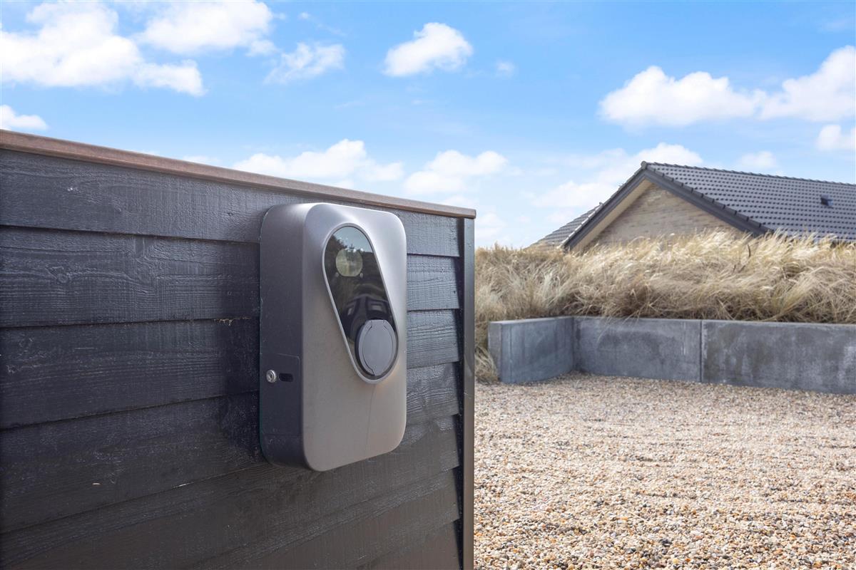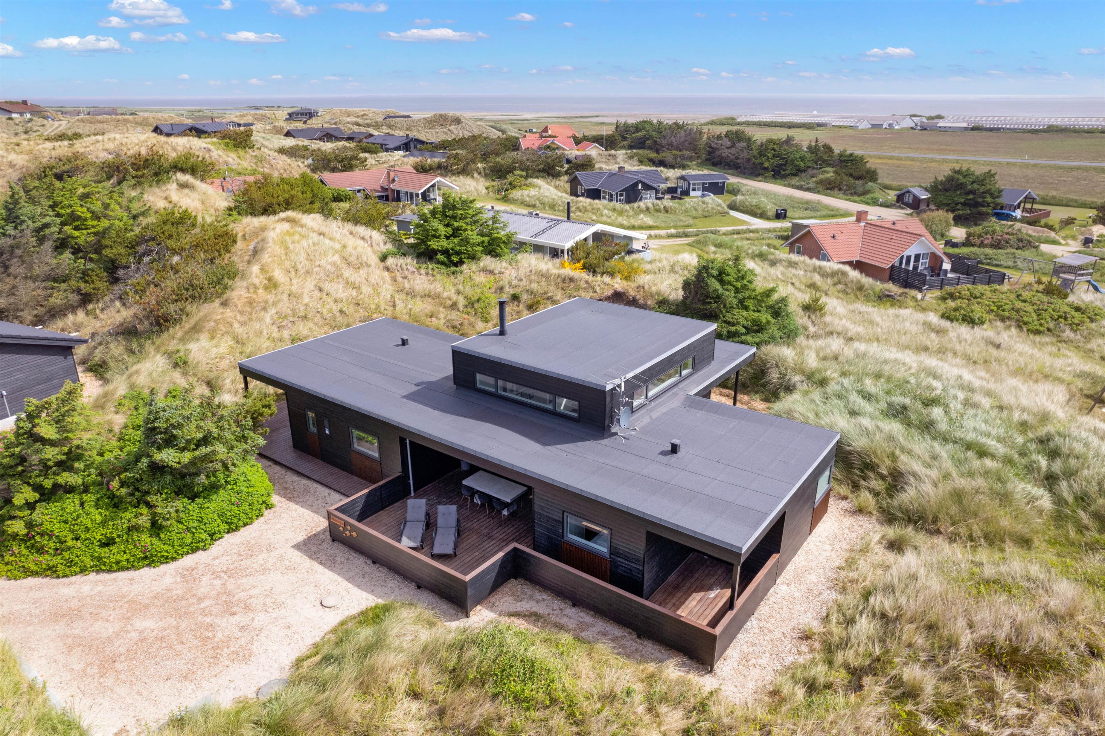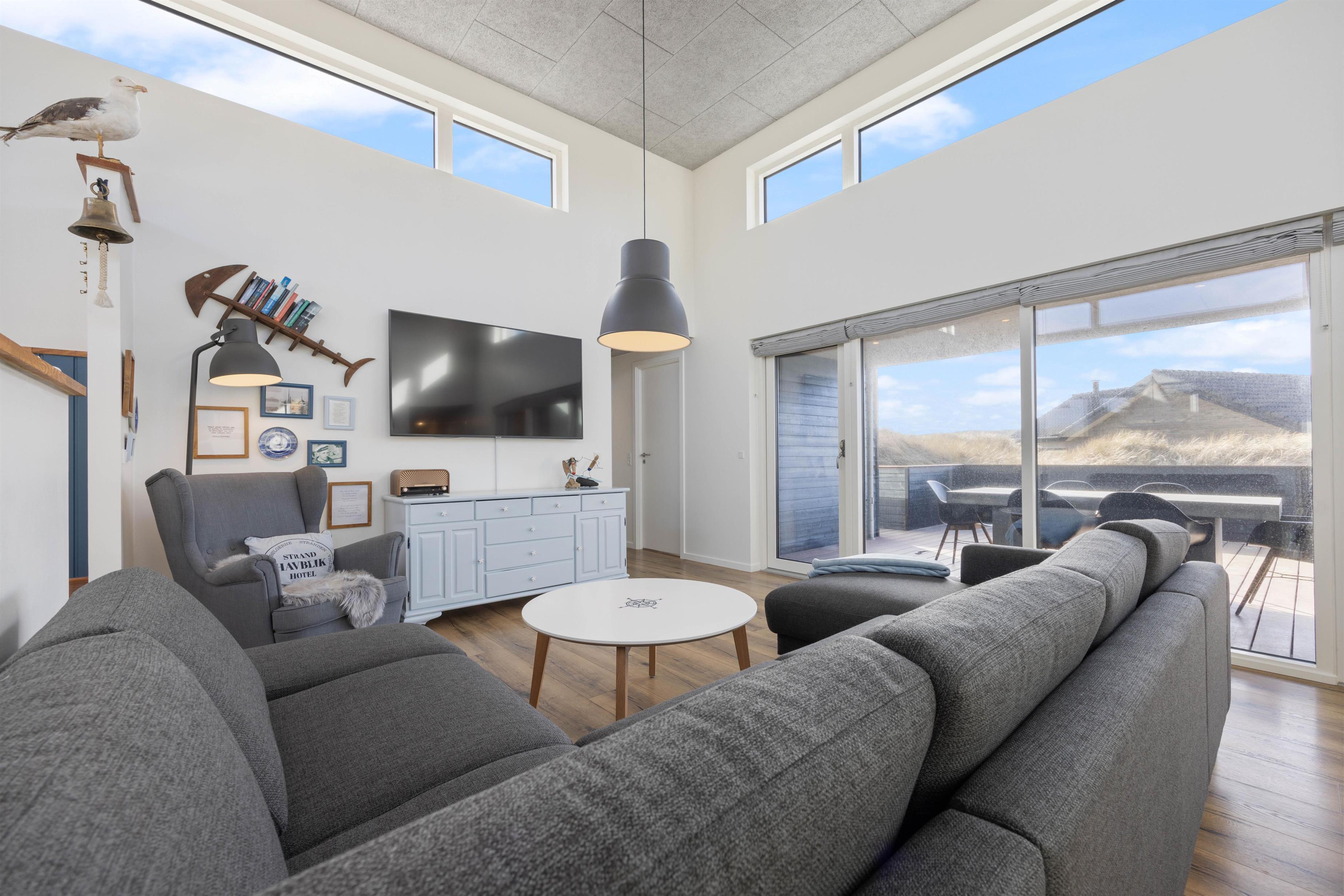If you're looking for a modern holiday home in a fantastic location, this beautiful holiday home is perfect for you. Only the finest materials have been used throughout, with quality being paramount. The large, comfortable sofa offers plenty of space for relaxation. Tall windows provide natural light, while the wood-burning stove ensures a comfortable temperature. An energy-efficient heat pump offers an alternative heating method.