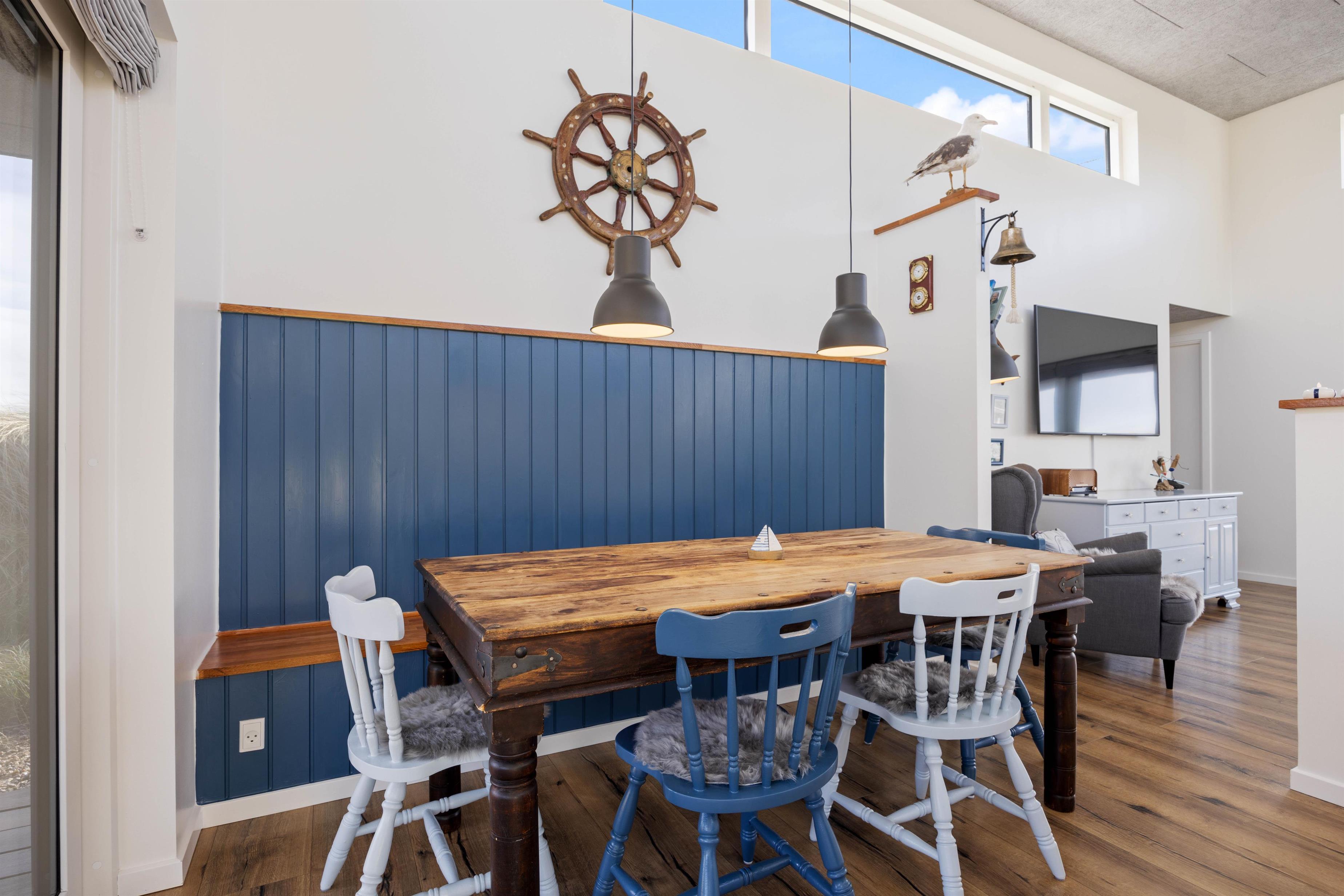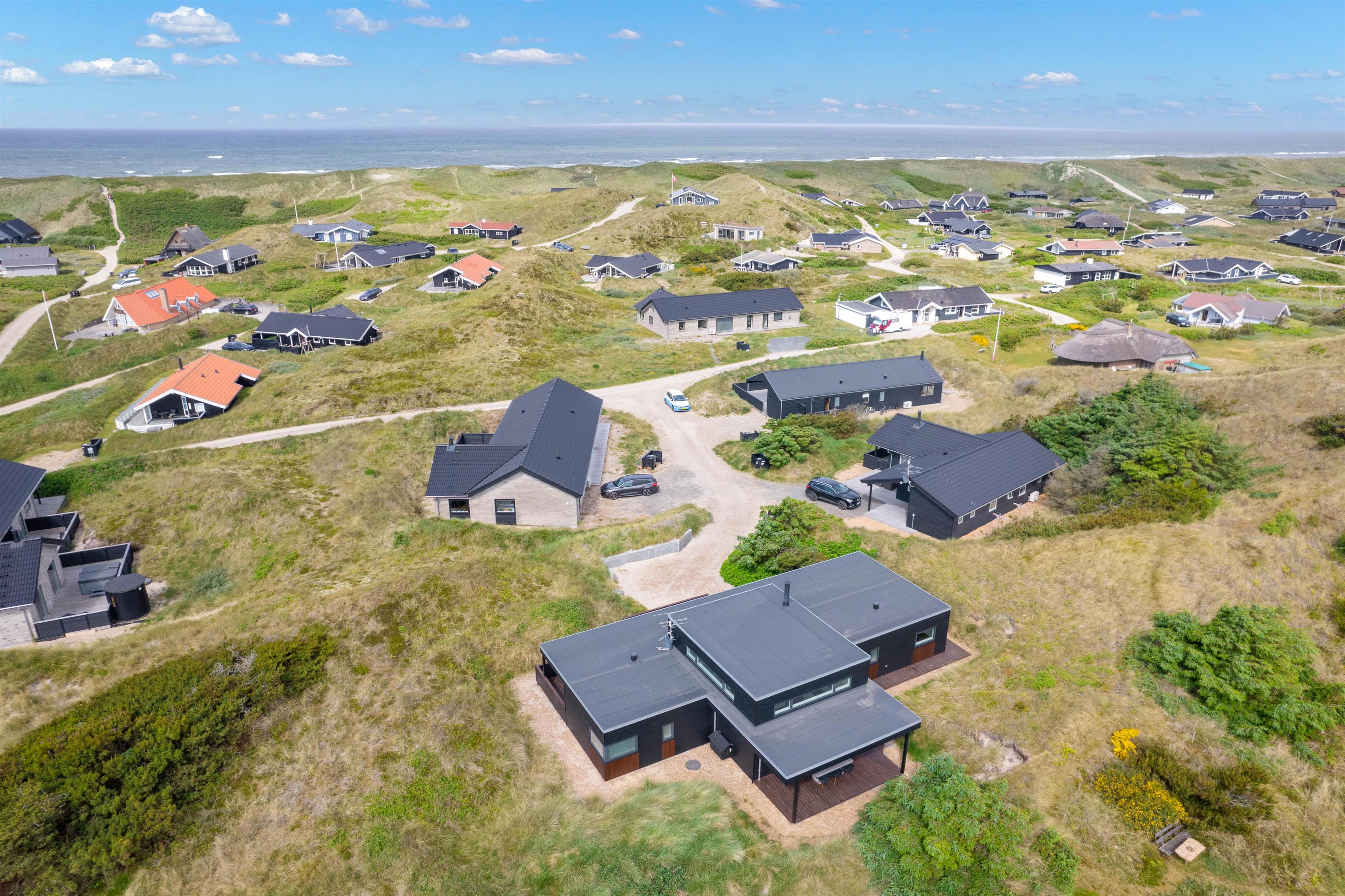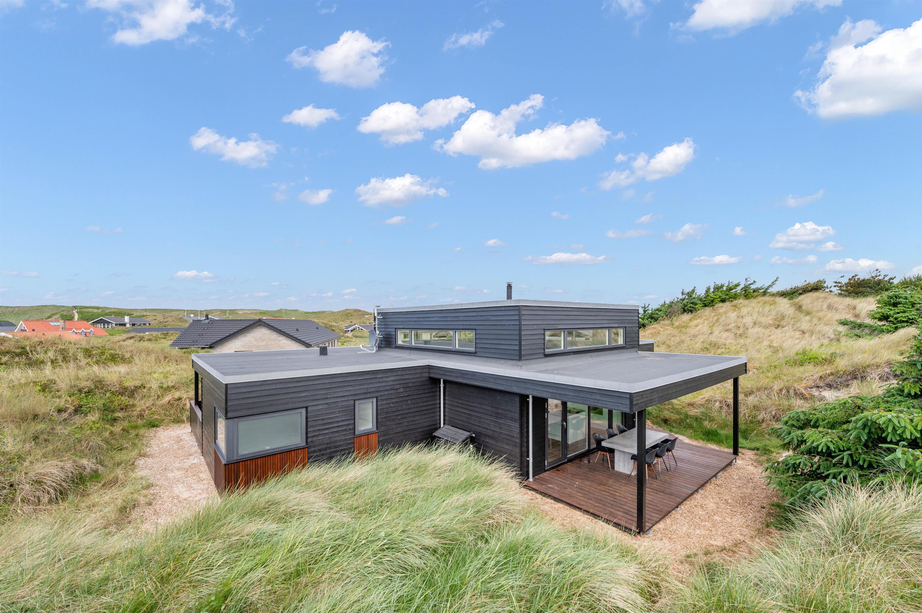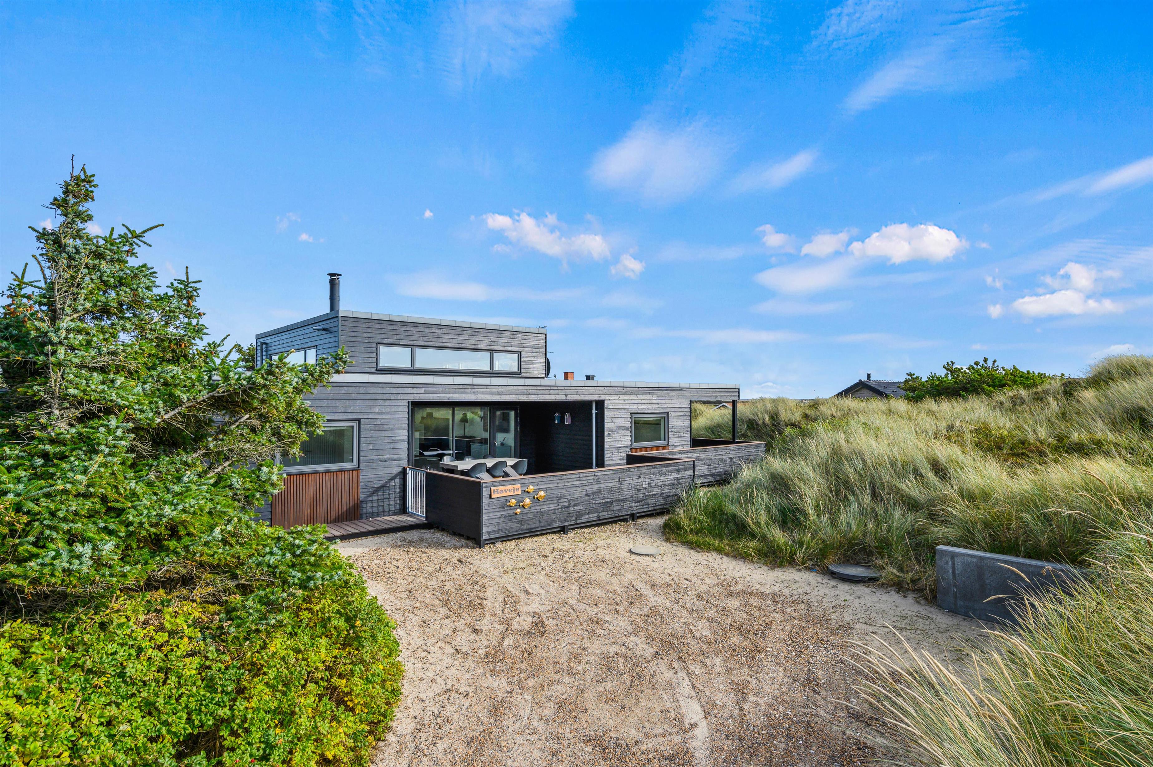 If you're looking for a modern holiday home in a fantastic location, this beautiful holiday home is perfect for you. Only the finest materials have been used throughout, with quality being paramount. The large, comfortable sofa offers plenty of space for relaxation. Tall windows provide natural light, while the wood-burning stove ensures a comfortable temperature. An energy-efficient heat pump offers an alternative heating method.
