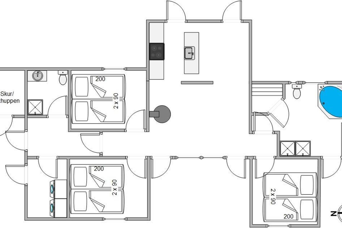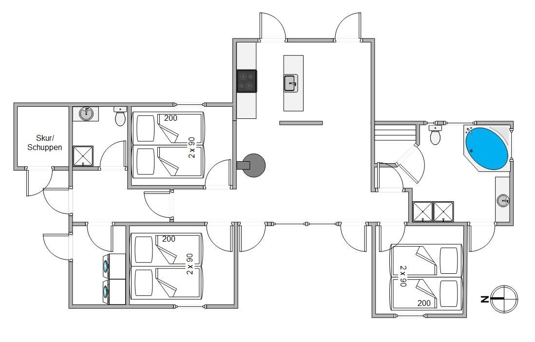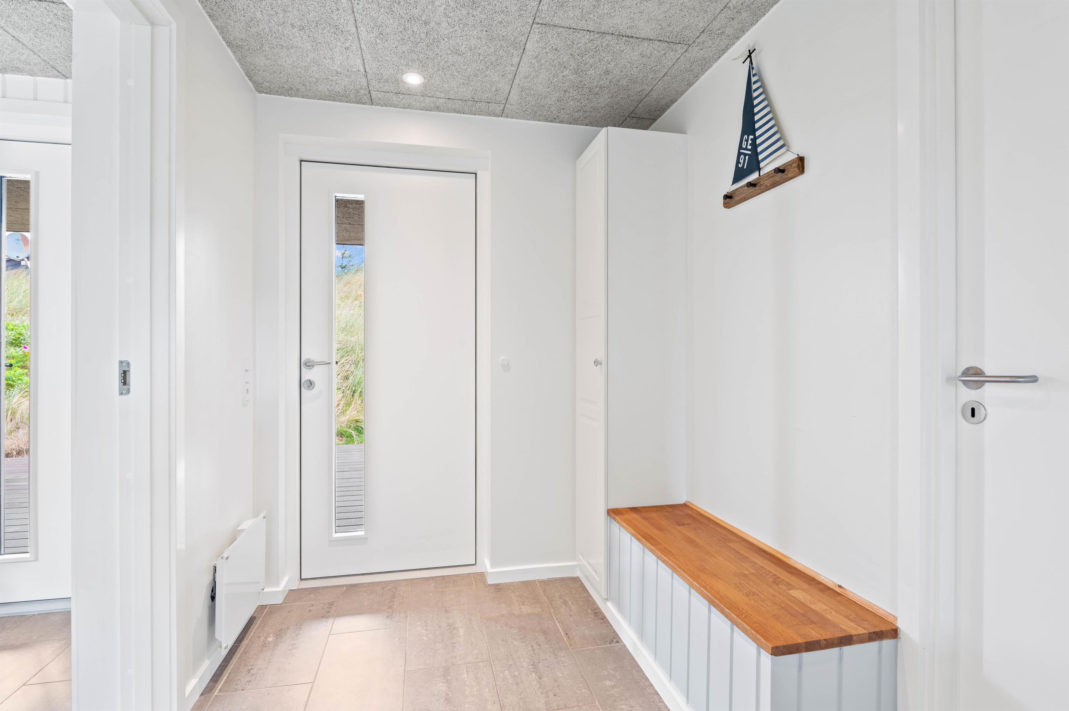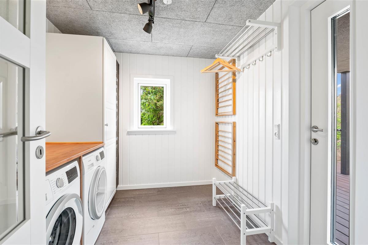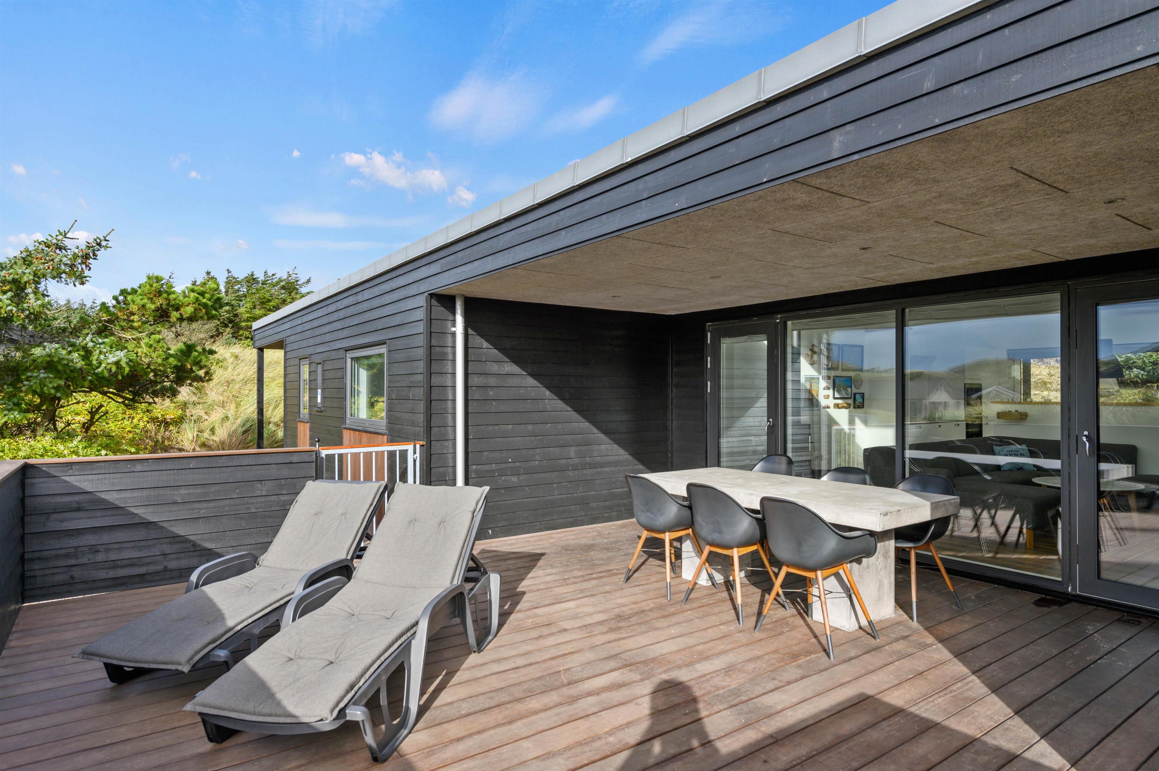 If you're looking for a modern holiday home in a fantastic location, this beautiful holiday home is perfect for you. Only the finest materials have been used throughout, with quality being paramount. The large, comfortable sofa offers plenty of space for relaxation. Tall windows provide natural light, while the wood-burning stove ensures a comfortable temperature. An energy-efficient heat pump offers an alternative heating method.