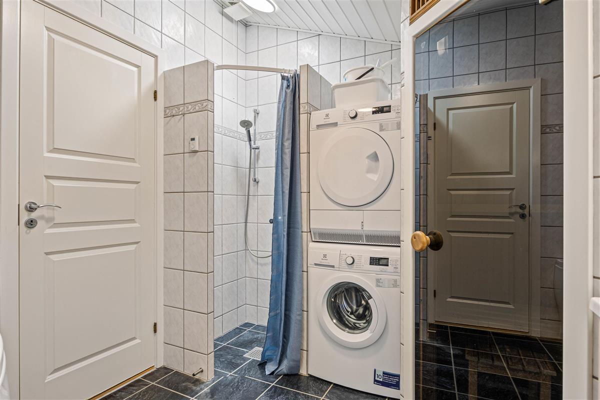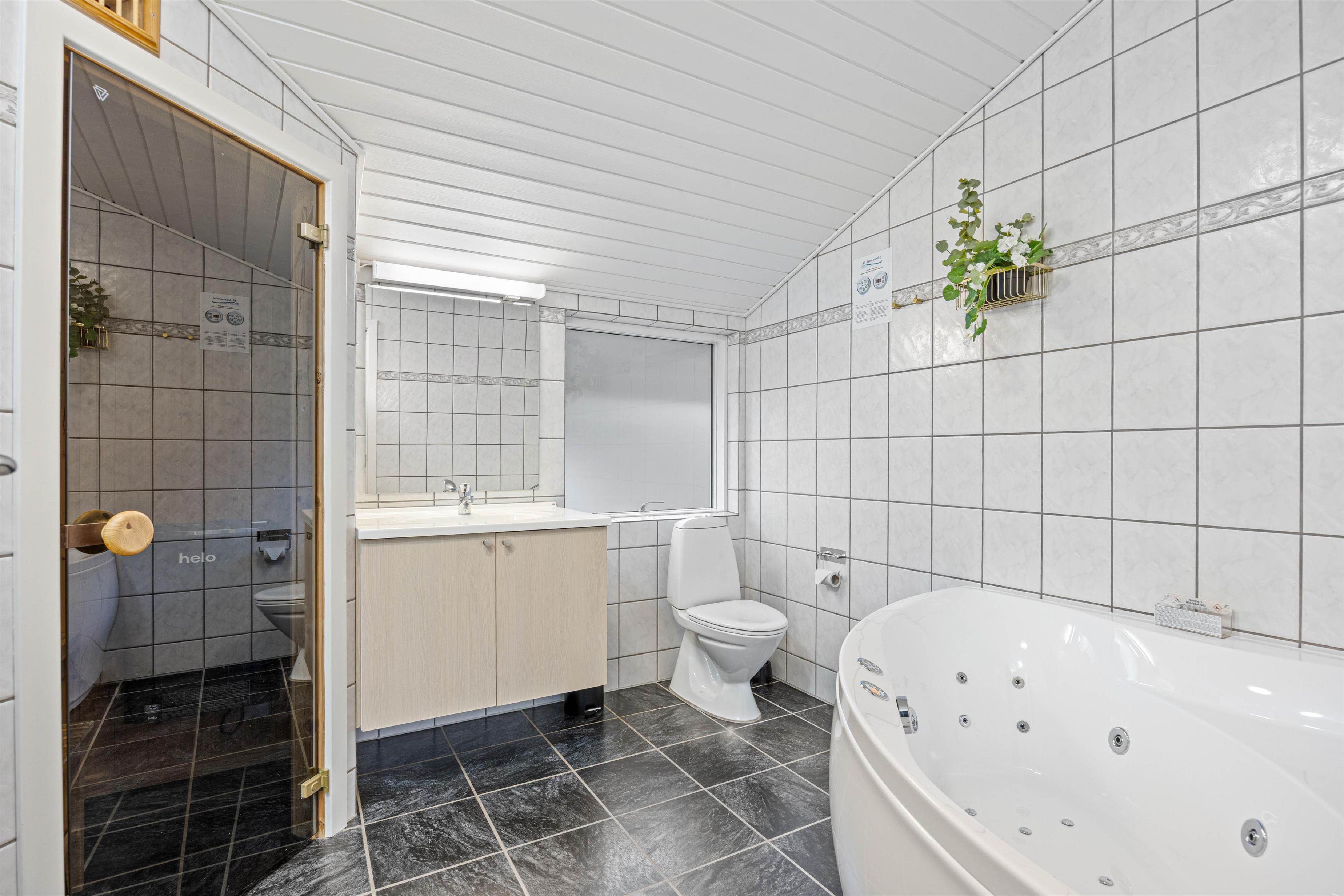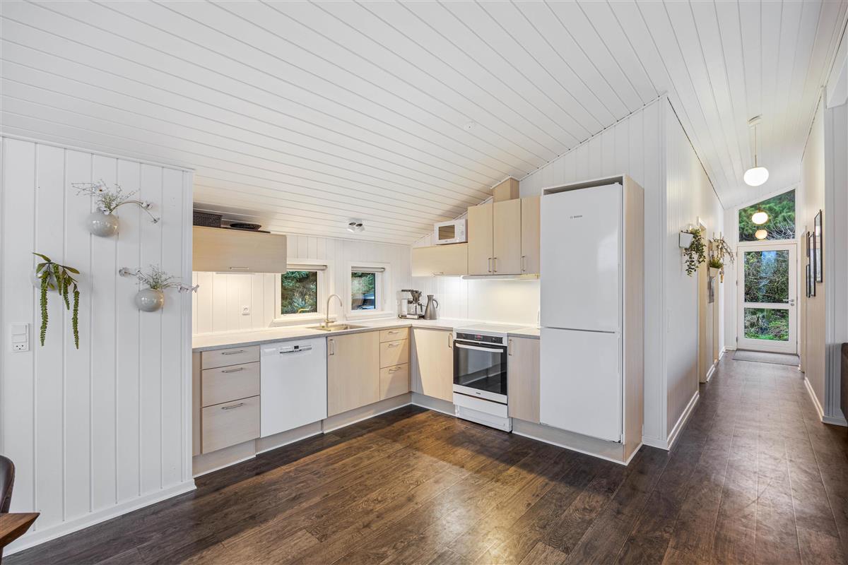 The kitchen is well-equipped with all necessary appliances and opens onto the lovely living room, where you can relax in front of the wood-burning stove or enjoy a cosy lunch with friends. The energy-efficient heat pump ensures a comfortable temperature throughout.