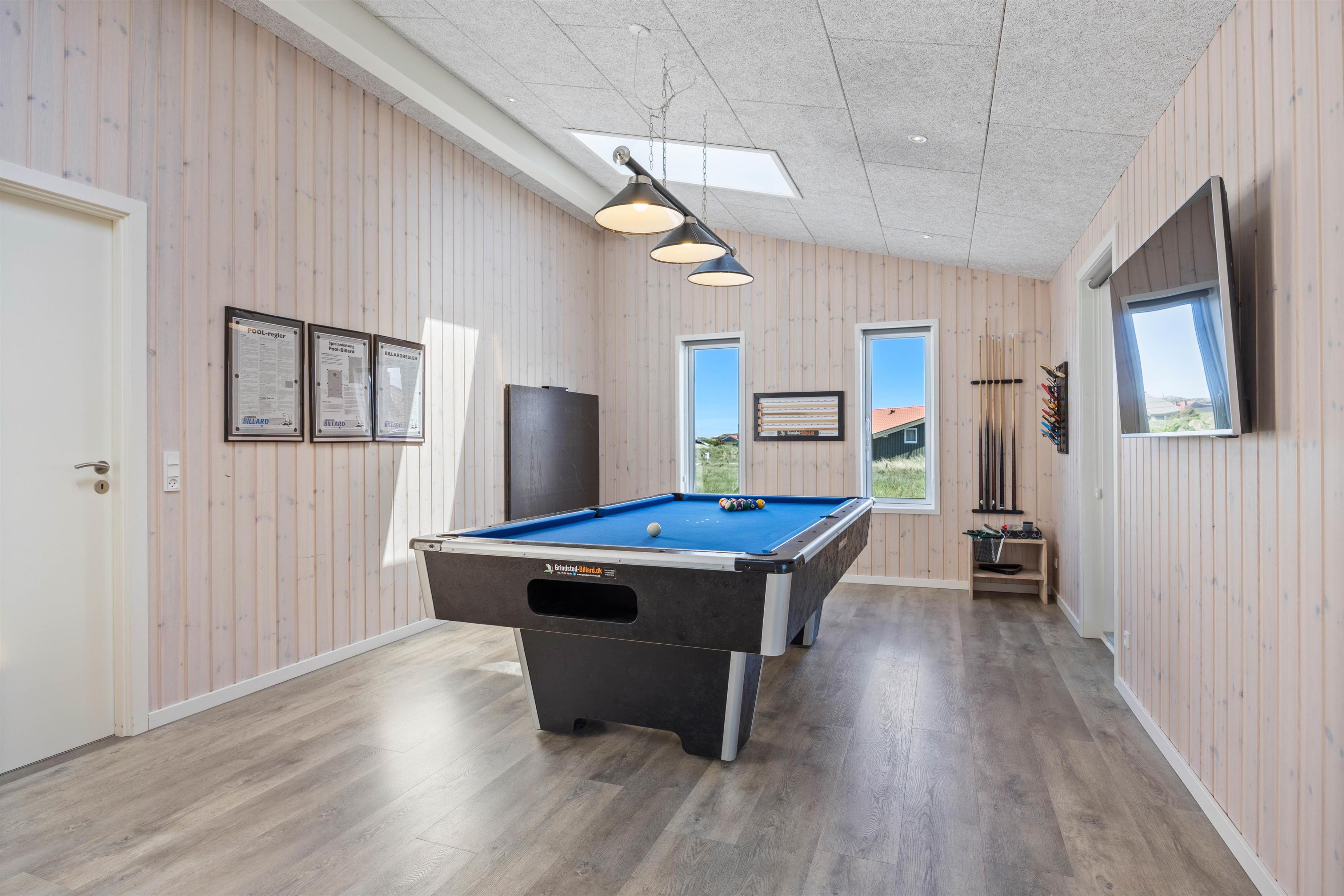 This holiday home is divided into two sections, featuring two living areas for added flexibility. One connects directly to the open-plan kitchen, which is modernly equipped with a range cooker and American-style fridge-freezer, dining area and one of the four bedrooms. One living area includes a wood-burning stove for creating a cosy atmosphere. Both living areas offer access to the terrace. You'll also find a games room with a pool table and table tennis table for entertaining evenings.