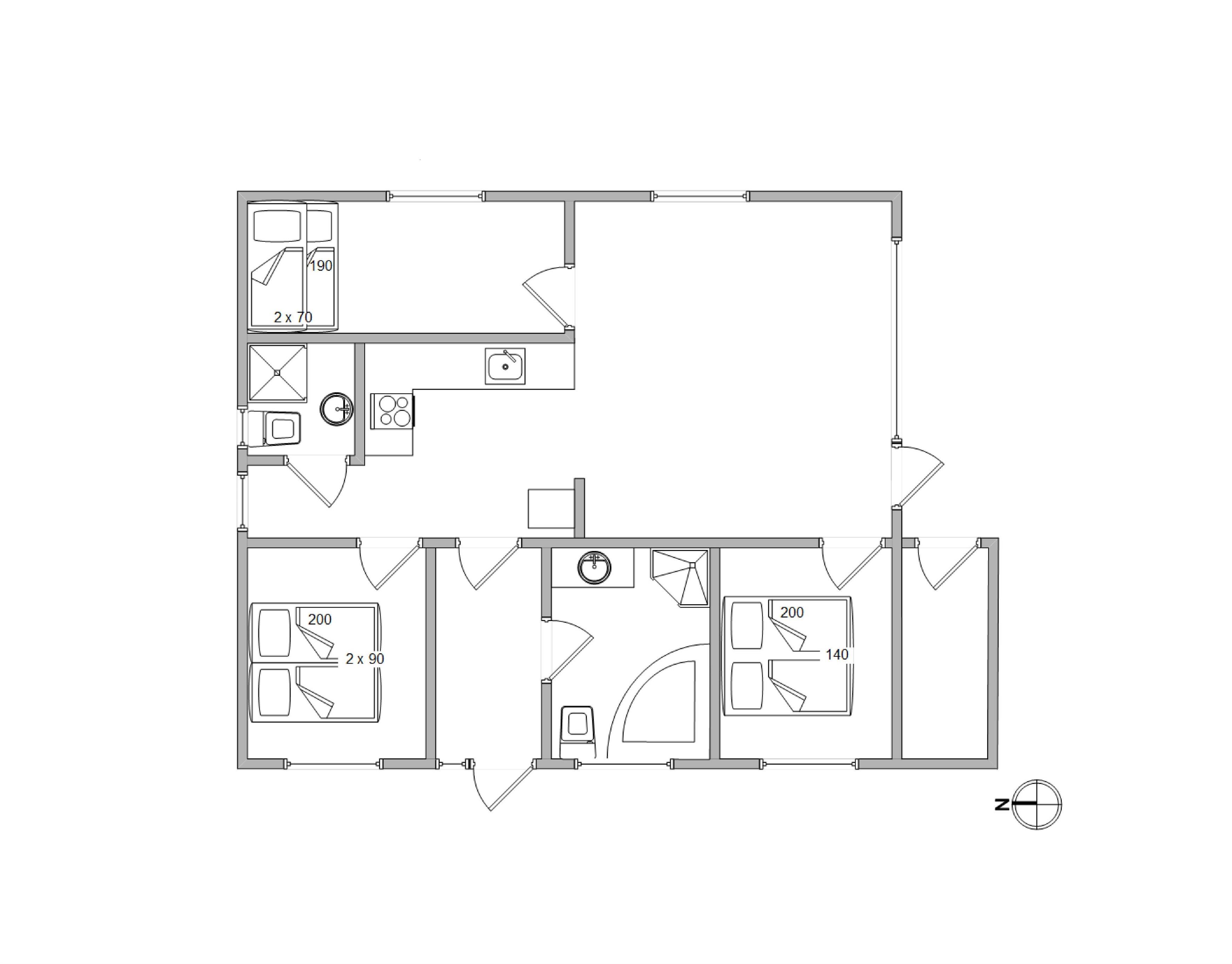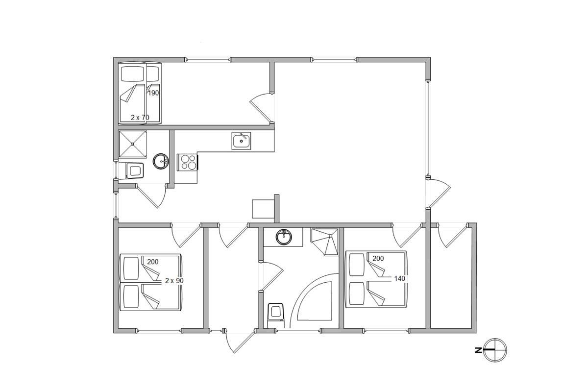 The holiday home accommodates six people across three bedrooms. Two bedrooms each feature a double bed, while the third has a bunk bed for children and a pull-out sofa bed. All bedrooms are carpeted. There are two bathrooms, both with shower cubicles and underfloor heating. The larger bathroom also includes a whirlpool - perfect for relaxing after a day outdoors. A utility room houses the washing machine. The heart of the home is the combined kitchen and living area, filled with natural light from numerous windows. The well-equipped kitchen includes a dishwasher and microwave. The beautifully furnished living room features a flat-screen TV and DVD player, with wooden flooring throughout the living room and kitchen. The living room leads to a sheltered, partially covered terrace, furnished with garden furniture, sun loungers and a barbecue.