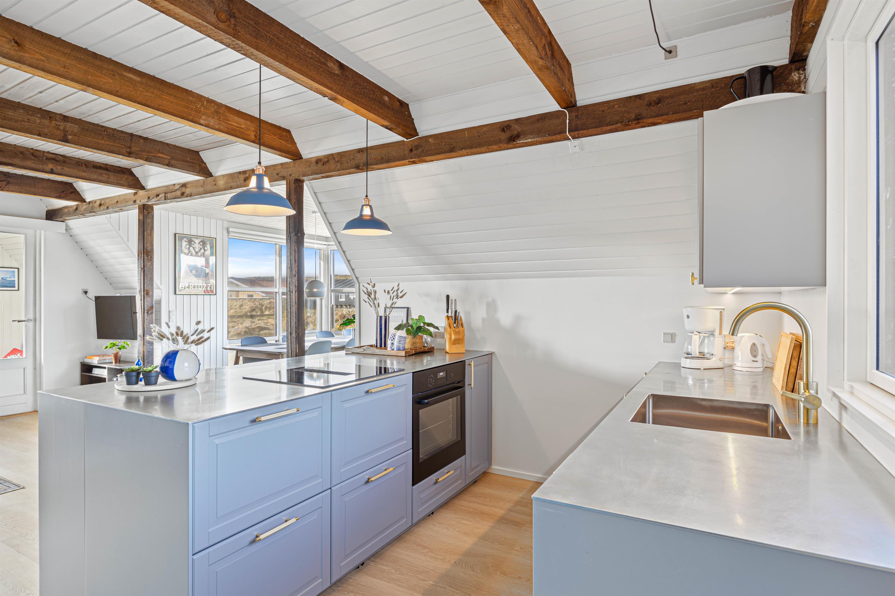 The holiday home is comfortably furnished with cosy sofa groups in the living room, allowing you to enjoy beautiful dune views during the day. In the evening, you can relax by the wood-burning stove with a nice glass of wine.
