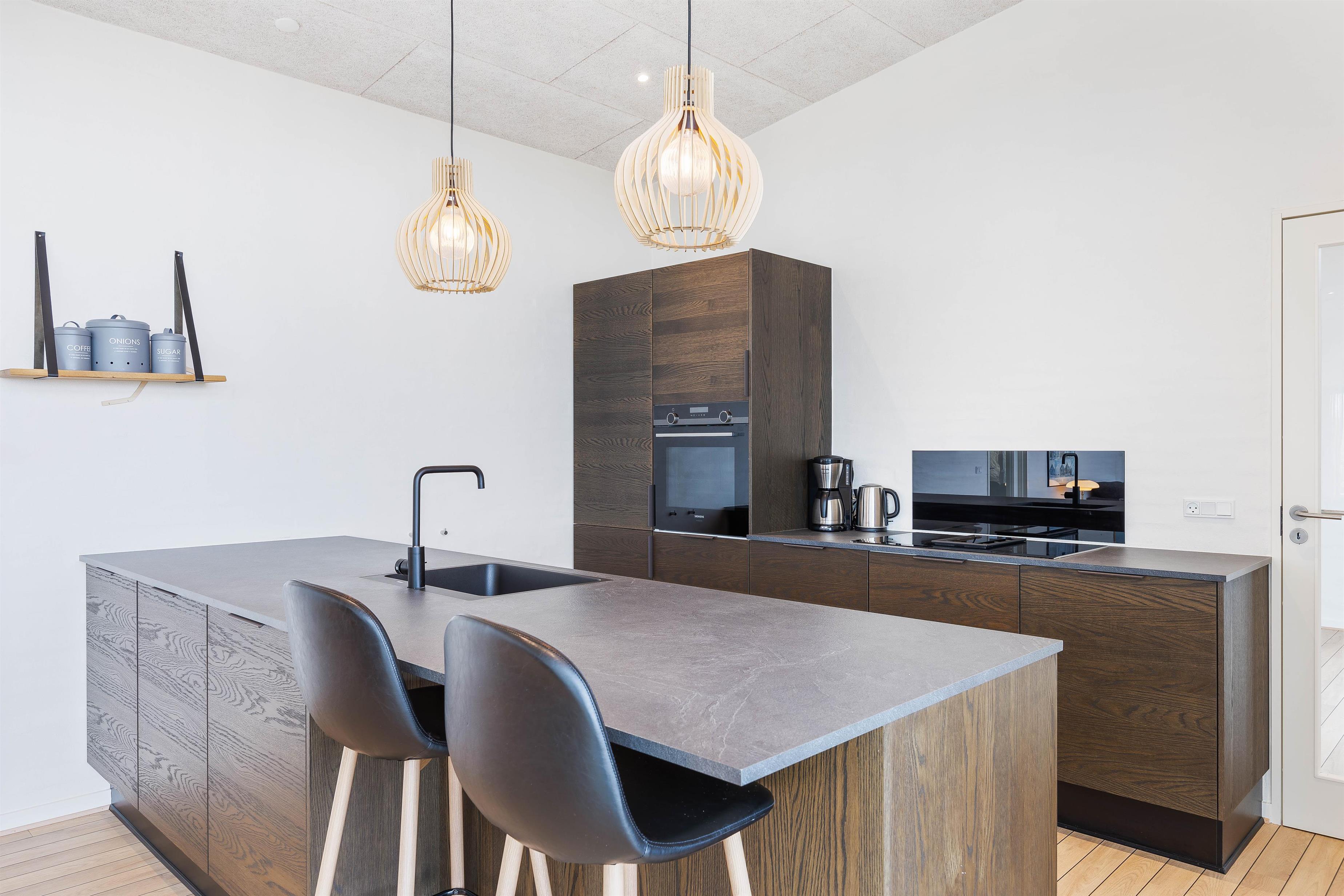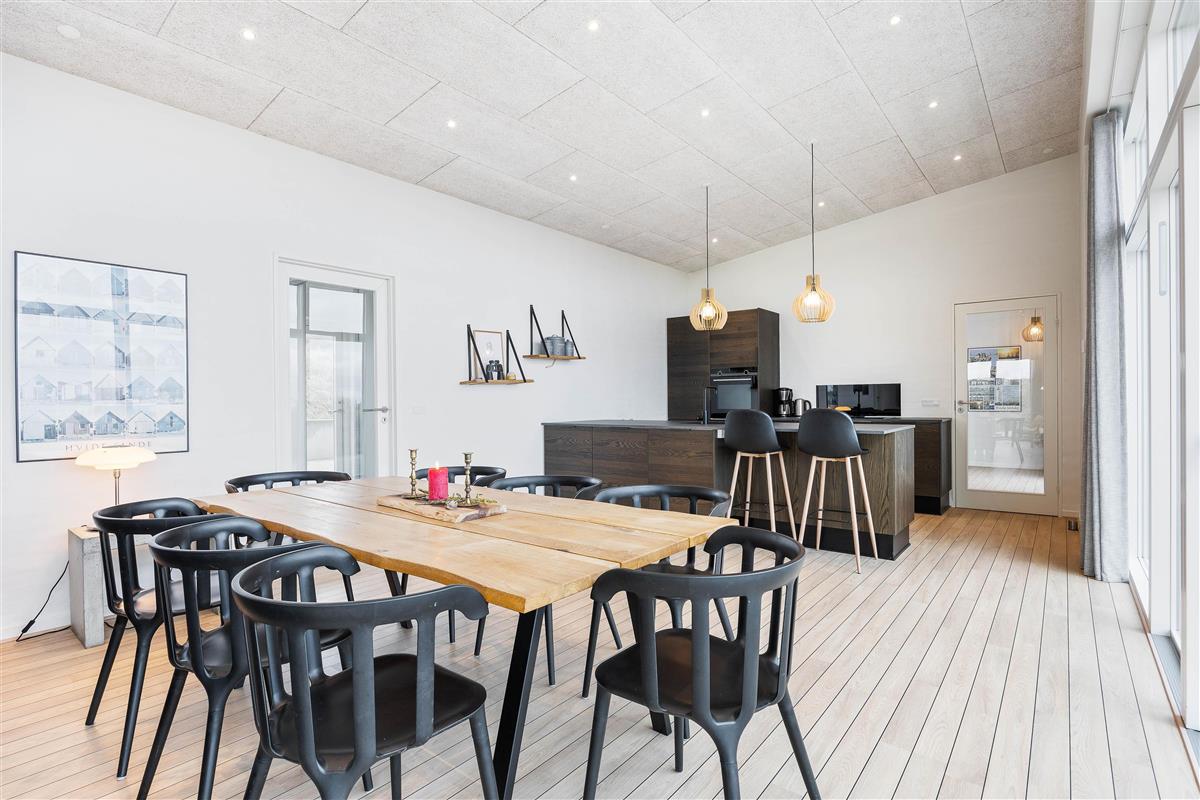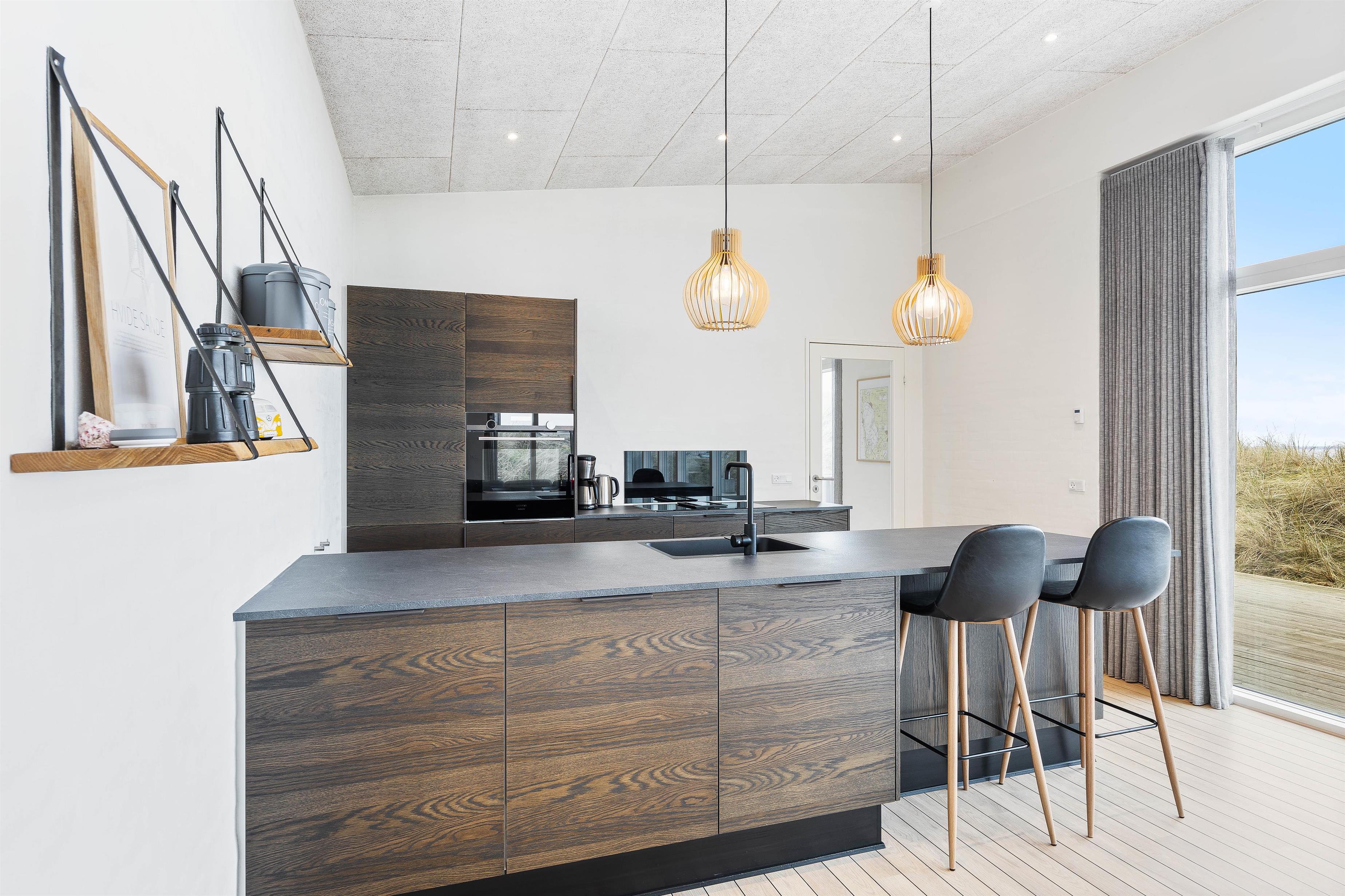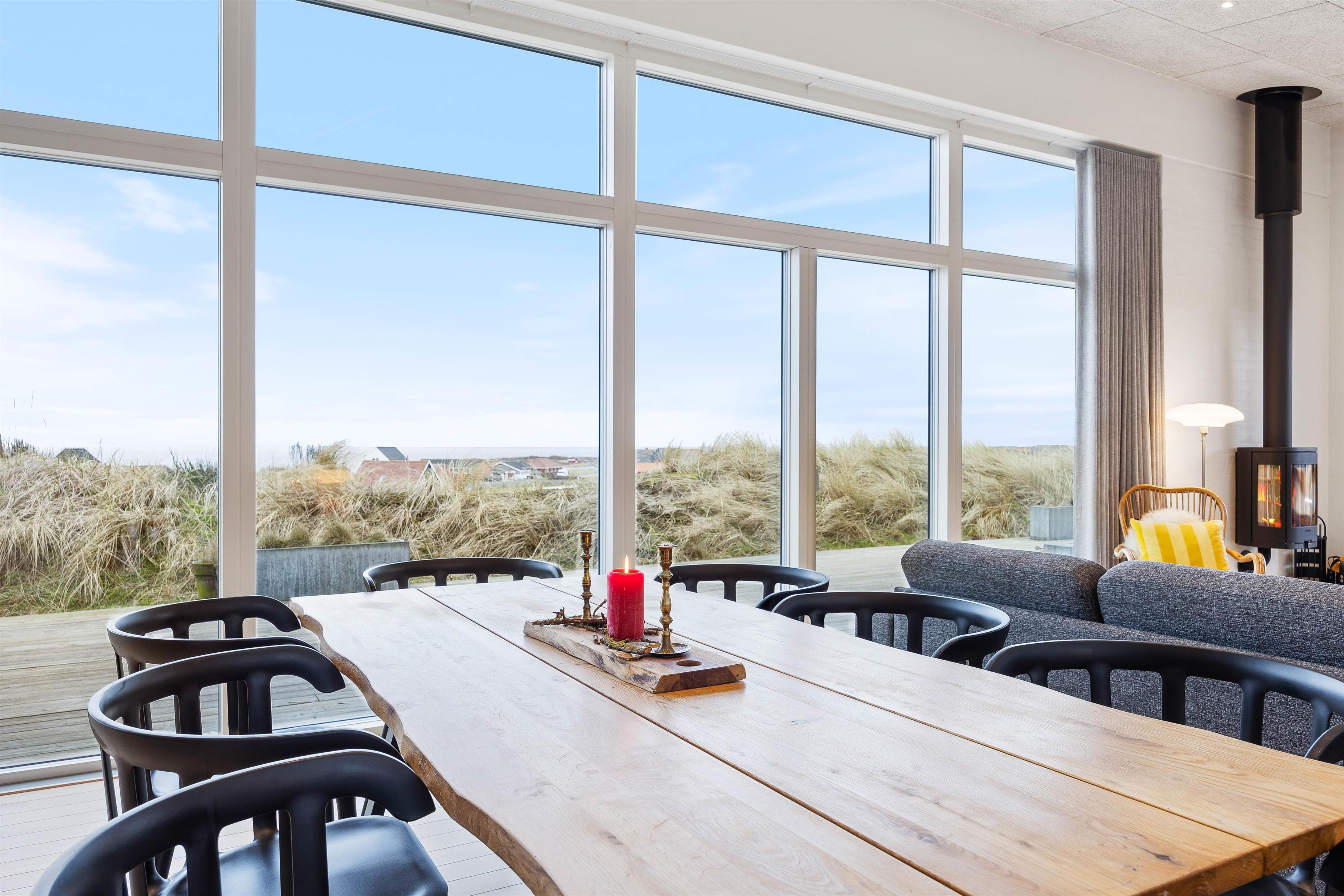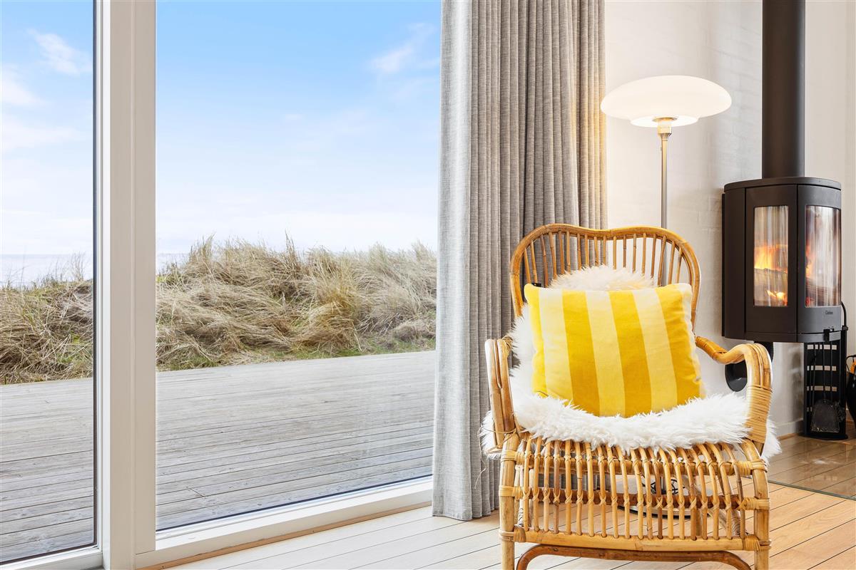 This distinctive holiday home enjoys a superb elevated position on a hill with beautiful views over Ringkøbing Fjord. The living area is bright and furnished in modern Scandinavian style, perfect for cosy evenings around the wood-burning stove. The kitchen's large glass frontage offers impressive views.