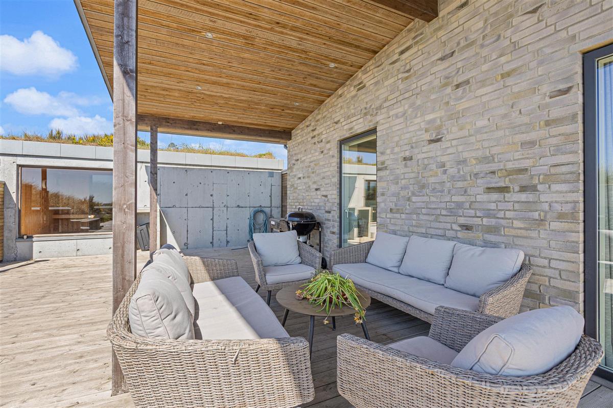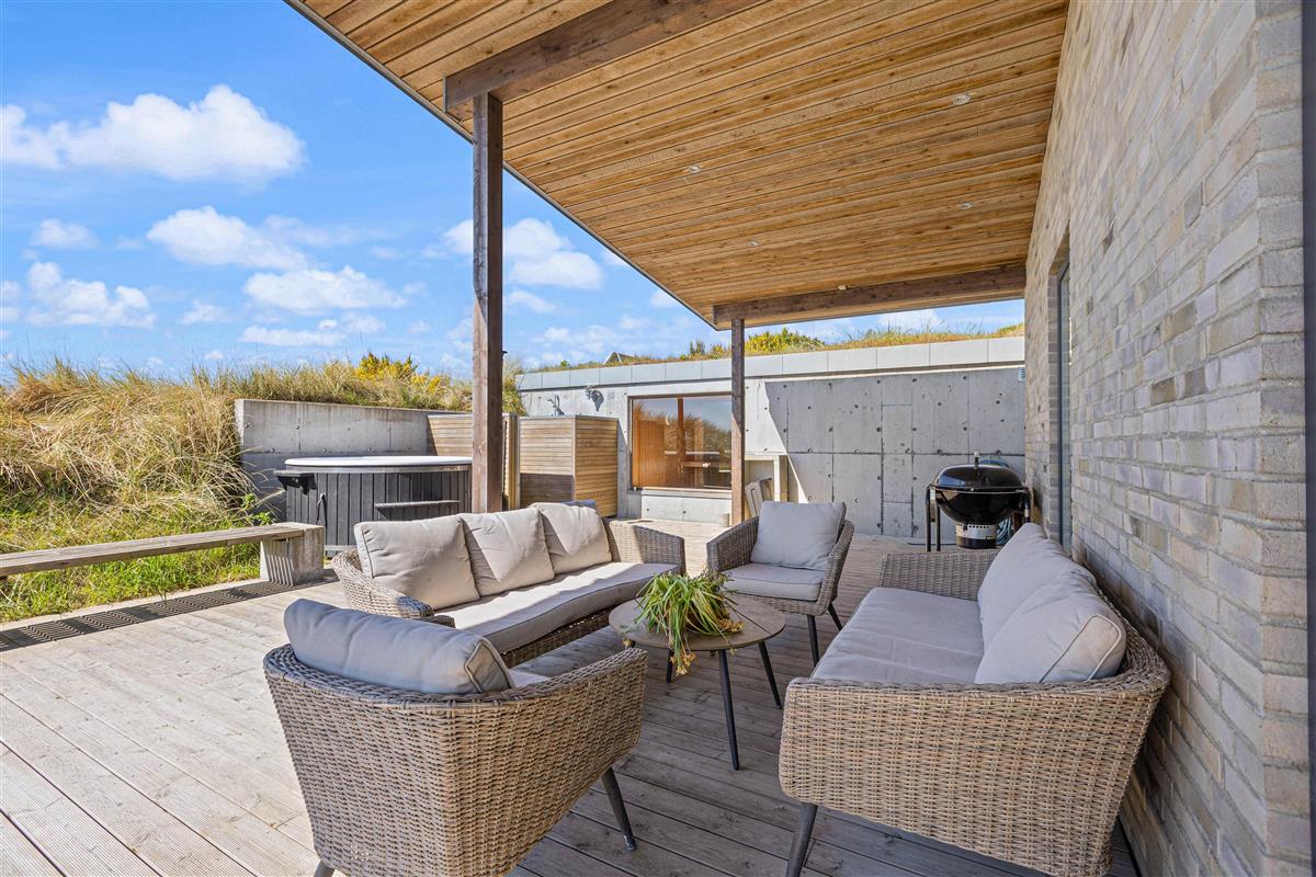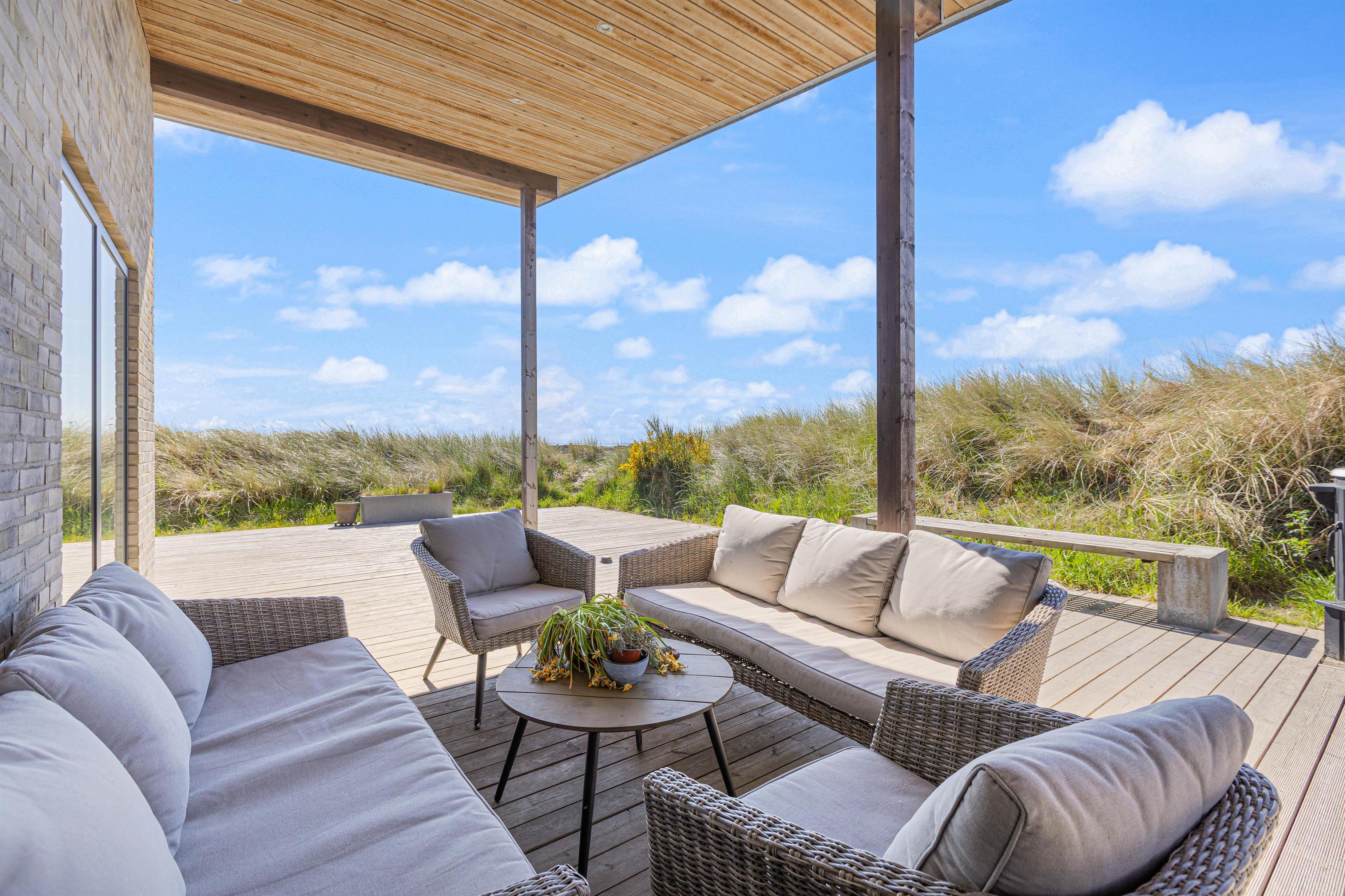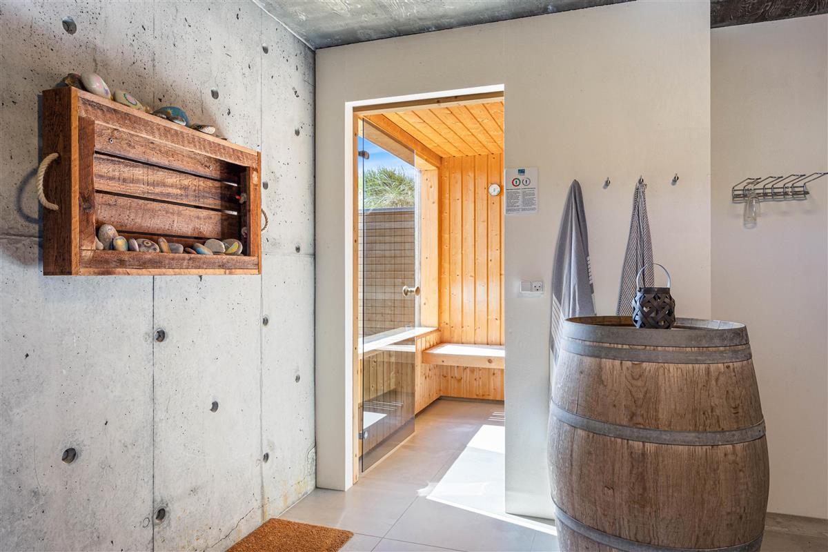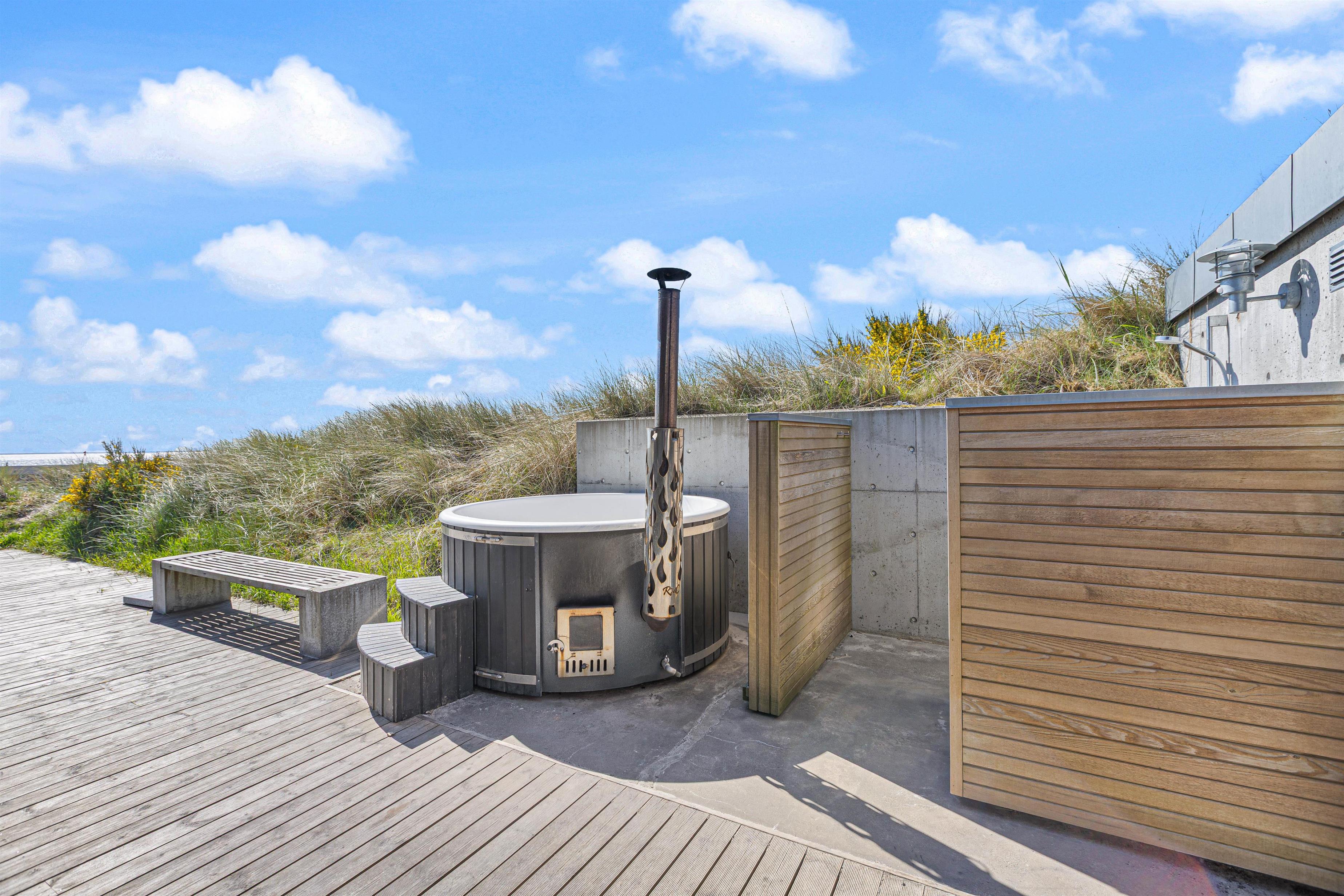 Everyone can find their favourite spot on the dune plot and spacious terrace, whether on a sun lounger, in the bathing barrel, or on garden chairs under the covered area. The terrace is perfect for long barbecue evenings, and for water enthusiasts who haven't had enough of the sea, there's a four-person bathing barrel ready for enjoying golden sunsets.
