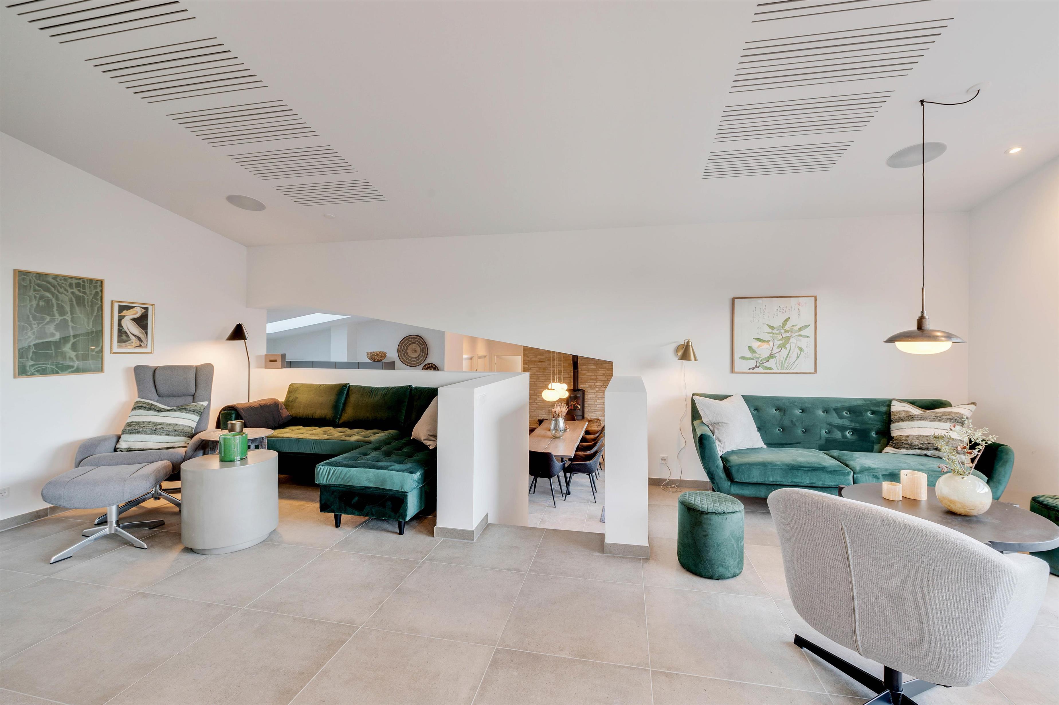 This luxury summer house not only features modern interior furnishings but also boasts exclusive outdoor facilities. The expansive terrace, which wraps around the house creating distinct areas, is fully enclosed and partially covered.