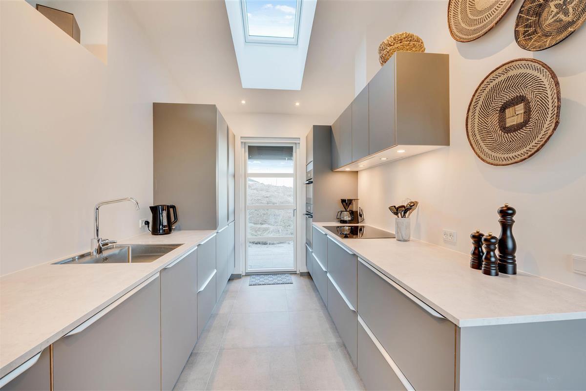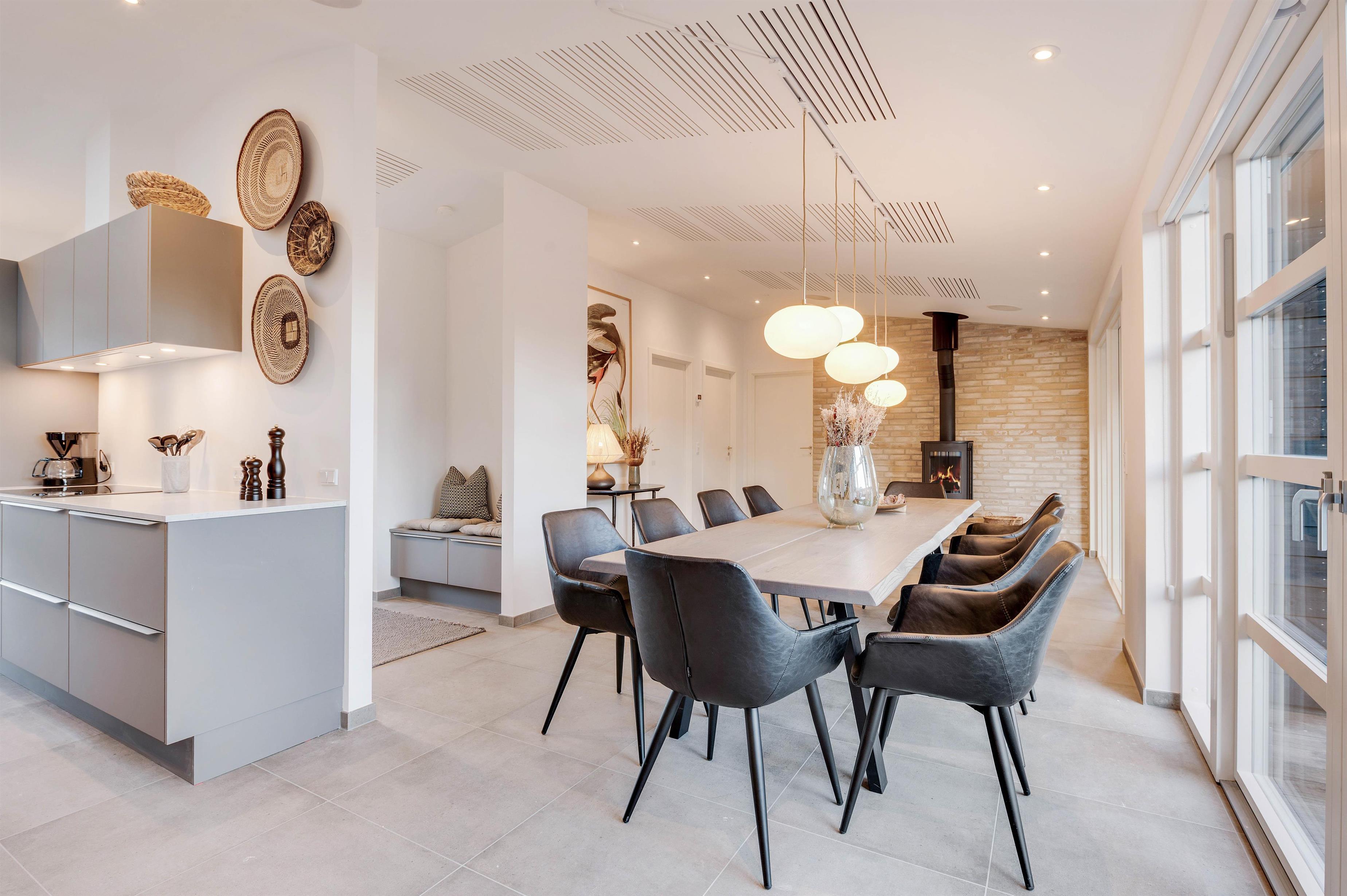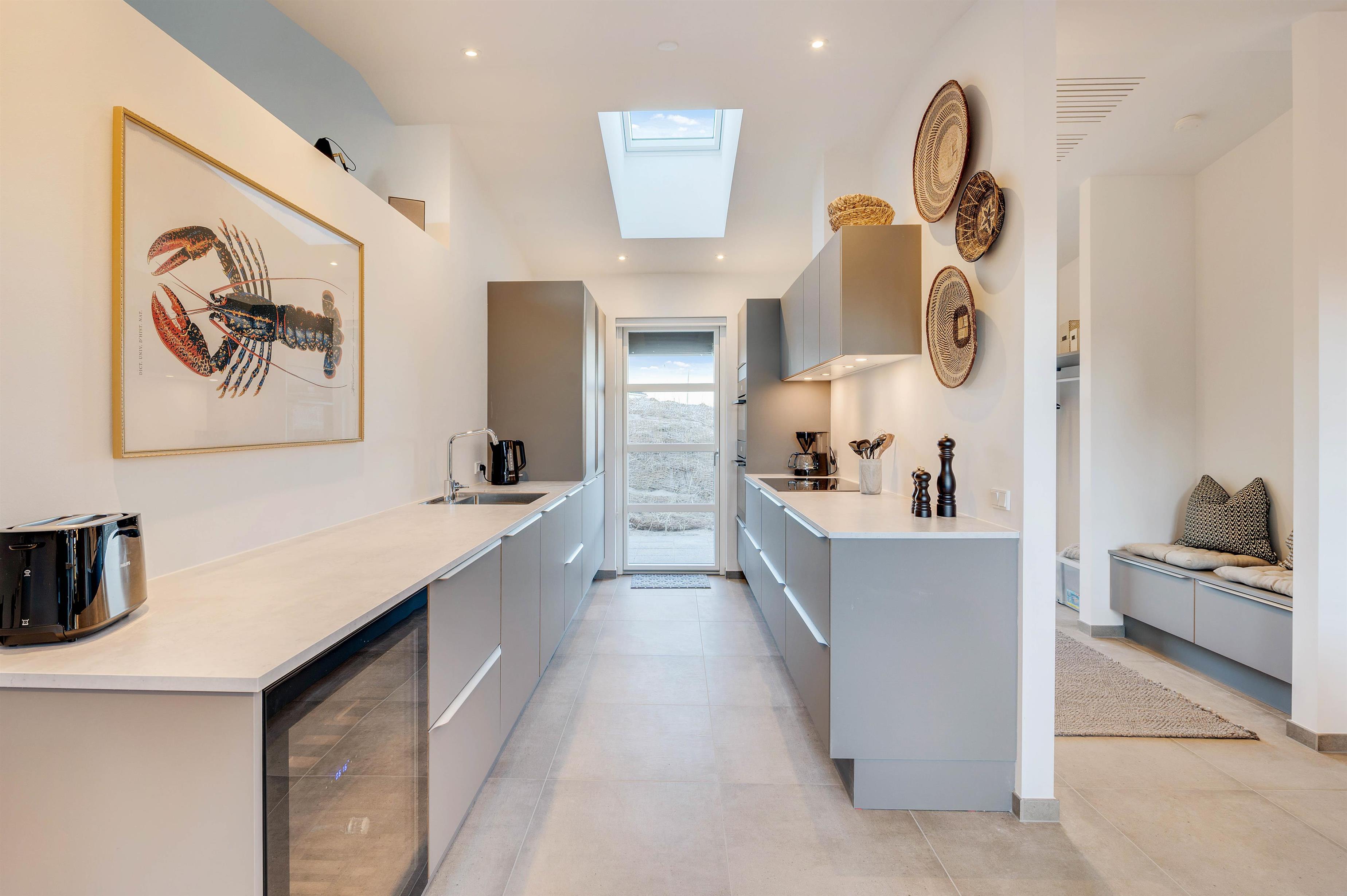 Nothing has been left to chance in this gem. The modern and stylish interior, crafted from high-quality materials, sets the perfect scene for your luxury holiday. The spacious and light-filled open-plan area combining kitchen, dining and living space invites many wonderful hours with family or friends - whether cooking together, enjoying comfortable evenings dining at the large table, or relaxing in the living area surrounded by the warmth of the wood-burning stove.