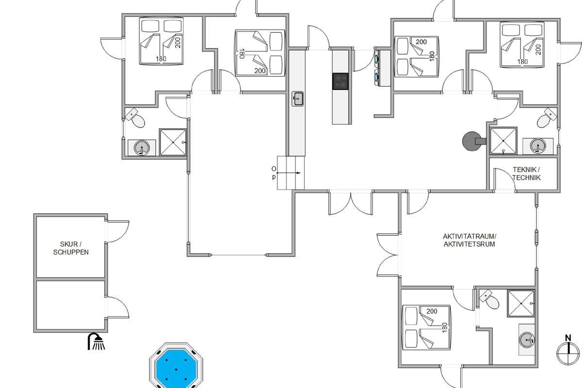 The holiday home at Tingodden 529 features five bedrooms, all equipped with double beds measuring 160cm x 200cm. Underfloor heating throughout the living areas and bedrooms ensures a consistently pleasant temperature. To avoid morning queues, the house has been built with three bathrooms - everything you need for a fantastic holiday with family or friends.