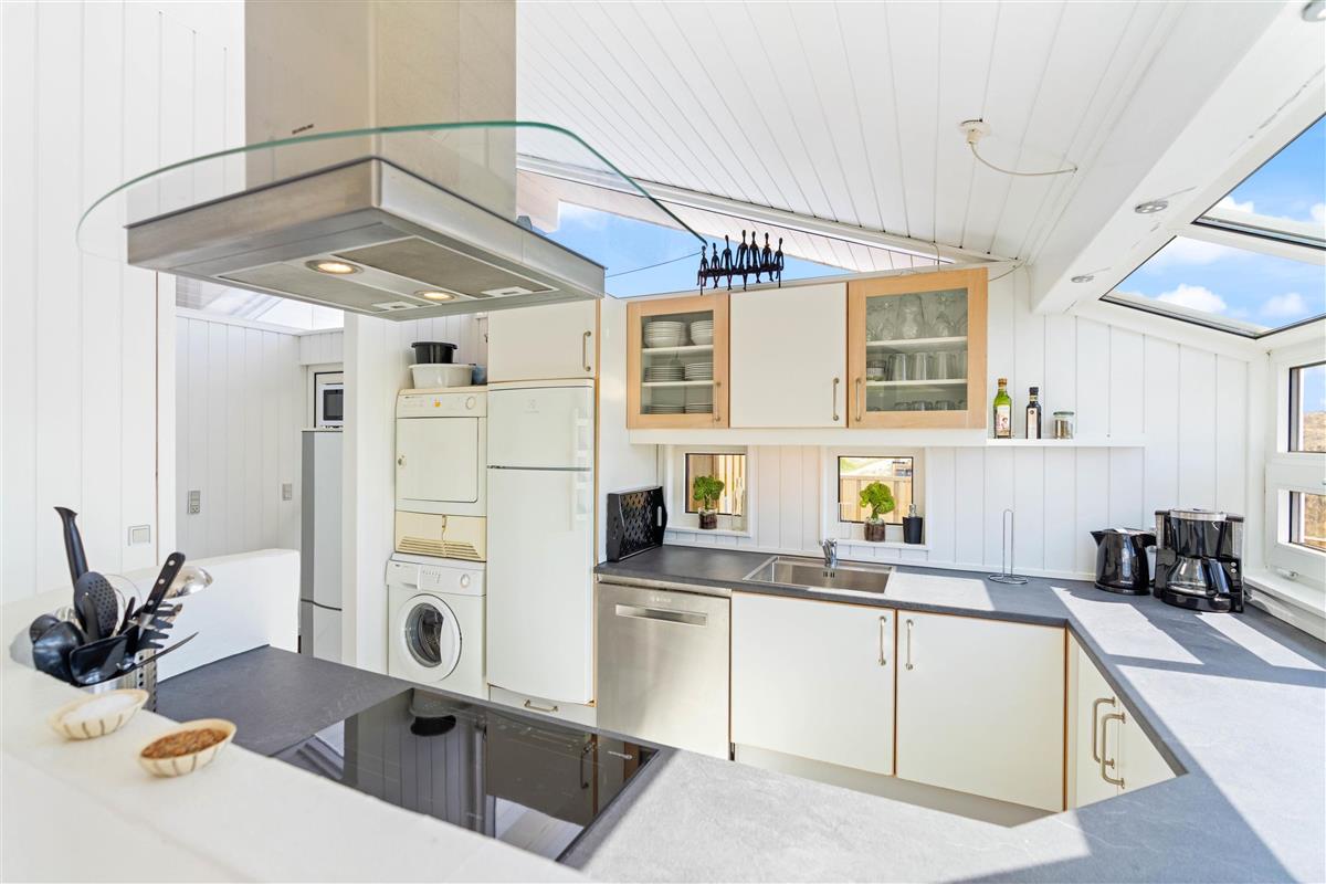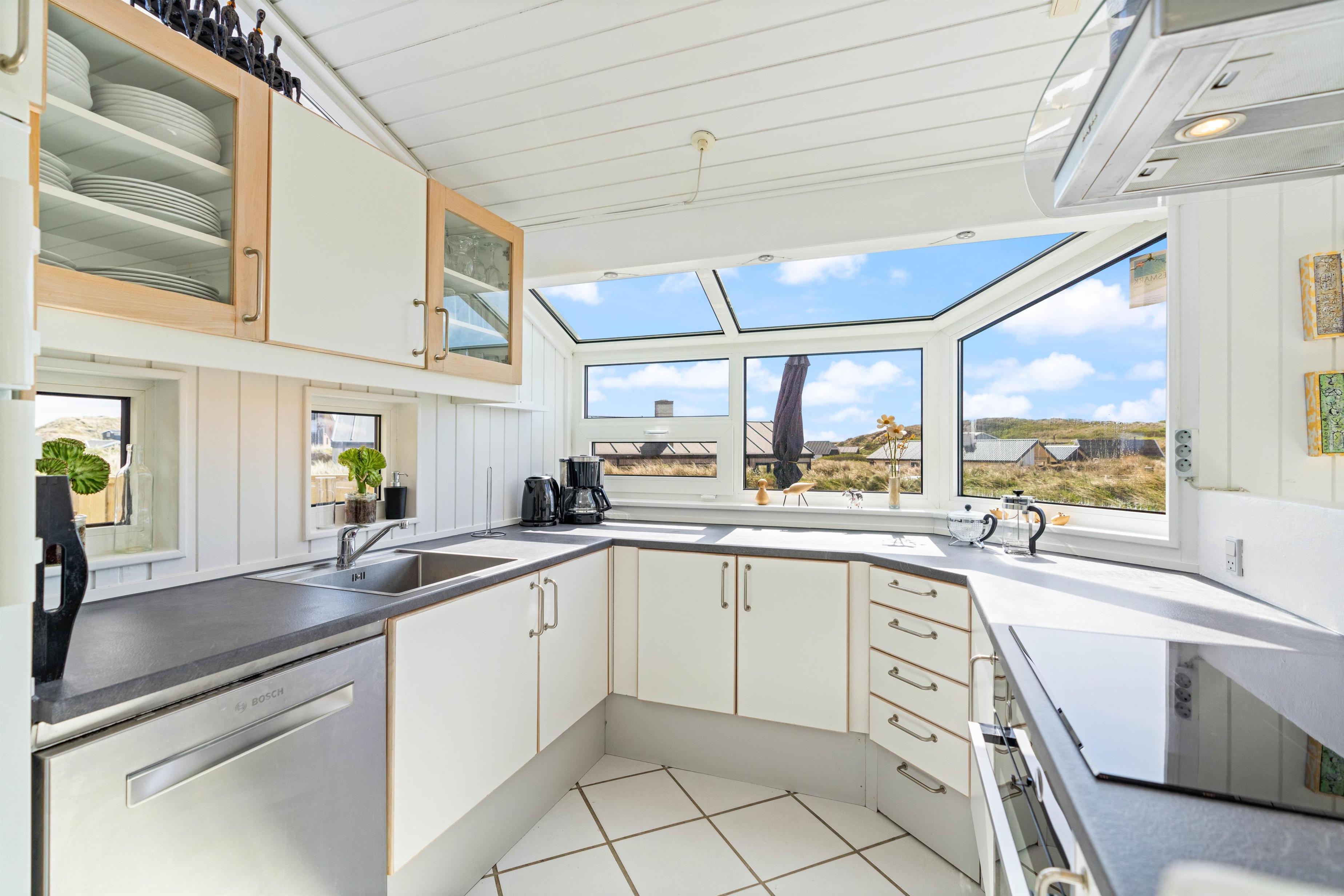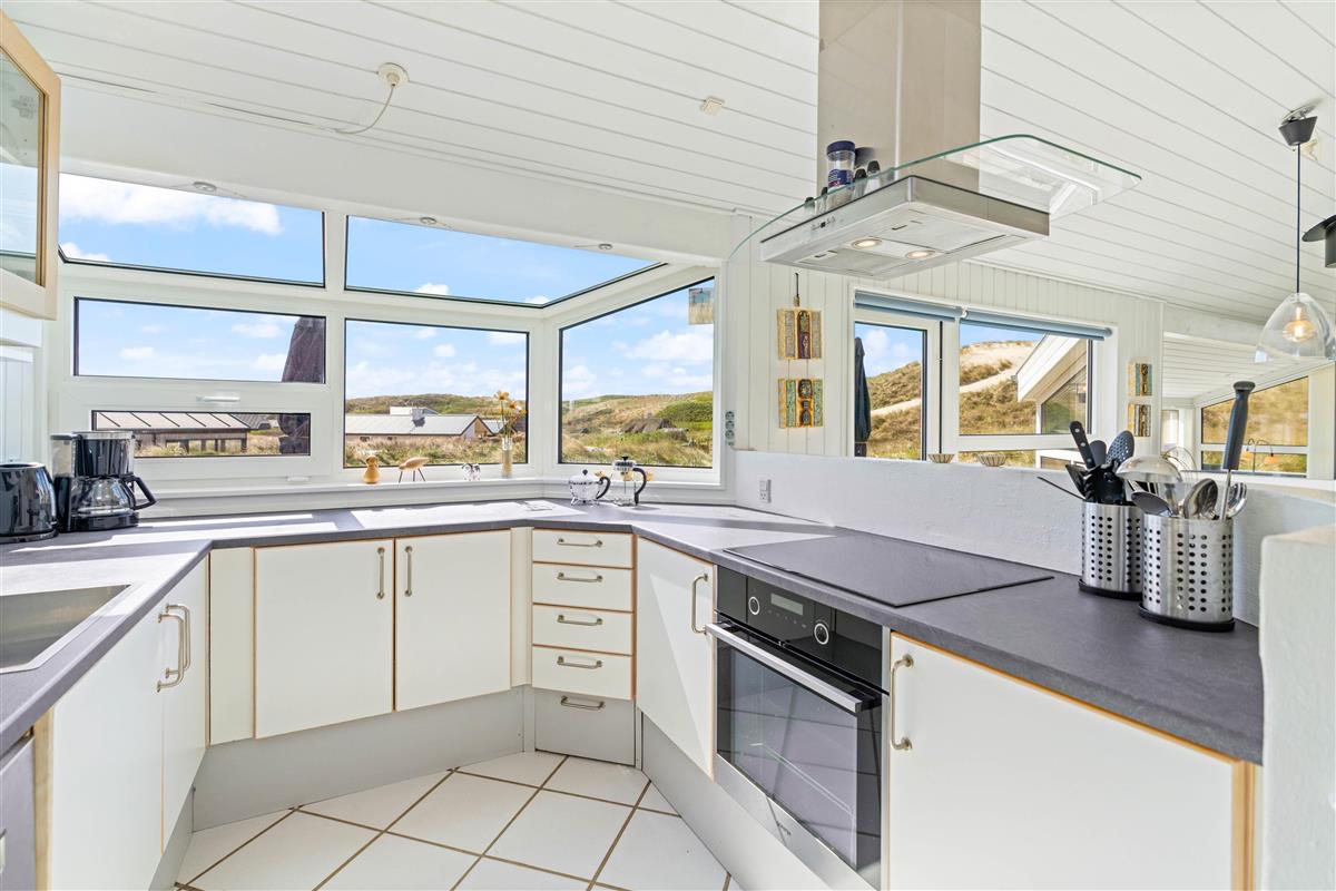 The house has two beautiful bathrooms, both with underfloor heating and shower enclosures. The main bathroom also features an excellent corner whirlpool and access to the sauna. The south-facing kitchen offers expansive views across the dune landscape.